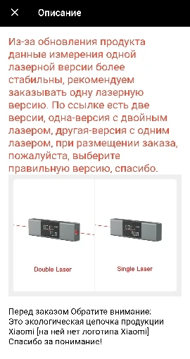 Из-за обновления продукта, данные измерений одной лазерной версии более стабильны, рекомендуем заказать одну лазерную версию. Есть две версии по ссылке, одна-двойная лазерная версия, одна-одна лазерная версия, когда вы размещаете заказ, пожалуйста, выберите правильную версию, спасибо.