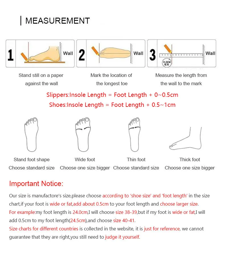 1. Наш размер соответствует размеру производителя, пожалуйста, выбирайте в соответствии с таблицей размеров «размер обуви» и «длина стопы», если у вас широкая или полная стопа, добавьте около 0,5 см к длине вашей стопы перед выбором.