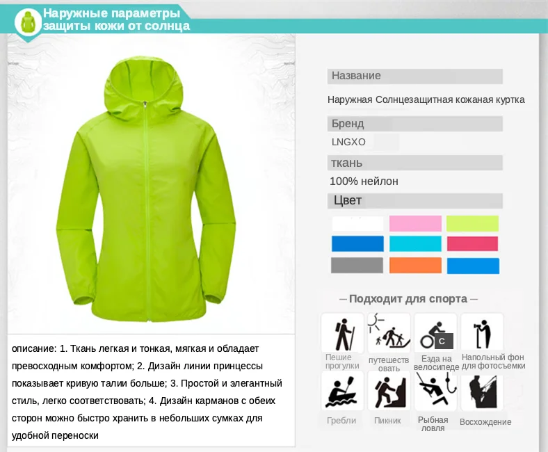 - Тип куртки для прогулок:Солнцезащитный