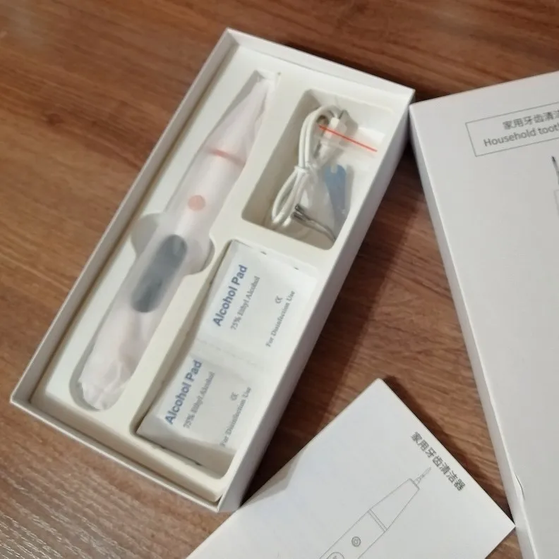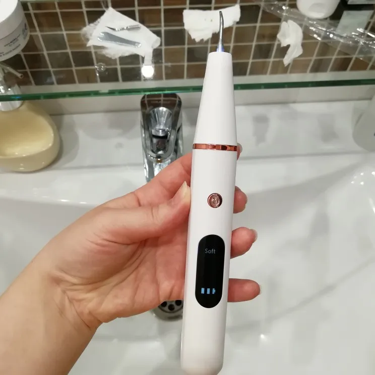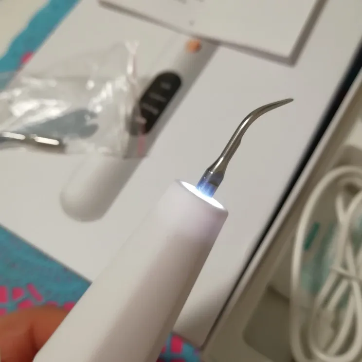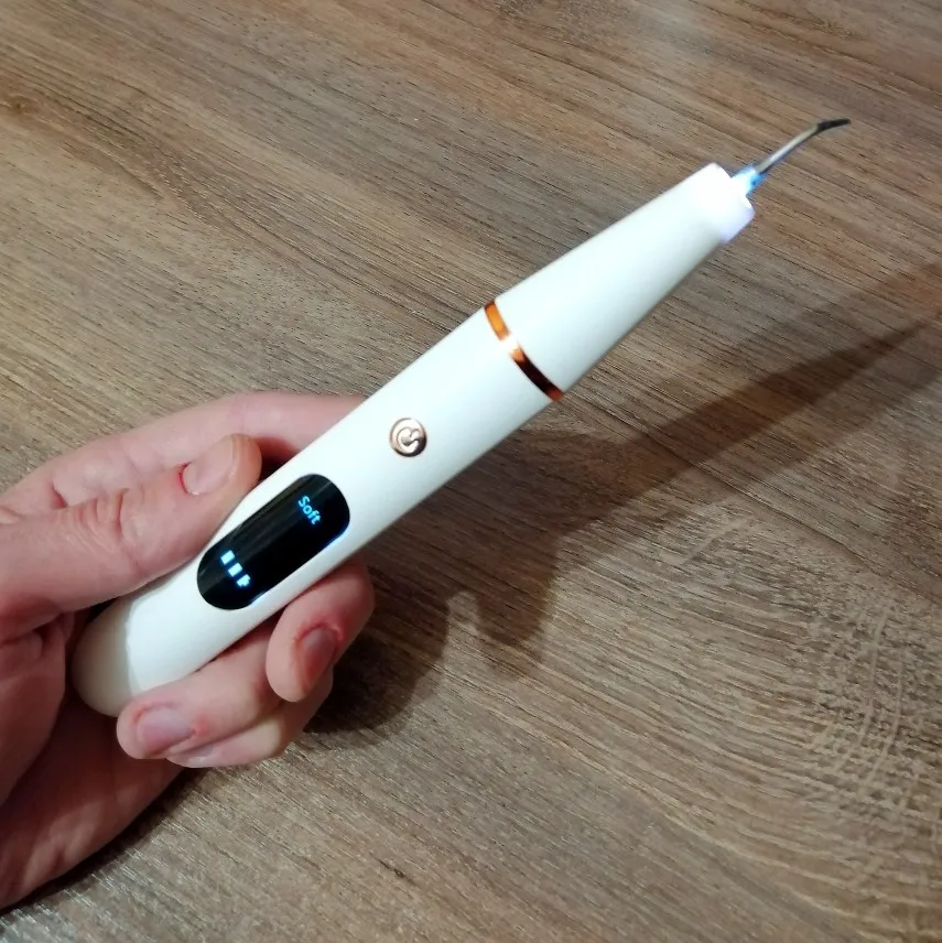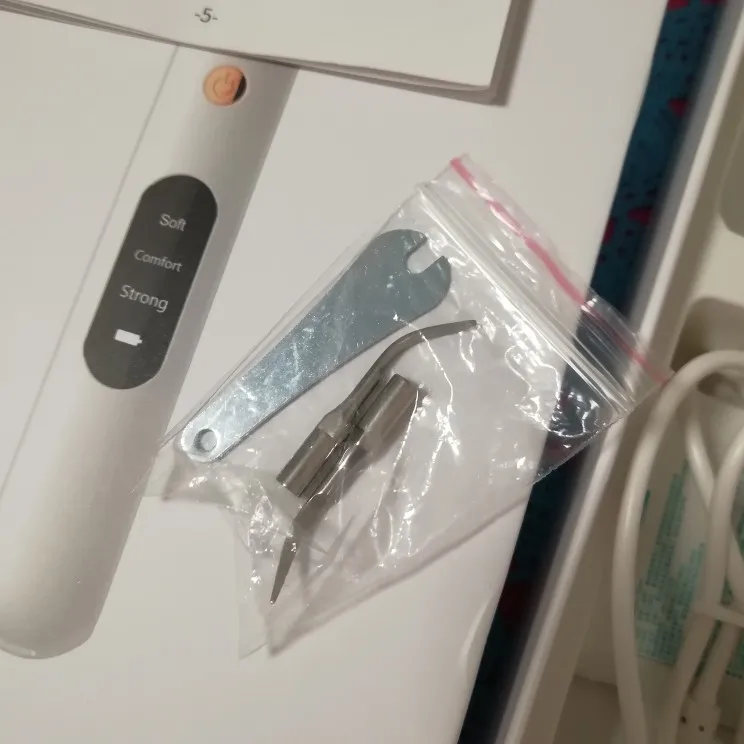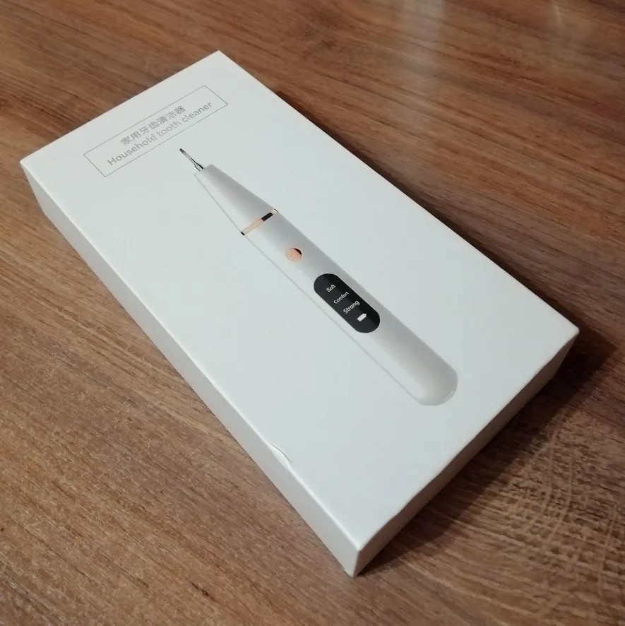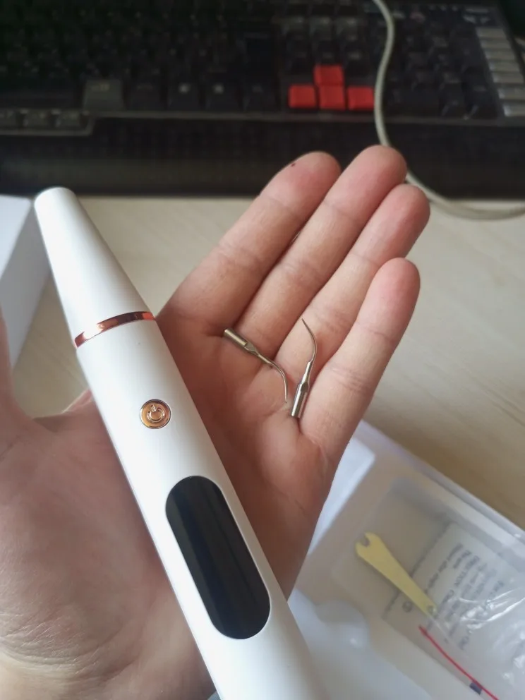 Брала полный комплект. Инструменты пришли в отдельном пакете - качество у них на высоте, металл хороший, тяжёлый, сделаны профессионально. Сам прибор прекрасно упакован, был полностью заряжен, что позволило сразу же его испробовать в деле. Включается долгим нажатием на кнопку пуск, при этом загорается подсветка. Режимы переключаются короткими нажатиями на ту же кнопку. На дисплее отображается уровень заряда и название режима soft(мягкий), comfort(понятно) и strong(сильный). Выбрала сразу последний режим, так как с начала пандемии не делала чистку. При работе головка слабо вибрирует, неприятных ощущений нет. По сравнению с профессиональной чисткой в стоматологии, видно что прибор не такой мощный, но при некоторой доли упорства и за несколько приёмов им вполне можно удалить даже существенные дефекты - камни и пятна на зубах. Скорее всего из-за более щадящего воздействия, он и не портит так эмаль. Мой вердикт - прибор работает, пригоден для домашнего применения.