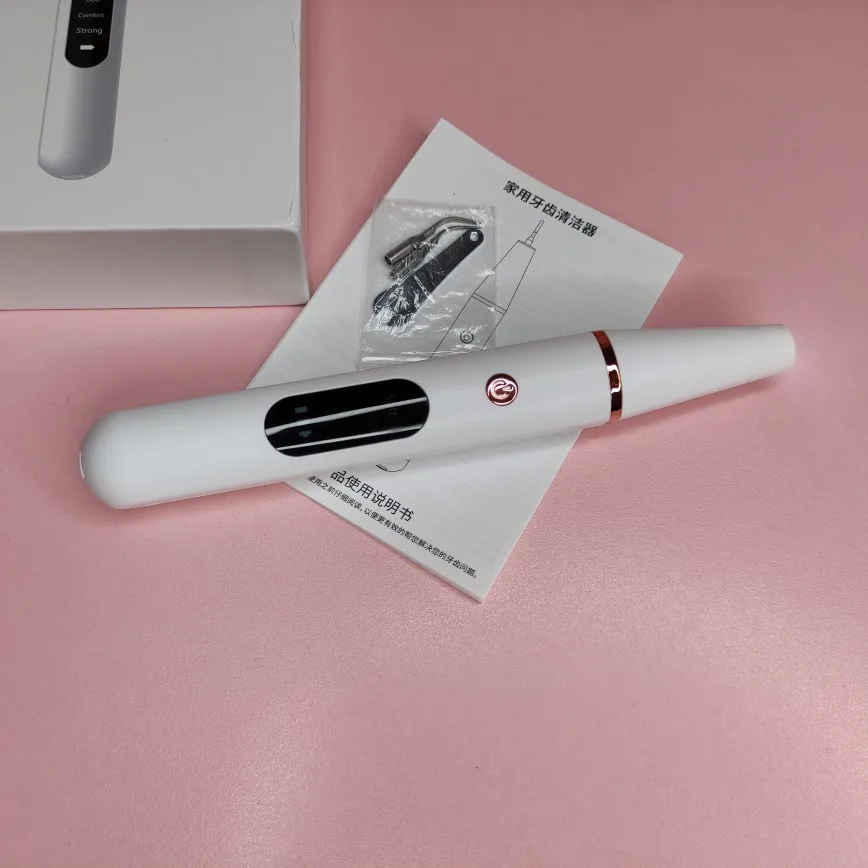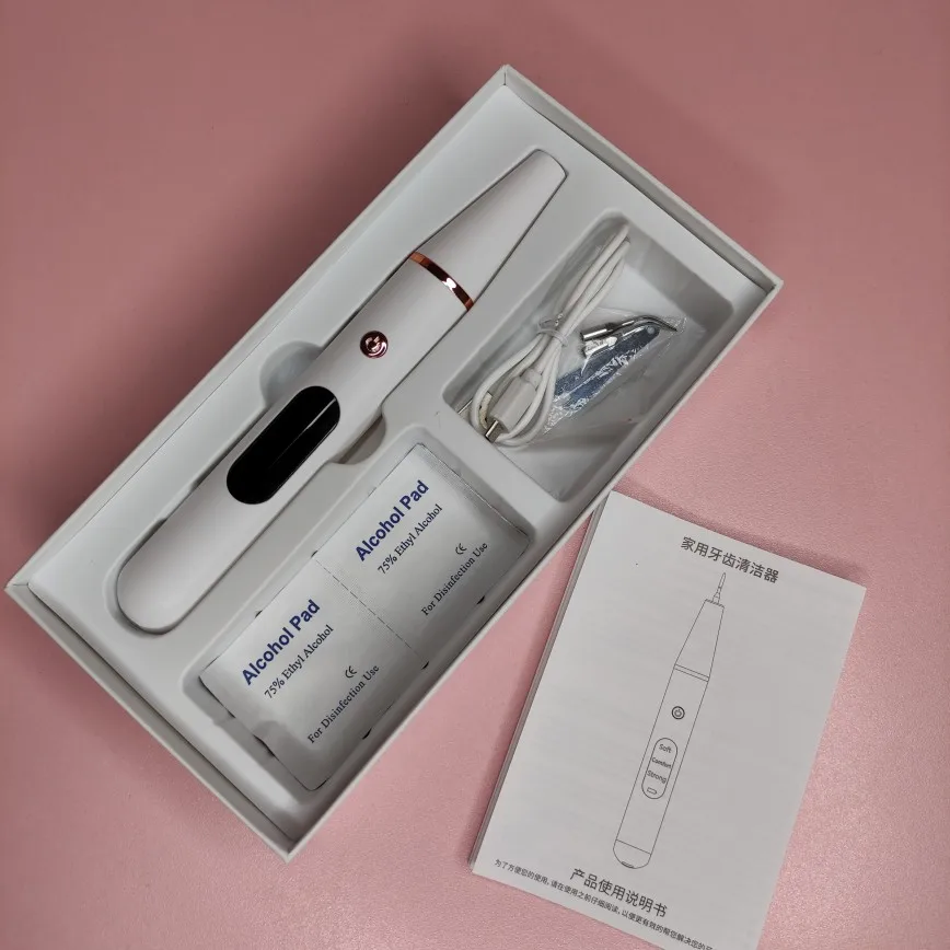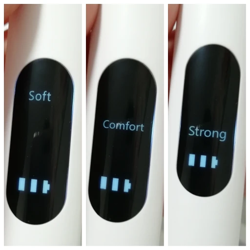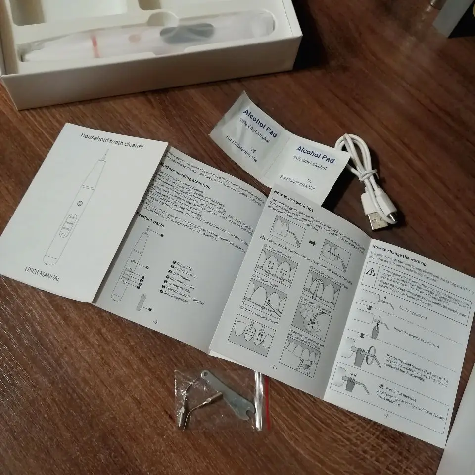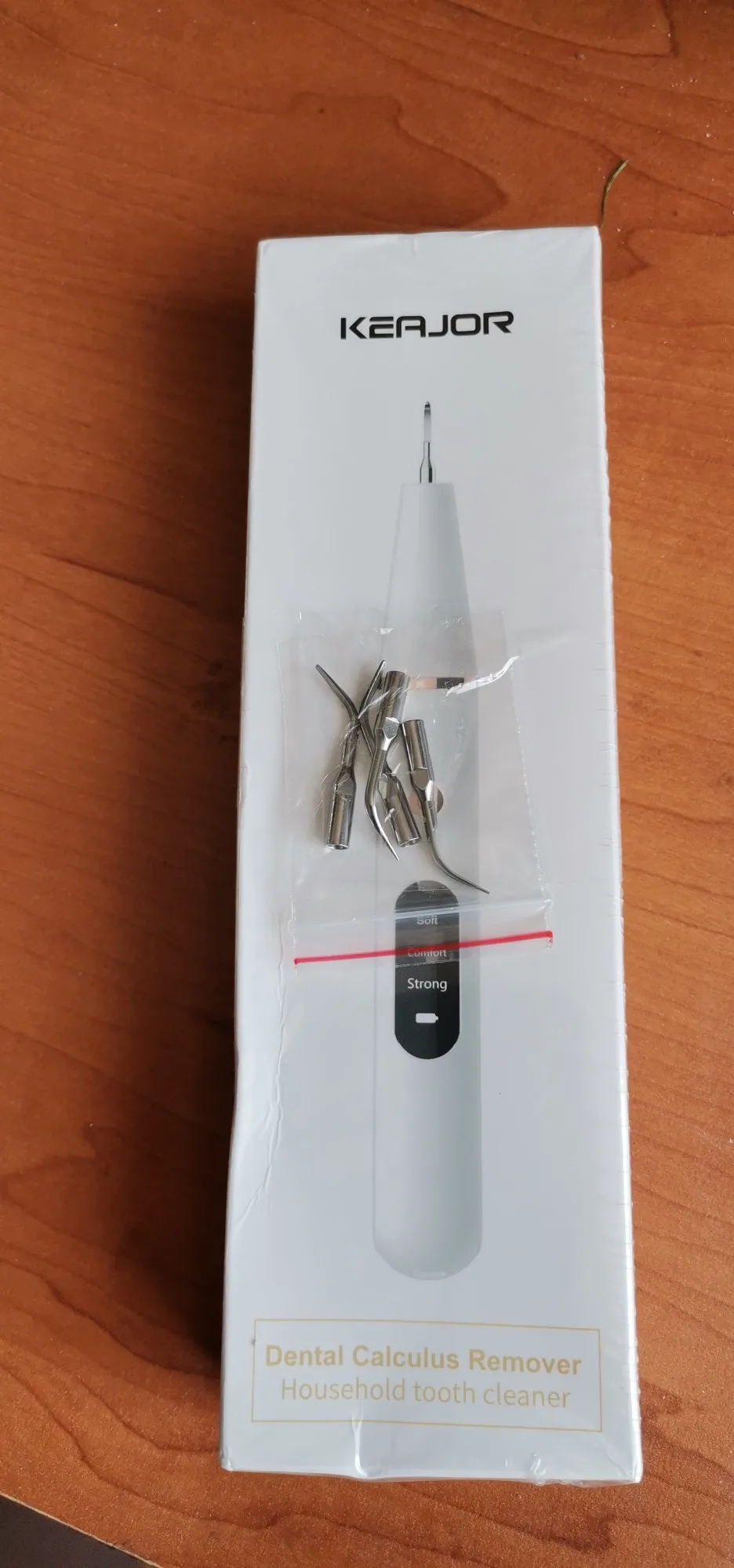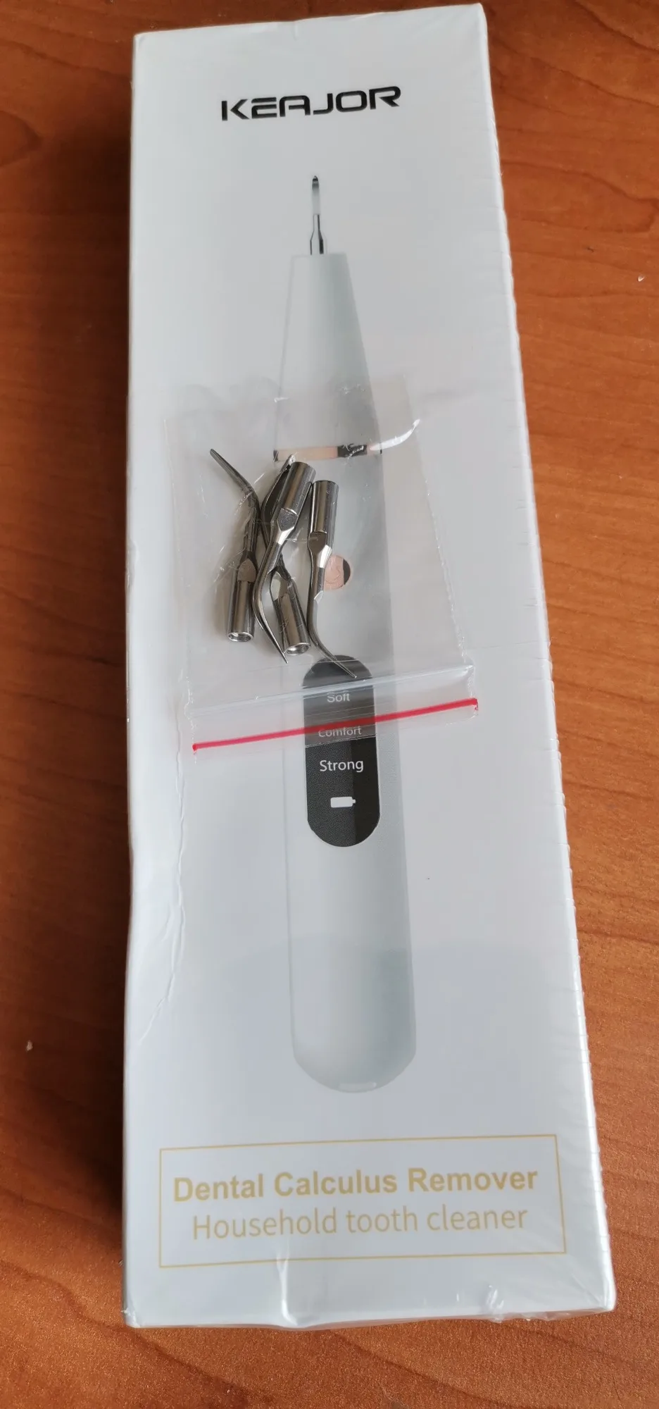 Брала полный комплект. Инструменты пришли в отдельном пакете - качество у них на высоте, металл хороший, тяжёлый, сделаны профессионально. Сам прибор прекрасно упакован, был полностью заряжен, что позволило сразу же его испробовать в деле. Включается долгим нажатием на кнопку пуск, при этом загорается подсветка. Режимы переключаются короткими нажатиями на ту же кнопку. На дисплее отображается уровень заряда и название режима soft(мягкий), comfort(понятно) и strong(сильный). Выбрала сразу последний режим, так как с начала пандемии не делала чистку. При работе головка слабо вибрирует, неприятных ощущений нет. По сравнению с профессиональной чисткой в стоматологии, видно что прибор не такой мощный, но при некоторой доли упорства и за несколько приёмов им вполне можно удалить даже существенные дефекты - камни и пятна на зубах. Скорее всего из-за более щадящего воздействия, он и не портит так эмаль. Мой вердикт - прибор работает, пригоден для домашнего применения.