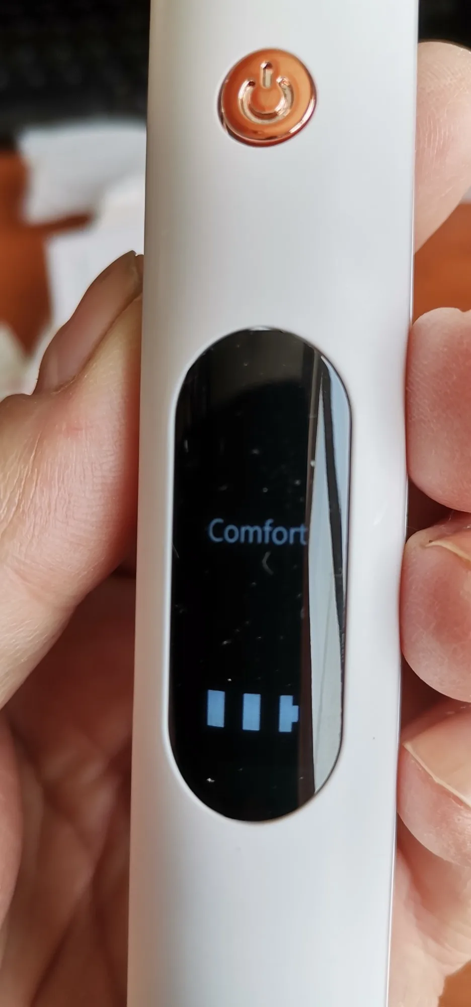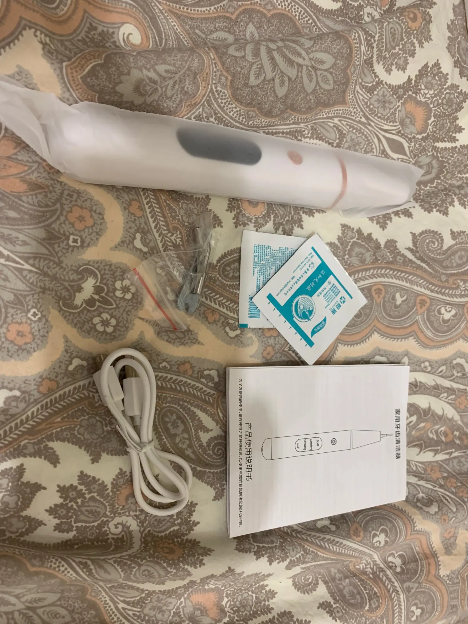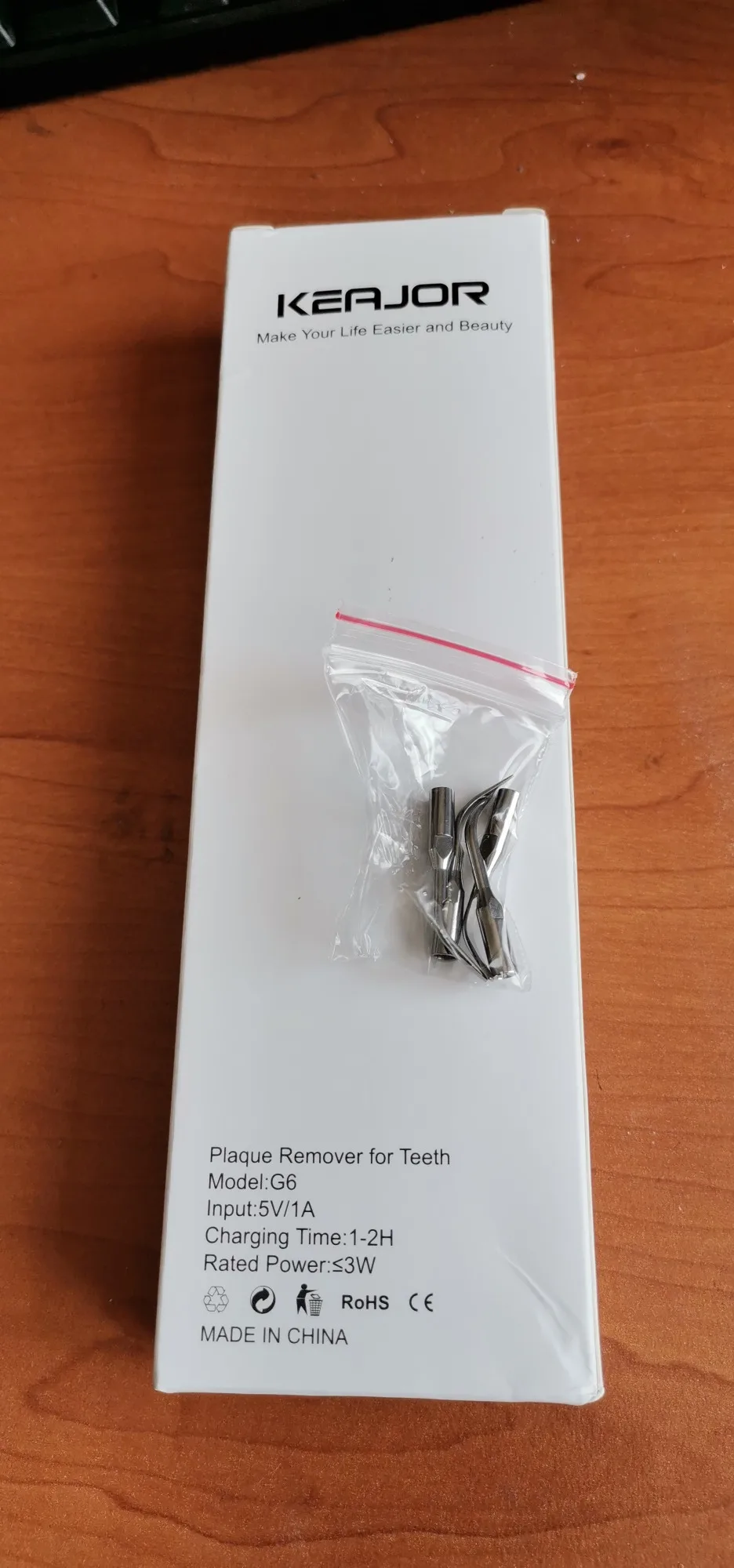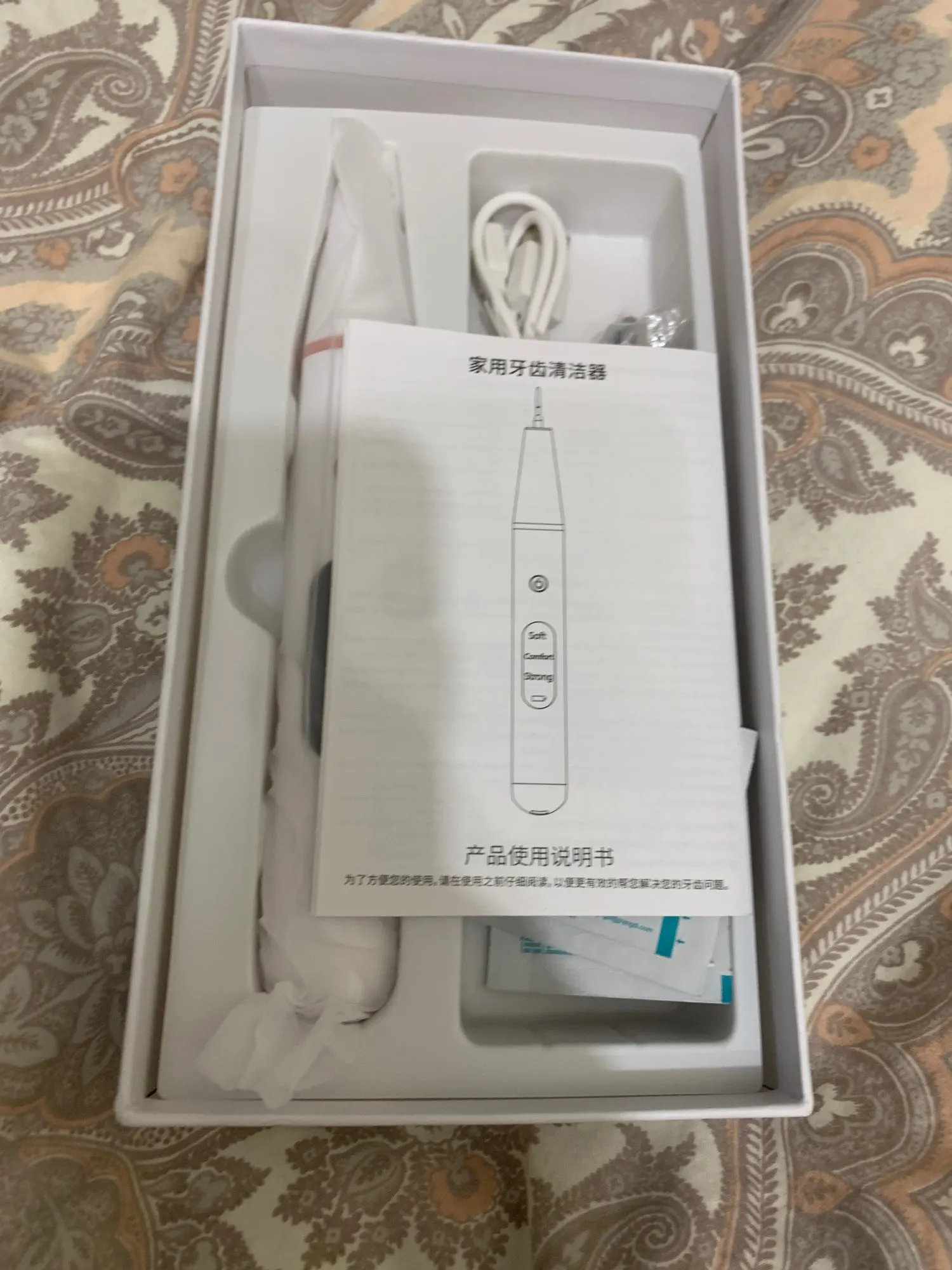 Брала полный комплект. Инструменты пришли в отдельном пакете - качество у них на высоте, металл хороший, тяжёлый, сделаны профессионально. Сам прибор прекрасно упакован, был полностью заряжен, что позволило сразу же его испробовать в деле. Включается долгим нажатием на кнопку пуск, при этом загорается подсветка. Режимы переключаются короткими нажатиями на ту же кнопку. На дисплее отображается уровень заряда и название режима soft(мягкий), comfort(понятно) и strong(сильный). Выбрала сразу последний режим, так как с начала пандемии не делала чистку. При работе головка слабо вибрирует, неприятных ощущений нет. По сравнению с профессиональной чисткой в стоматологии, видно что прибор не такой мощный, но при некоторой доли упорства и за несколько приёмов им вполне можно удалить даже существенные дефекты - камни и пятна на зубах. Скорее всего из-за более щадящего воздействия, он и не портит так эмаль. Мой вердикт - прибор работает, пригоден для домашнего применения.