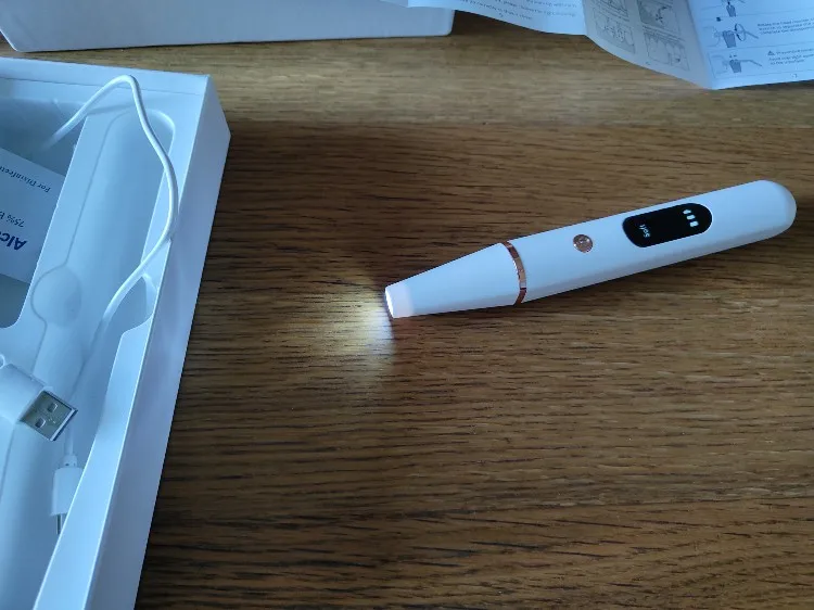 Такая классная штука, реально работает! До последнего не верила, но она отлично убирает камень и налёт от кофе и никотина! На фото первая проба и то хорошо видна разница. Я не знаю, как это работает, но когда касается кожи, то ничего не происходит, словно не работает, а вот по зубам слегка вибрирует и издаёт очень неприятный звук, я аж испугалась. При этом нет никаких болевых ощущений, всё комфортно. В комплекте 2 насадки, вкручиваются и фиксируются специальным ключом. Есть подсветка. Три режима мощности. Мне не повезло и был брак индикатора батарии, он просто в полоску и не показывает уровень заряда. Но на функционал это не влияет, так что спор не открывала. Доставка до Москвы около недели в пастомат. Спасибо :)