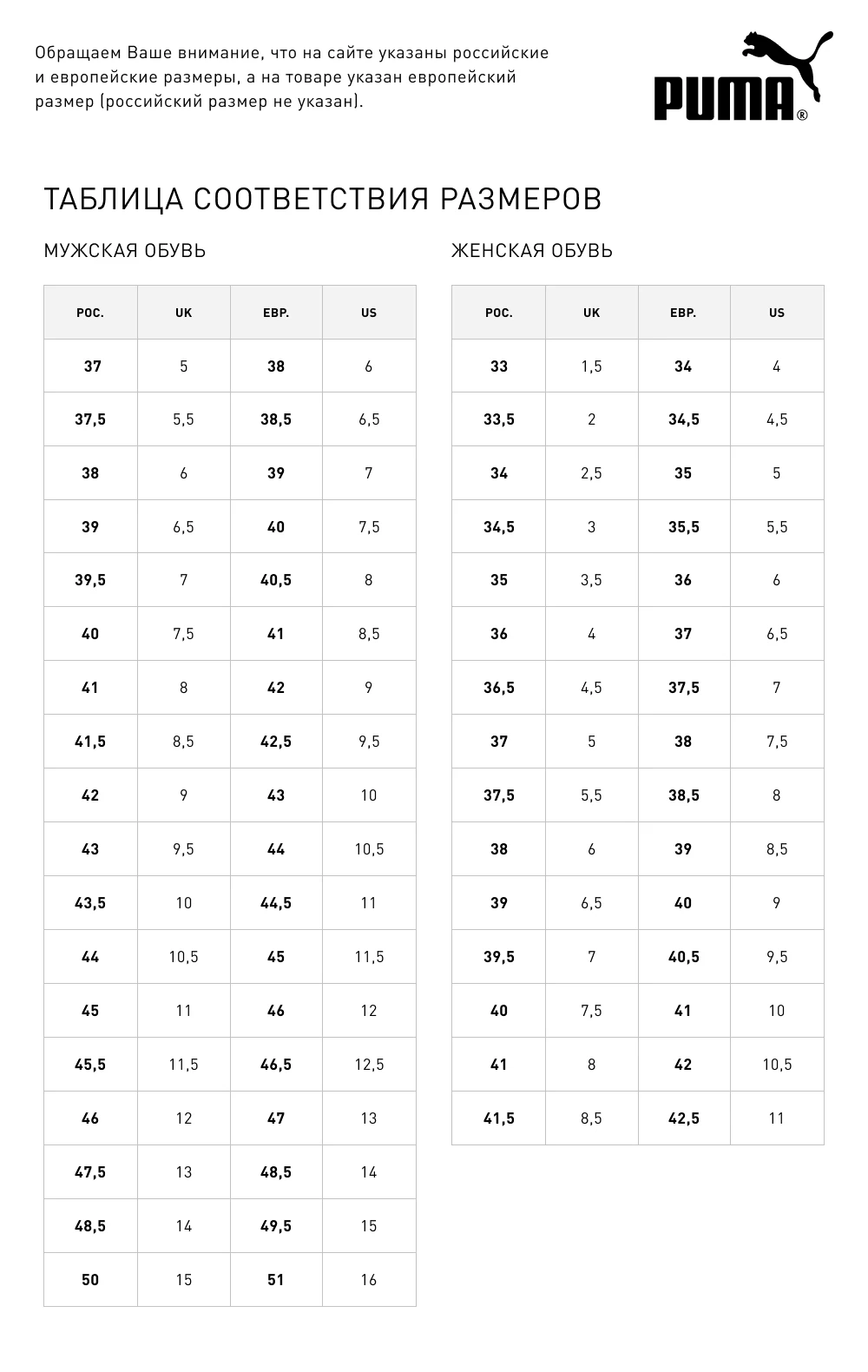| Размер | 35.5 EUR (34.5 RUS) | 36 EUR (35 RUS) | 37 EUR (36 RUS) | 37.5 EUR (36.5 RUS) | 38 EUR (37 RUS) | 38.5 EUR (37.5 RUS) | 39 EUR (38 RUS) | 40 EUR (39 RUS) | 40.5 EUR (39.5 RUS) | 41 EUR (40 RUS) | 42 EUR (41 RUS) | 42.5 EUR (41.5 RUS) | 43 EUR (42 RUS) | 44 EUR (43 RUS) | 44.5 EUR (43.5 RUS) | 45 EUR (44 RUS) | 46 EUR (45 RUS) | 47 EUR (46 RUS) | 48.5 EUR (47.5 RUS) |