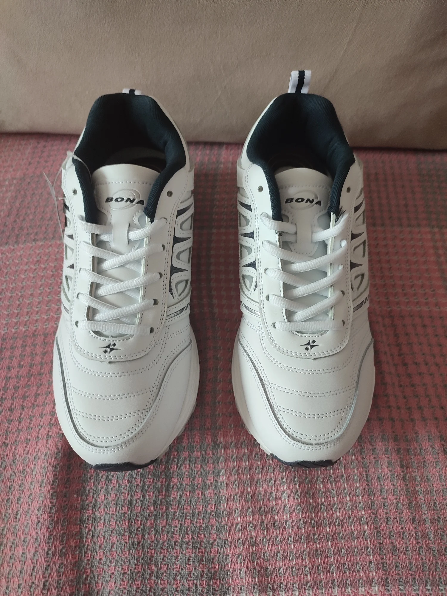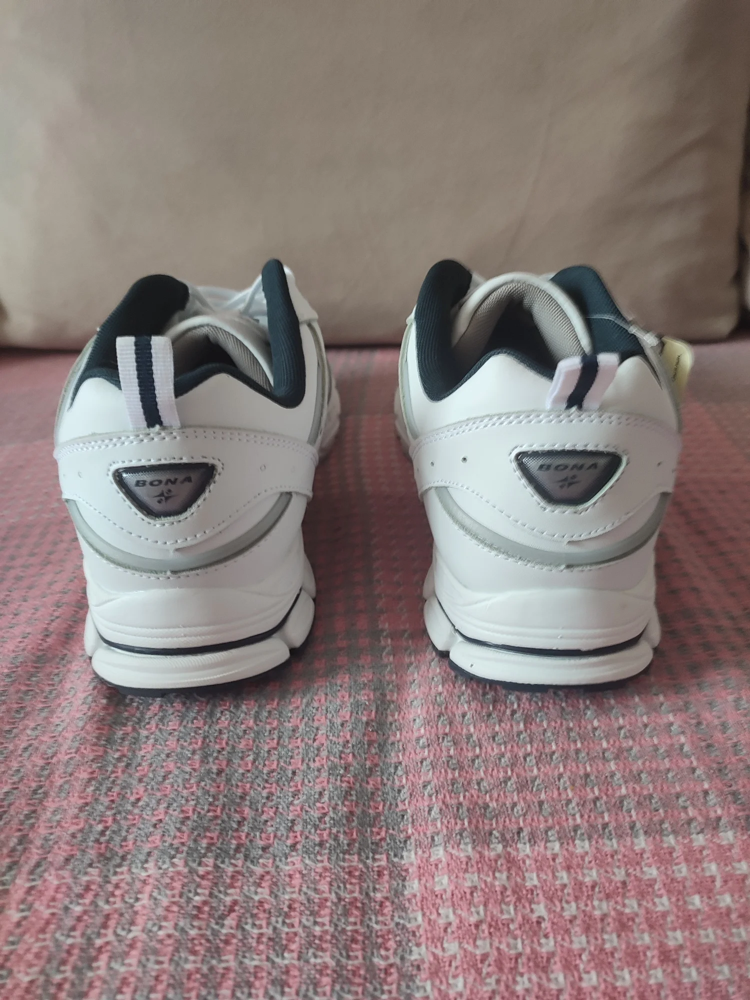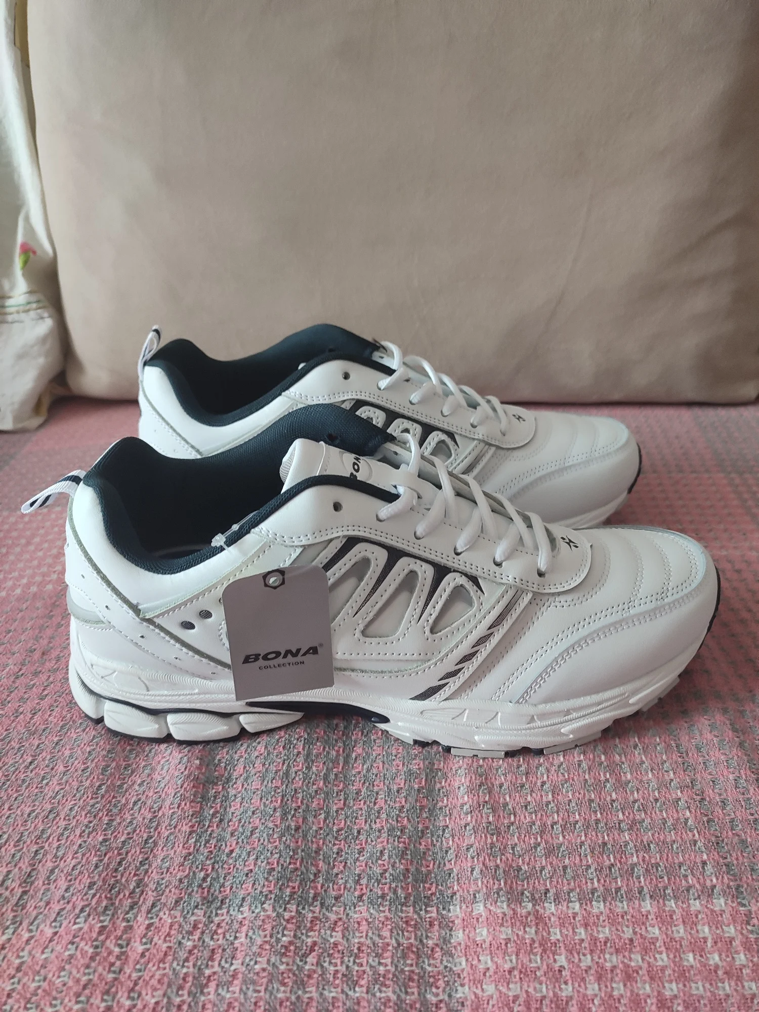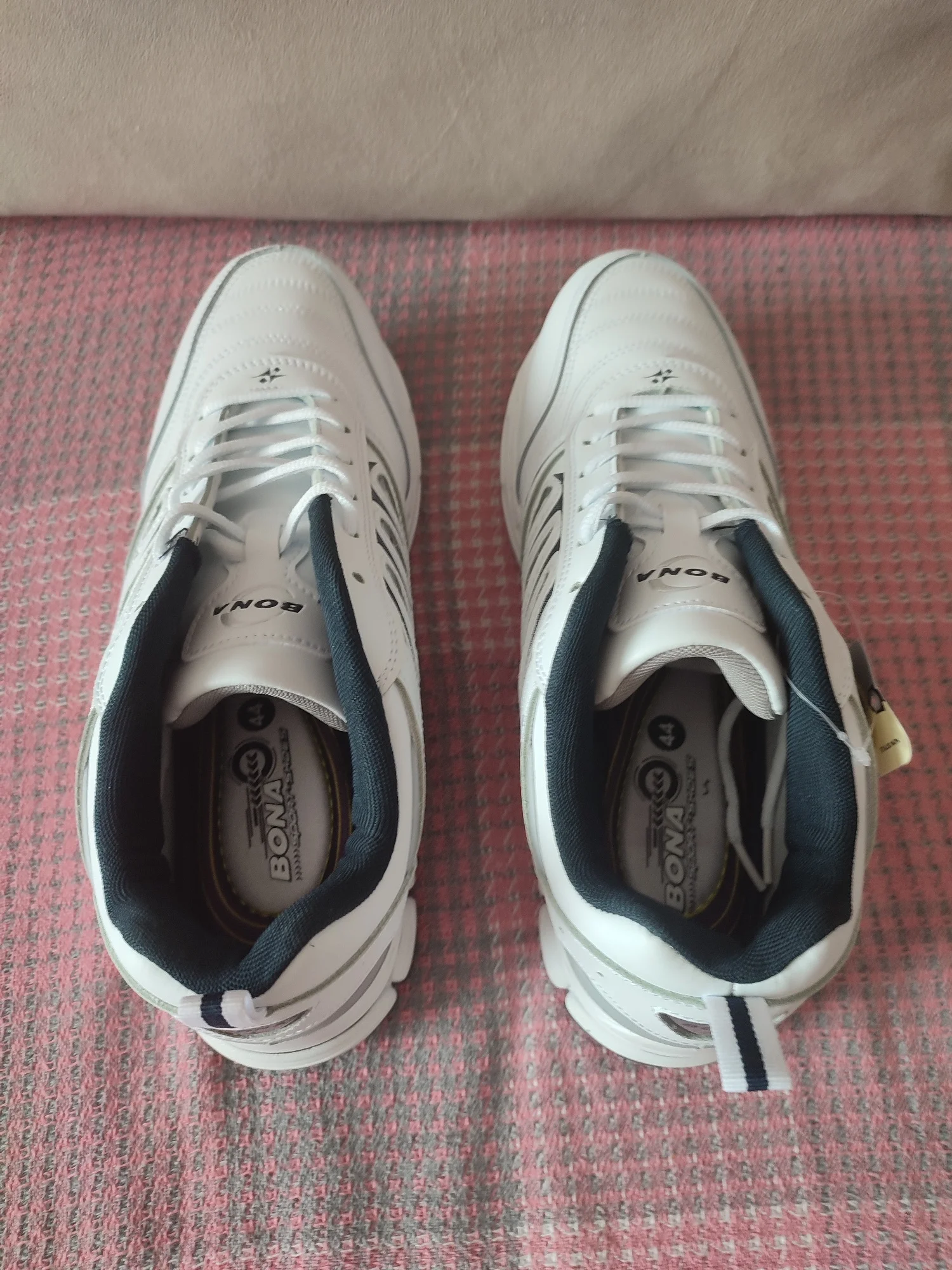 Кроссы БОНА, вроде бы все в норме, целые, на языке немного нитки торчат, а вообщем норм, подошли нормально, плотные, клея сильно так не видно, посмотрю сколько выходят, в подарок наверное положили фирменный пакет. Заказывал раньше кроссовки БОНА похожие, только по форме и цвету немного другие и у другого продавца, года два ношу, не каждый день, но пока всё устраивает, как новые, надеюсь и эти не подведут. Рекомендую