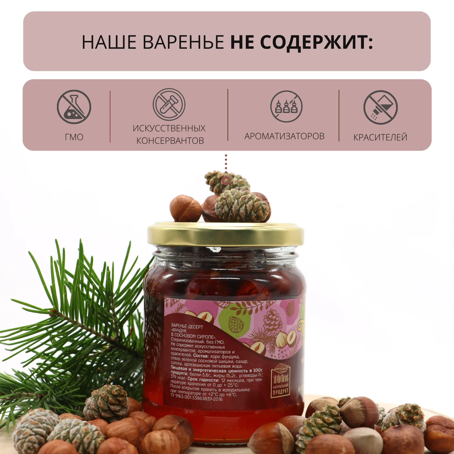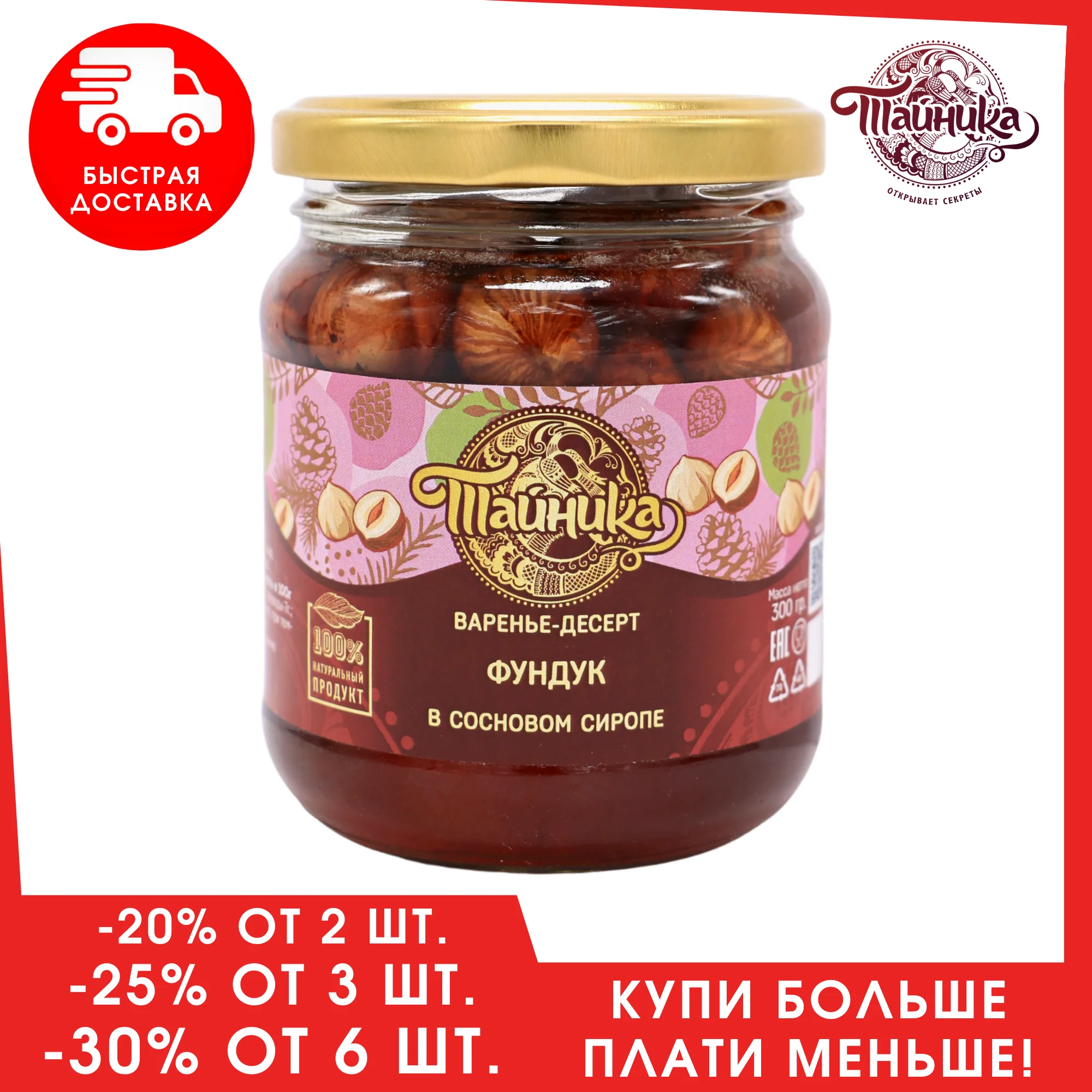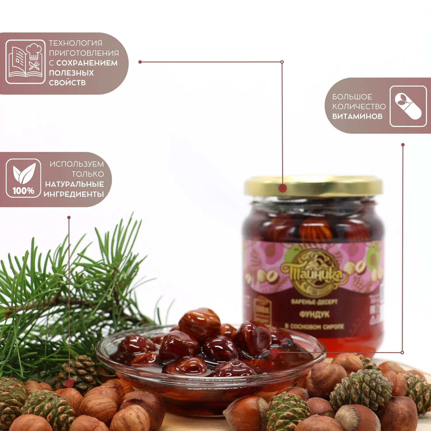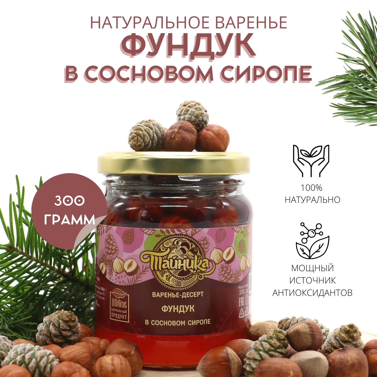Варенье-Десерт "Фундук" в сиропе из сосновых шишек натуральное органическое, 300 грамм / Тайника