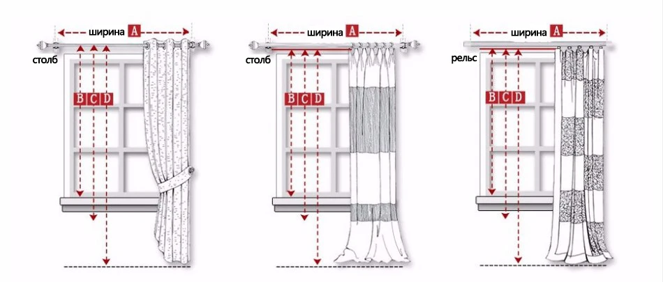 2. Длина штор = B / C / D (до высоты вашего окна).