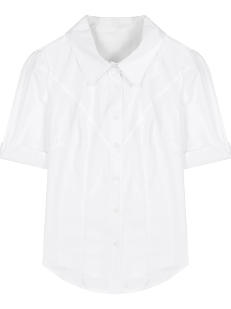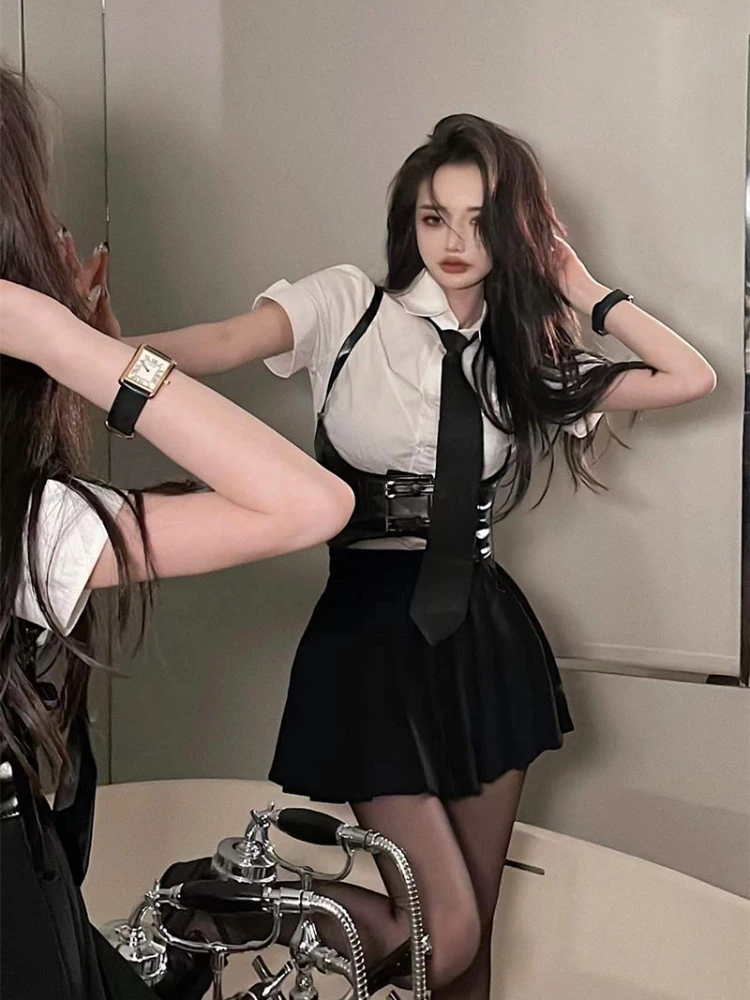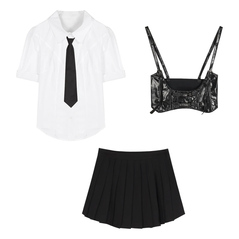 Белая рубашка + жилет из ПУ кожи + плиссированная мини-юбка с коротким рукавом