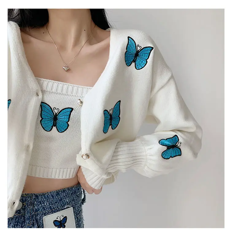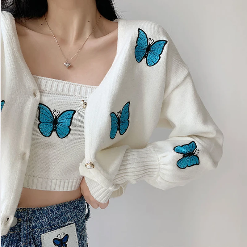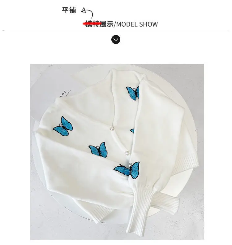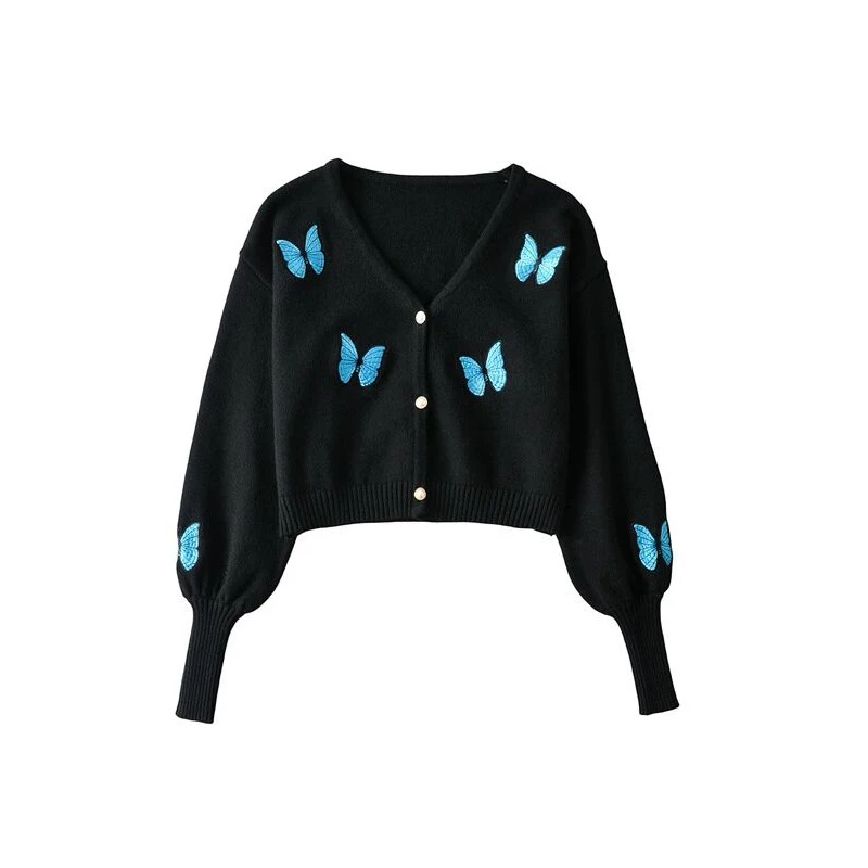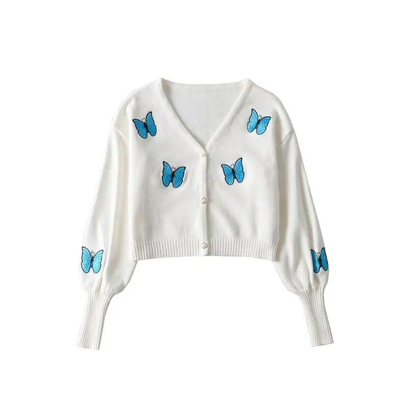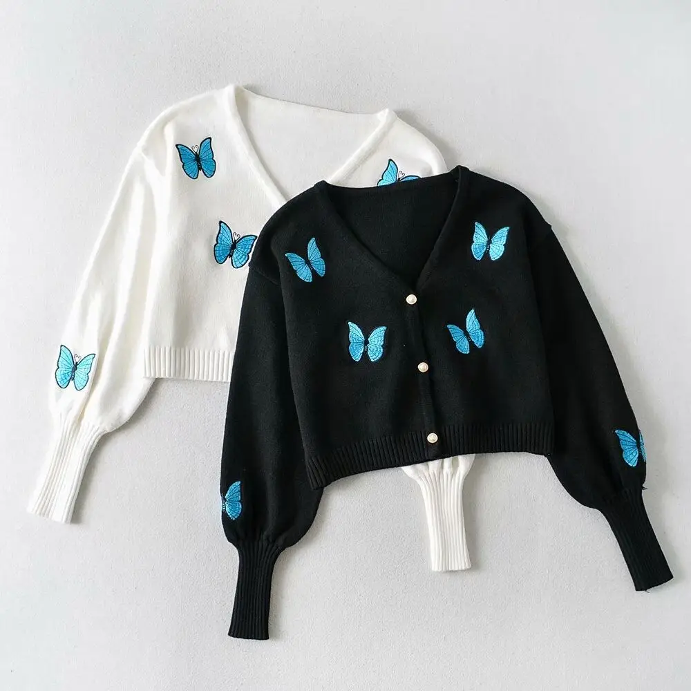 Женский винтажный кардиган с вышивкой в виде бабочки, корейский облегающий свитер с рукавами-фонариками, новый вязаный кардиган, куртка, женская кофта