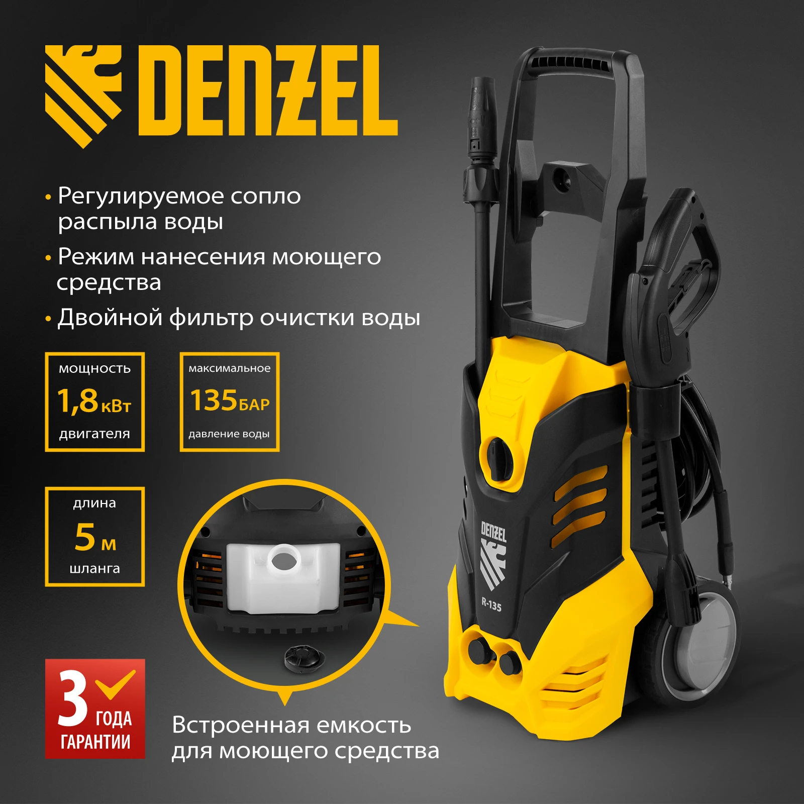 Моечная машина высокого давления R-135, DENZEL 58233, 1800 Вт, 135 бар, 6 л/мин, колесная