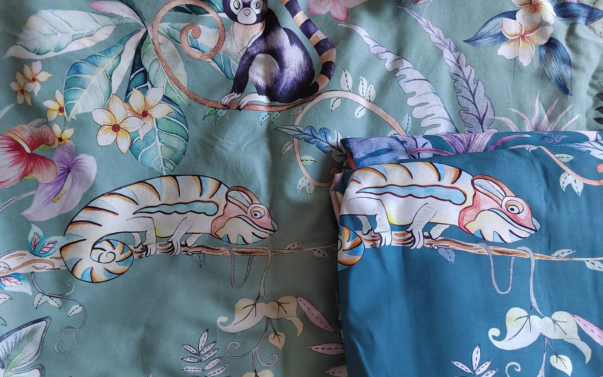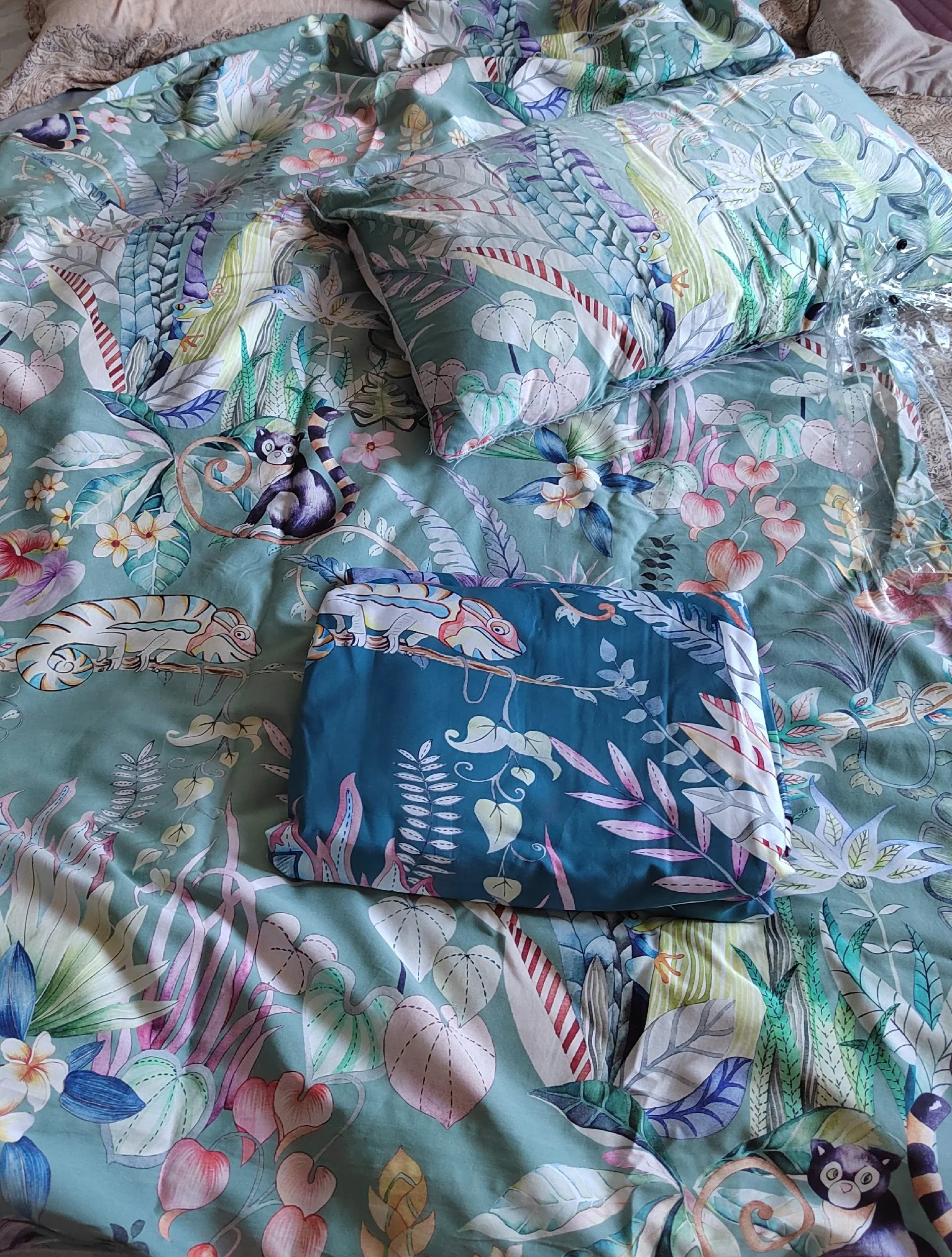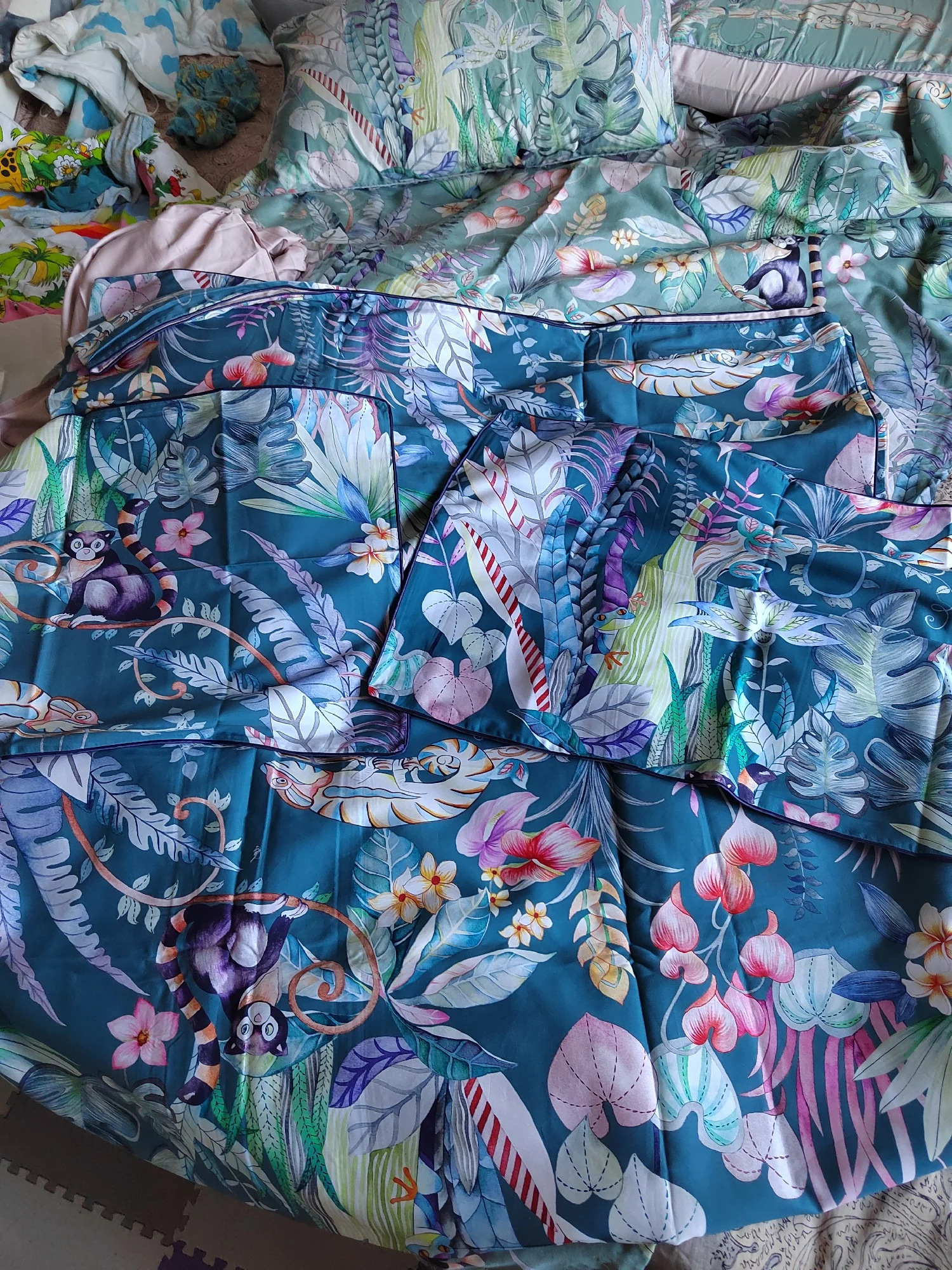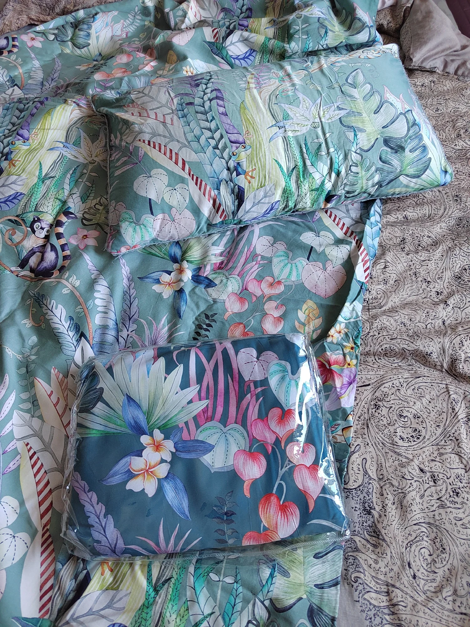 Быстро доставили, я бы даже сказала внезапно 😁, хотя срок был обозначен до начала августа. Упаковка добротная, без коробки, но я так и ожидала, привез курьер на дом. Бонусом пакет с ручками и полотенце. Покупкой довольна, заказ долго томился в корзине. Ловила скидку, т.к. у нас подобное белье стоит больше 8тыс.рублей, т.е. по большому счету примерно одинаково. Дело в том, что много лет назад я покупала подобный комплект, мы его прозвали "джунгли", возможно даже в этом магазине и захотела купить такой же. По качеству комплект почти один в один, не считая мелких нюансов (кант на белье тёмно-синий, а был бежевый, немного отличается пошив простыни, нет полоски основной ткани с одного торца где резинка). На фото старый комплект, которому больше восьми лет, если не все 10, активно используемый и дома и на даче (ребенок любит эту расцветку) и он еще вполне, и рядом новый. Покупкой довольна более чем.