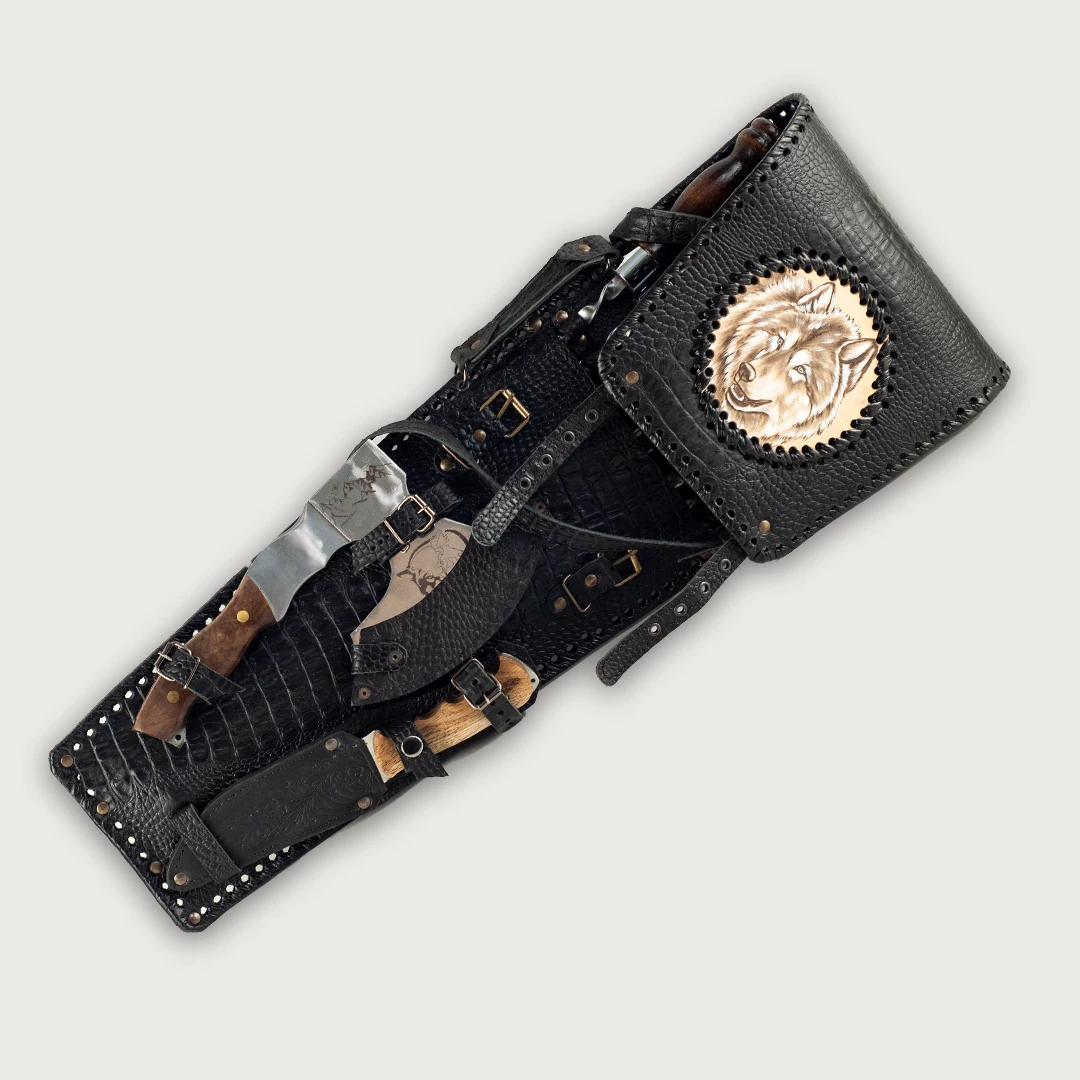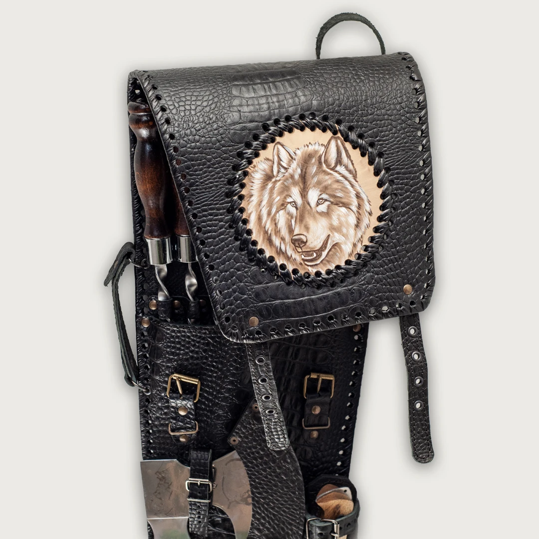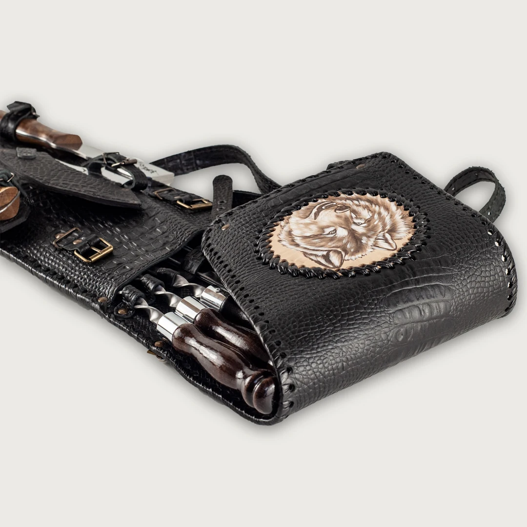 Набор шампуров в чехле из натуральной кожи "Волк - Люкс" с топором и ножом