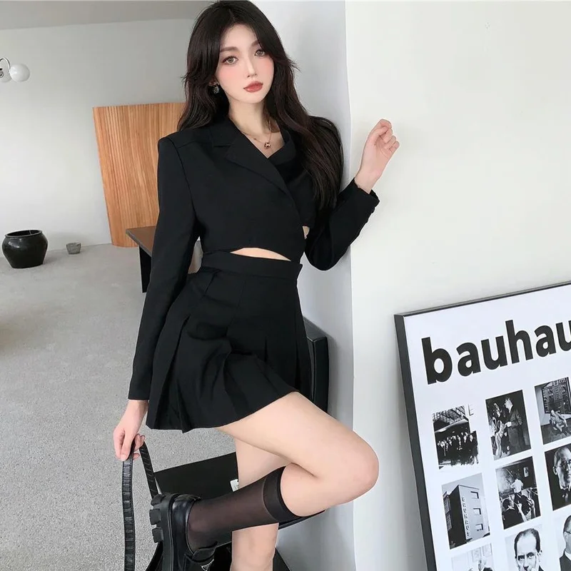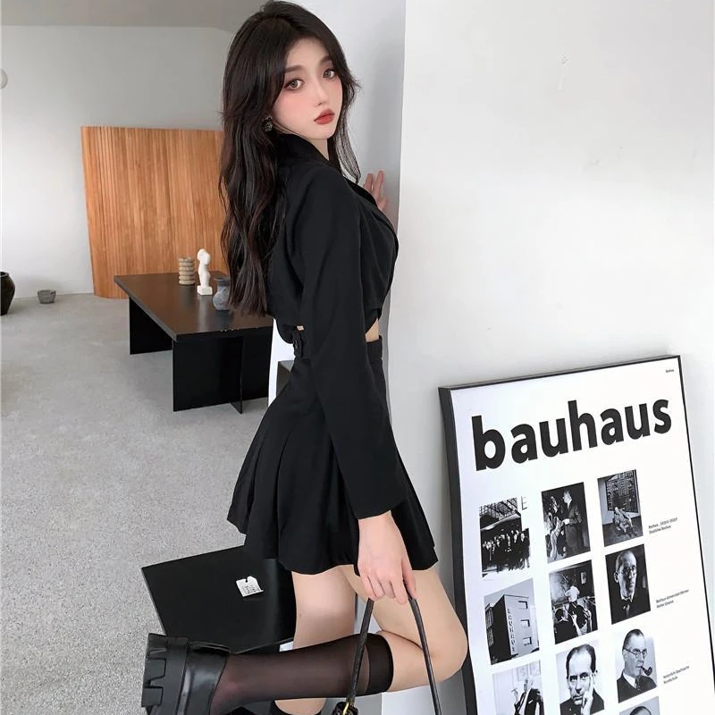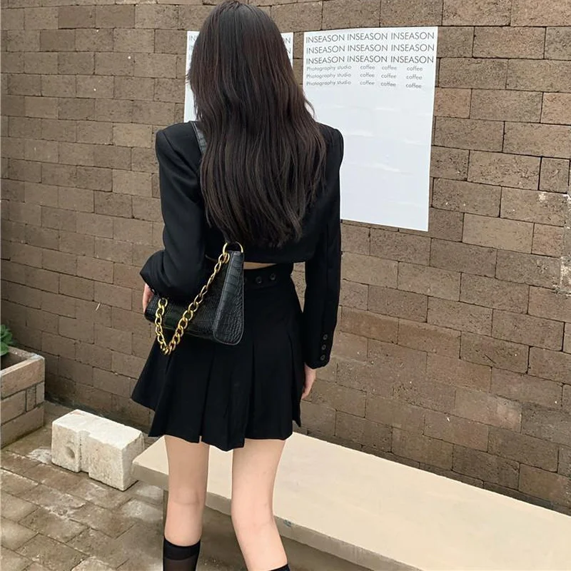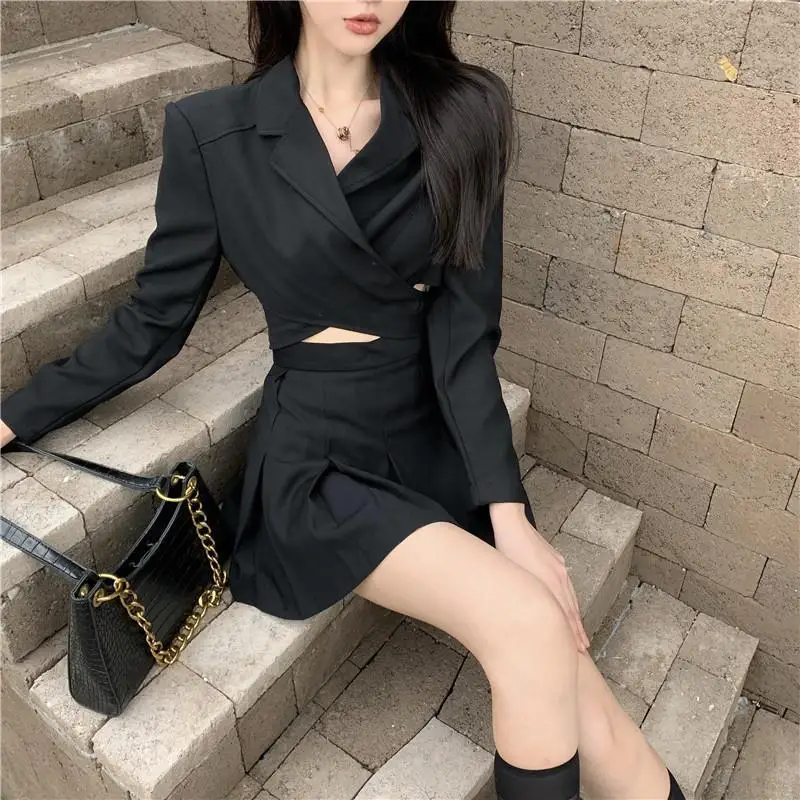 Женский комплект из 2 предметов, однотонный винтажный укороченный пиджак с отложным воротником, блейзер с перекрещивающимися блестками, нежный женский мини-костюм для отдыха, Ulzzang