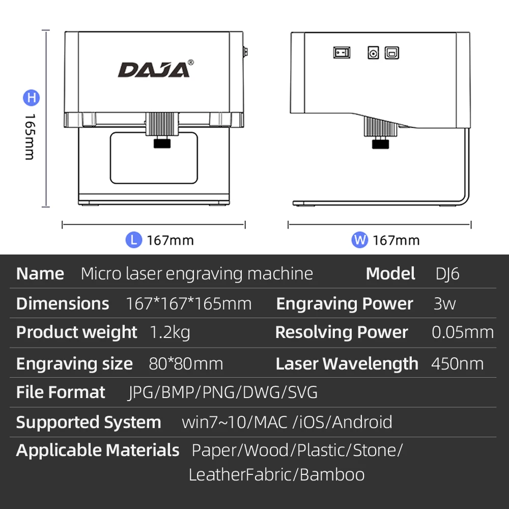 Лазерный гравер DAJA DJ6 с ЧПУ, вес 1.20 кг, размеры 167*167*165 мм, совместимость с Windows / macOS / Android / IOS, тип штекера на выбор