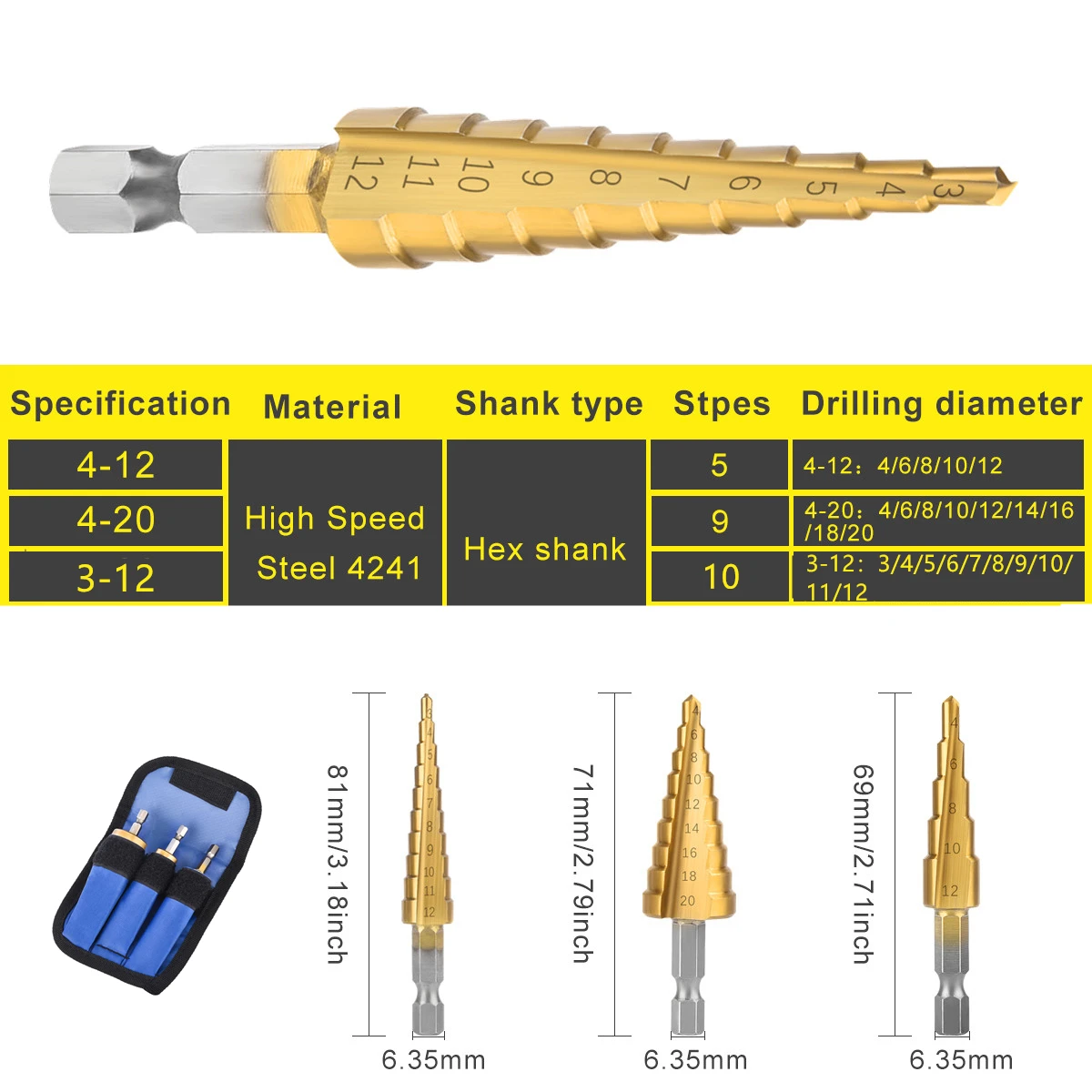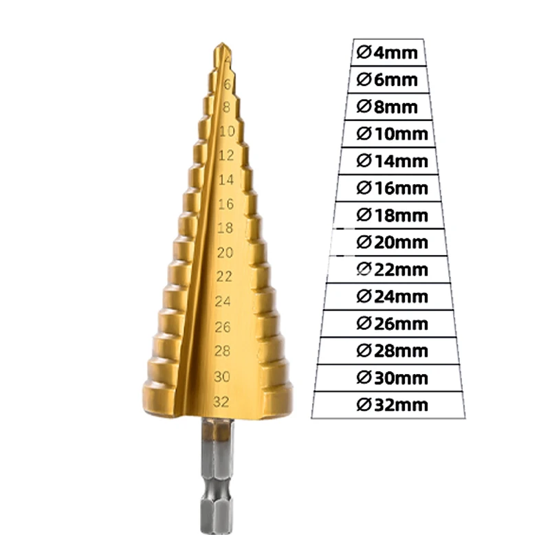 - 3:1/4" Step Cone Taper Drill Bit Set Metric Metal Hex Drill Bits