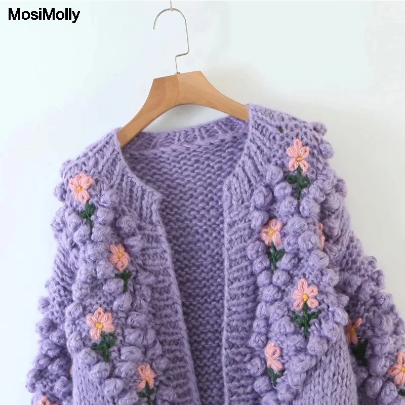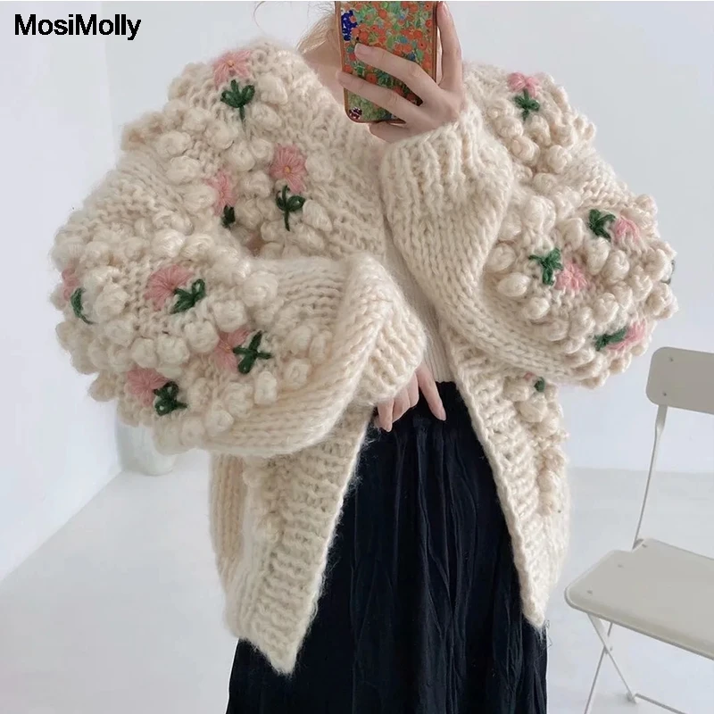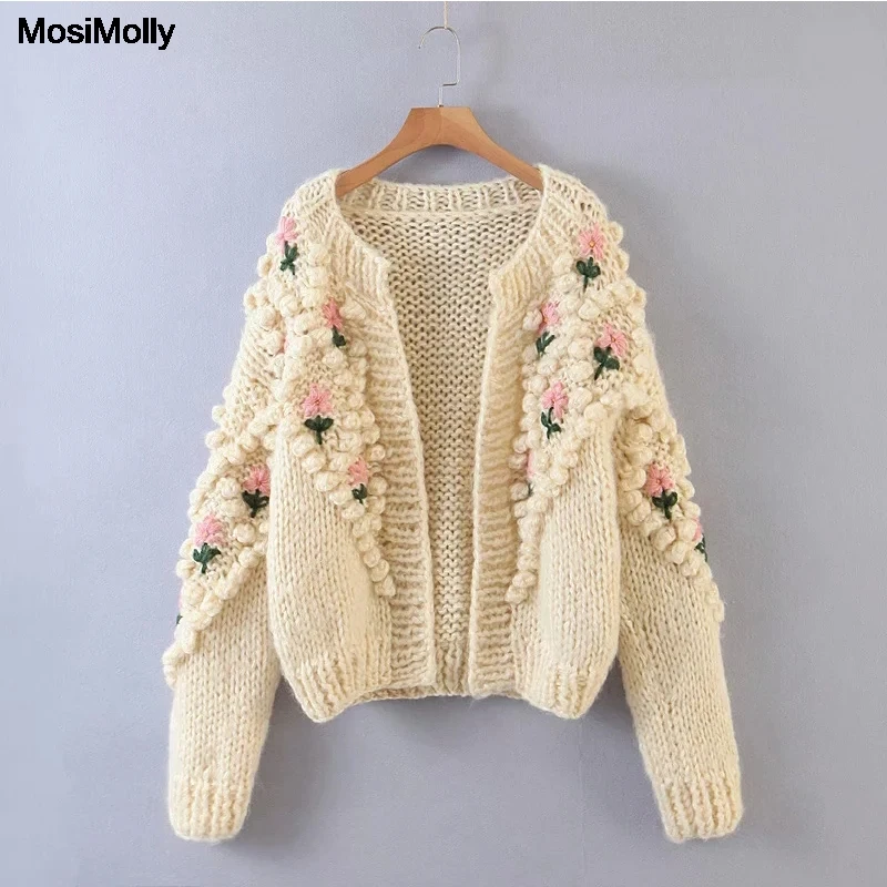 Женский вязаный кардиган MosiMolly, вязаный кардиган ручной работы с цветочным помпоном в стиле бохо, джемпер для отдыха на осень и зиму