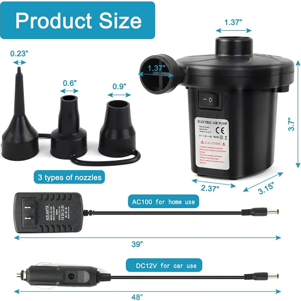 Электрический воздушный насос, портативный насос для надувания, компрессор для матраса, бассейна, быстрая надувка, 3 насадки