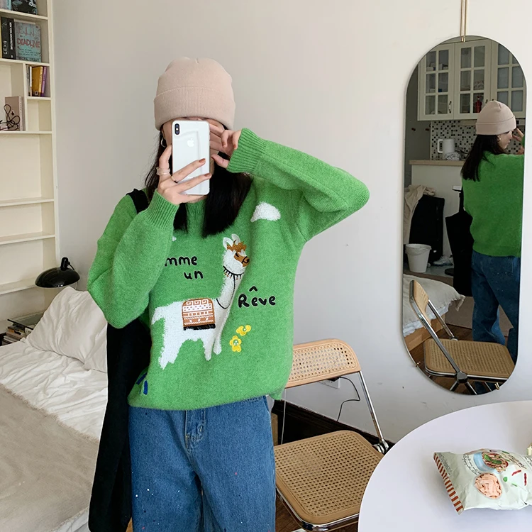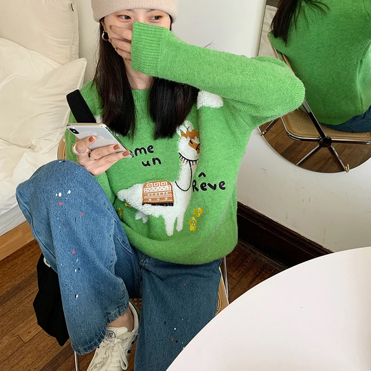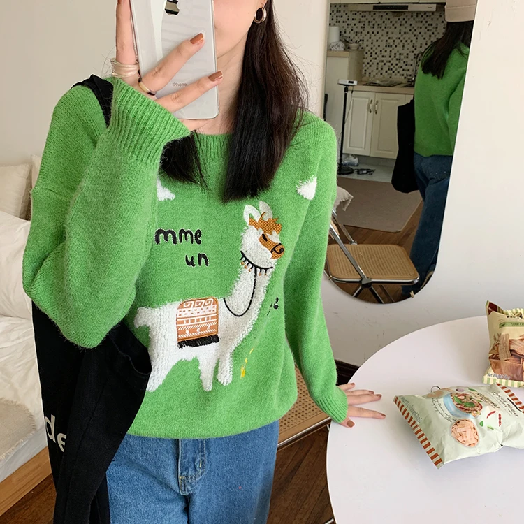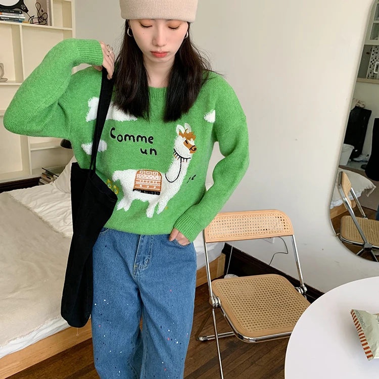 Женский трикотажный свитер harajuku, Милый Винтажный свитер в Корейском стиле с изображением альпаки, букв и цветов, Осень-зима 2022