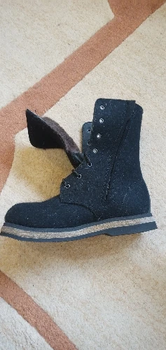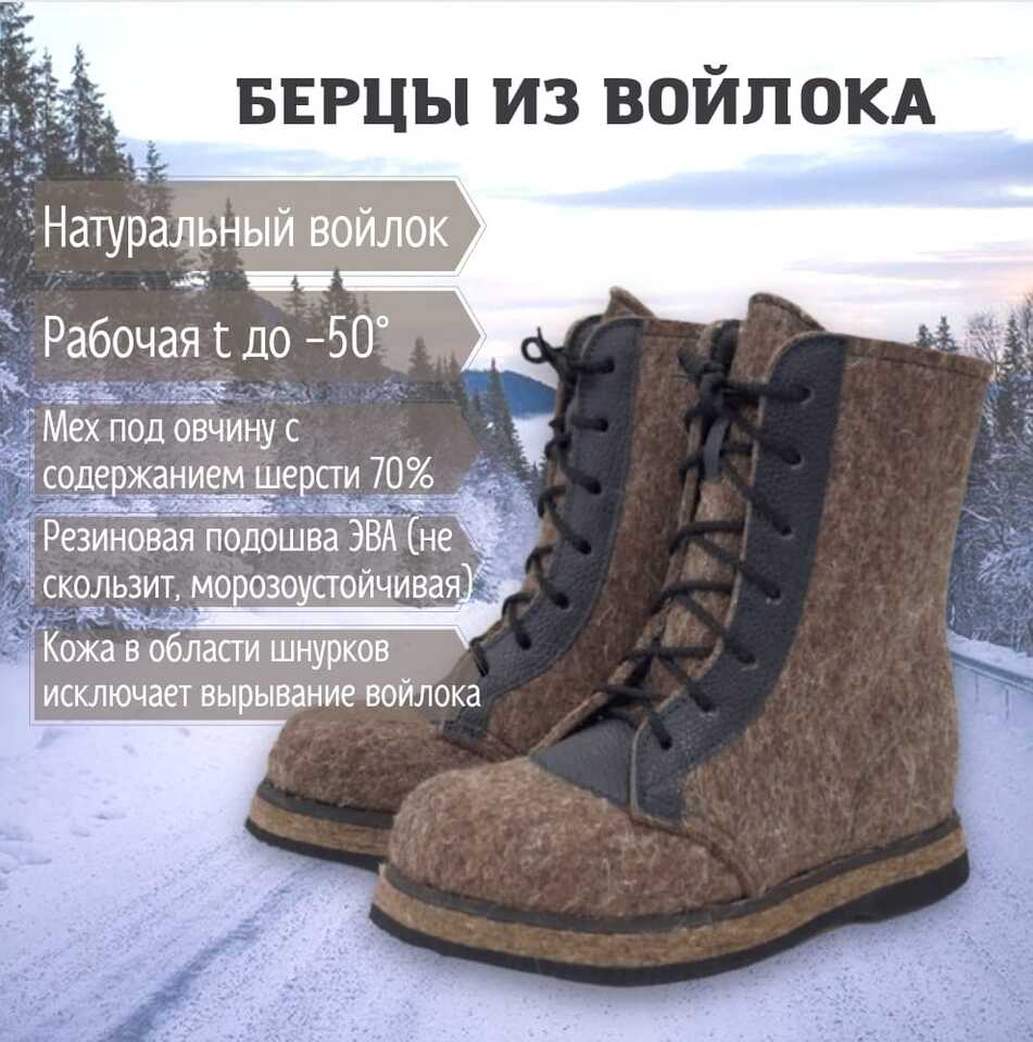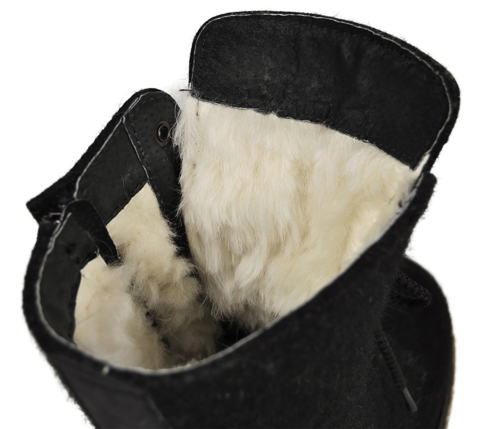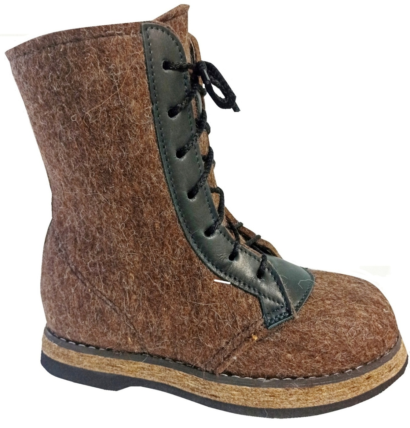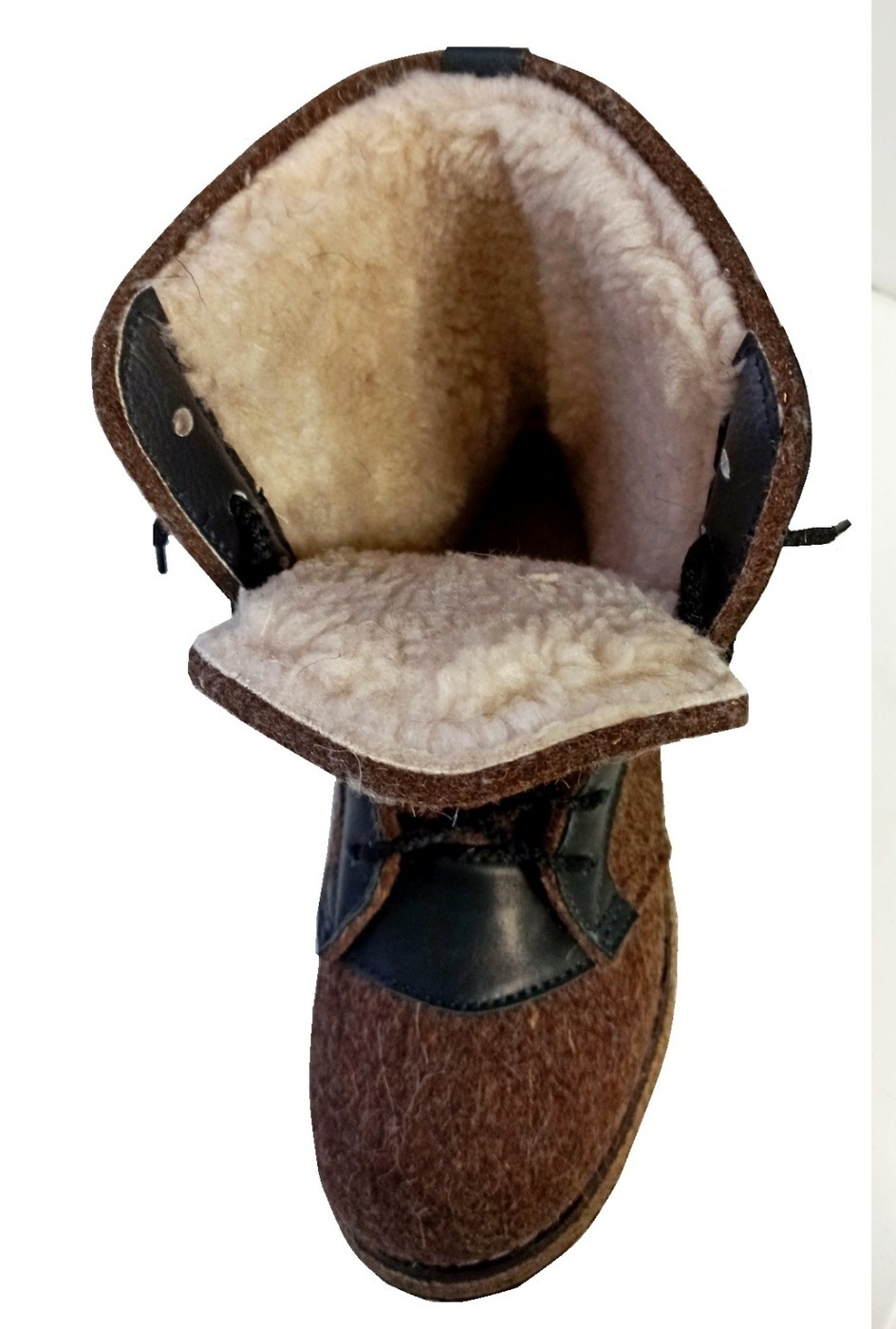 Натуральный обувной войлок. Мех натуральный - овчина . Вид застежки молния, шнуровка. Войлочная подошва. Низ из морозостойкой микропористой резины.