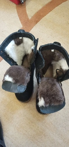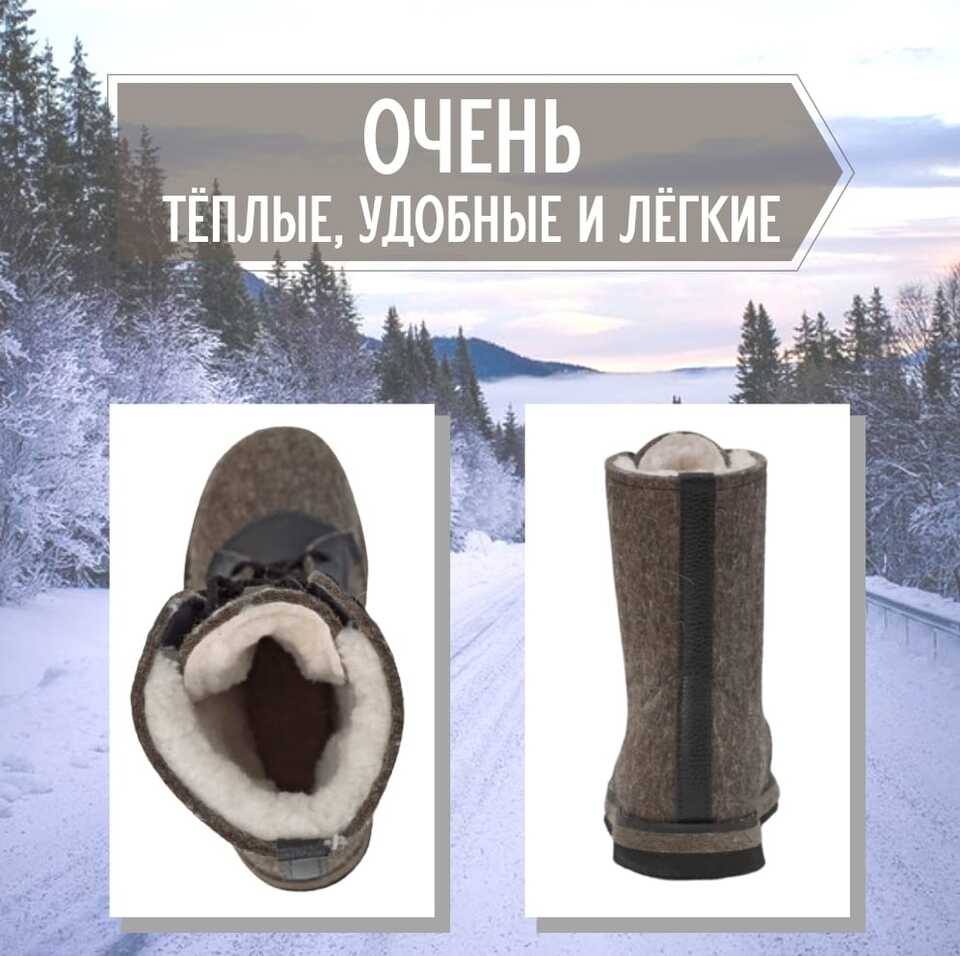 Удобные, легкие,теплые. Натуральный обувной войлок. Мех под овчину с содержанием шерсти 70%. Кожа в области шнурка. Низ из морозостойкой микропористой резины.