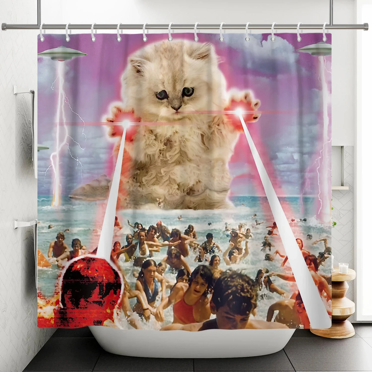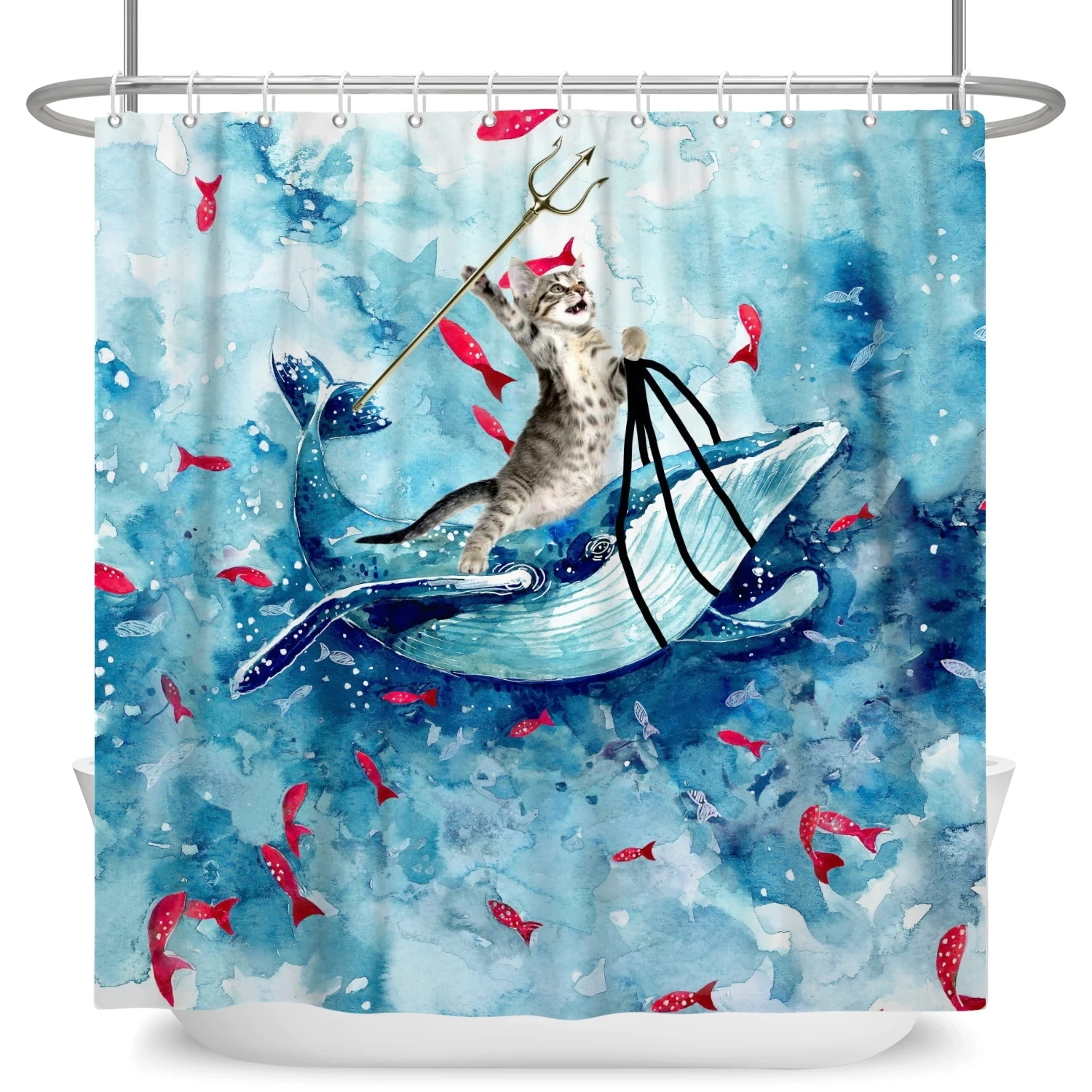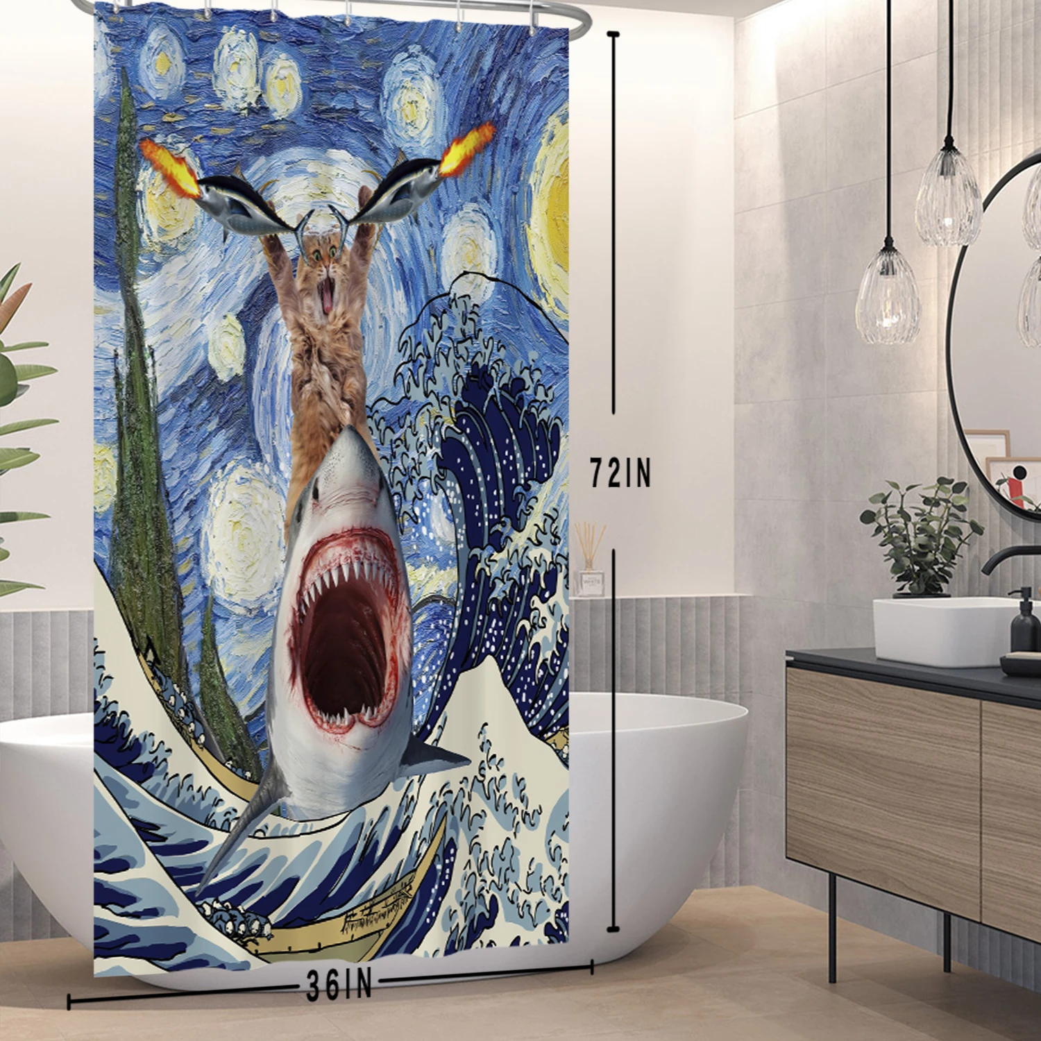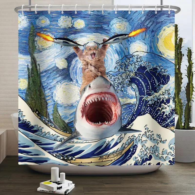 Забавная занавеска для душа с изображением белой акулы и кота с пистолетом, занавеска для ванны, чехол для ванной, чехол для купания, очень большой, широкий, 12 шт. крючков