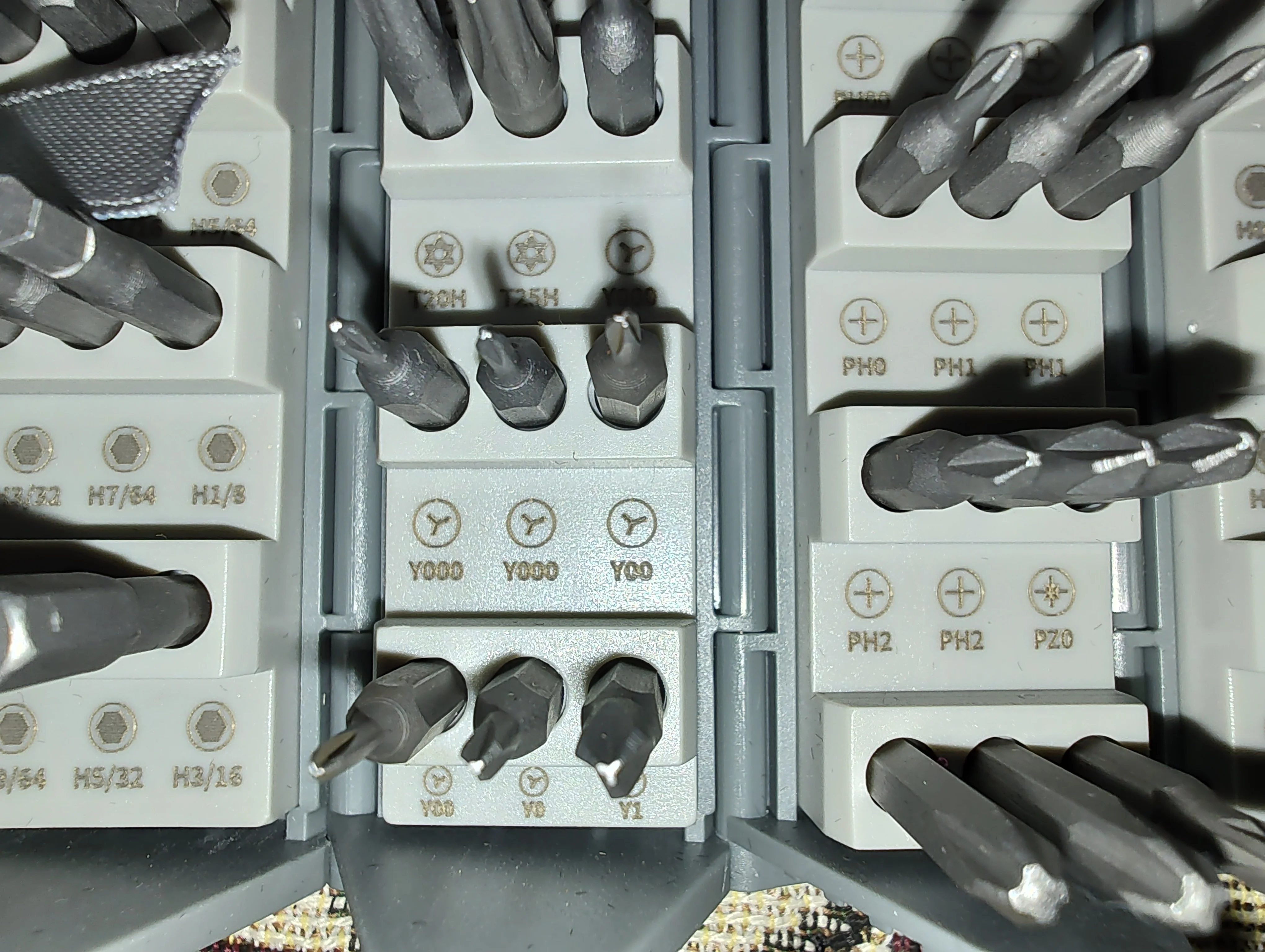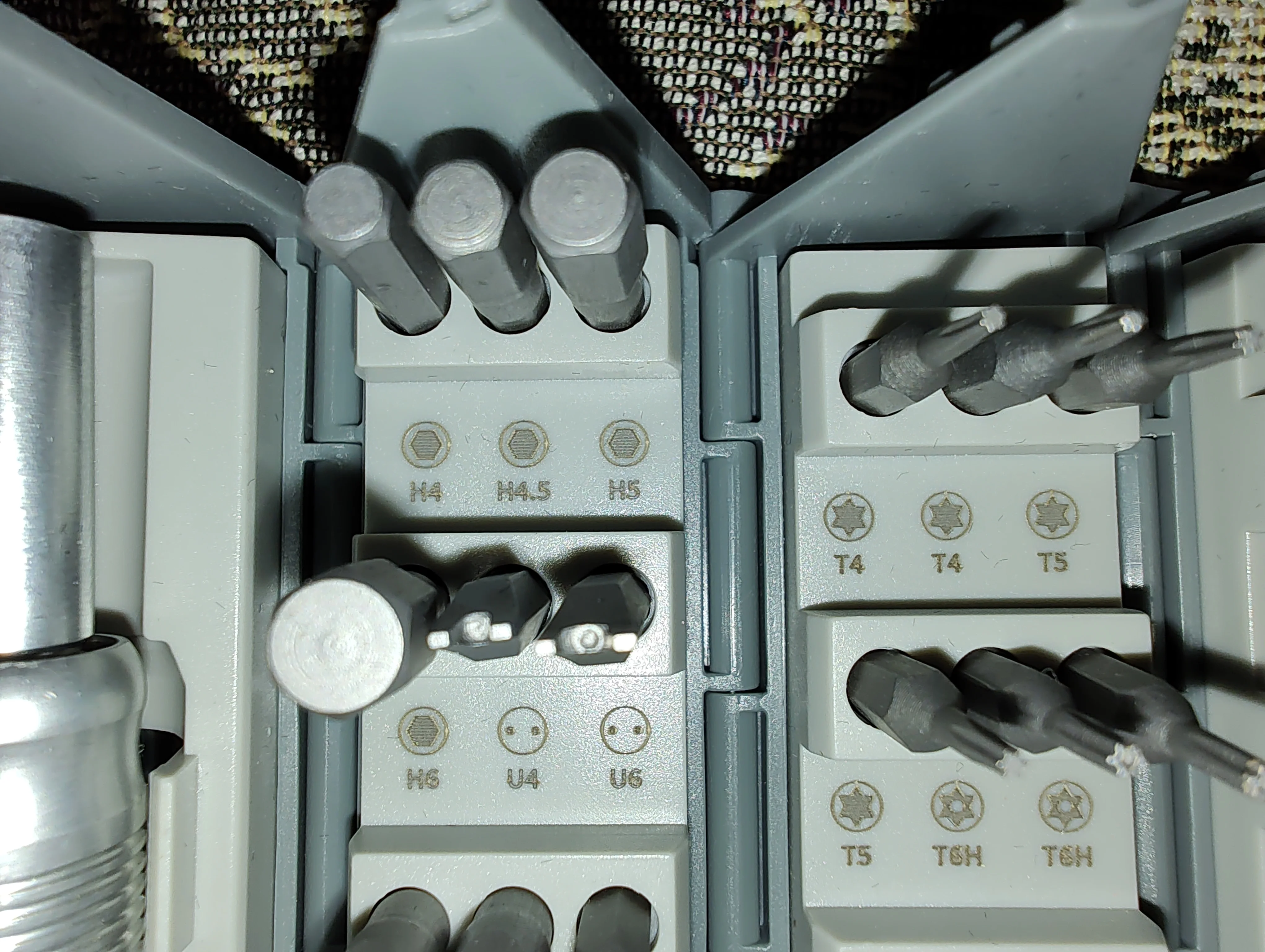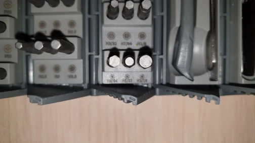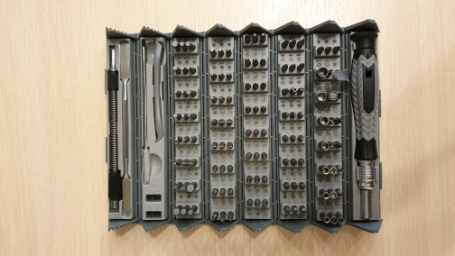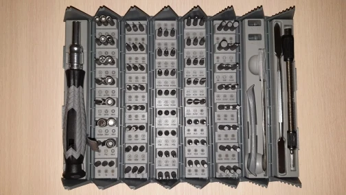 Интересное исполнение. Несколько избыточно для домашнего использования, я не знаю назначения большей части бит. Но внешний вид шикарный. При доставке пострадали пластиковые фиксаторы на тканевом чехле. Мне это не критично, чехол все равно такой тугой, что использовать его нет желания. Из реальных минусов, некоторая размытость и бледность обозначения бит, при поиске нужной возникает ощущение проблем со зрением. Ни на картонной коробке, ни в бумажной инструкции, ни на наборе нет никаких маркировок производителя, интересно это самостоятельная придумка умелых ручек или таки есть какой то "фирменный прототип".