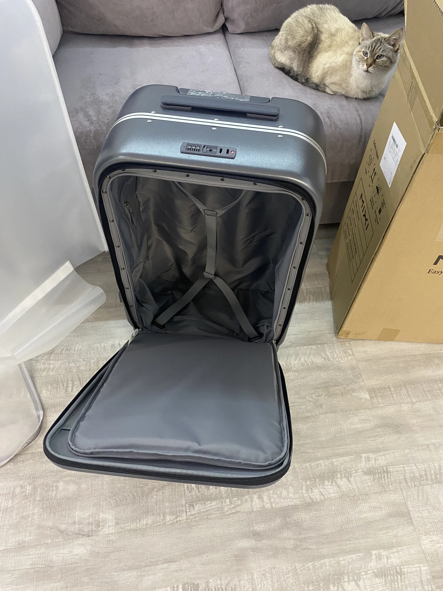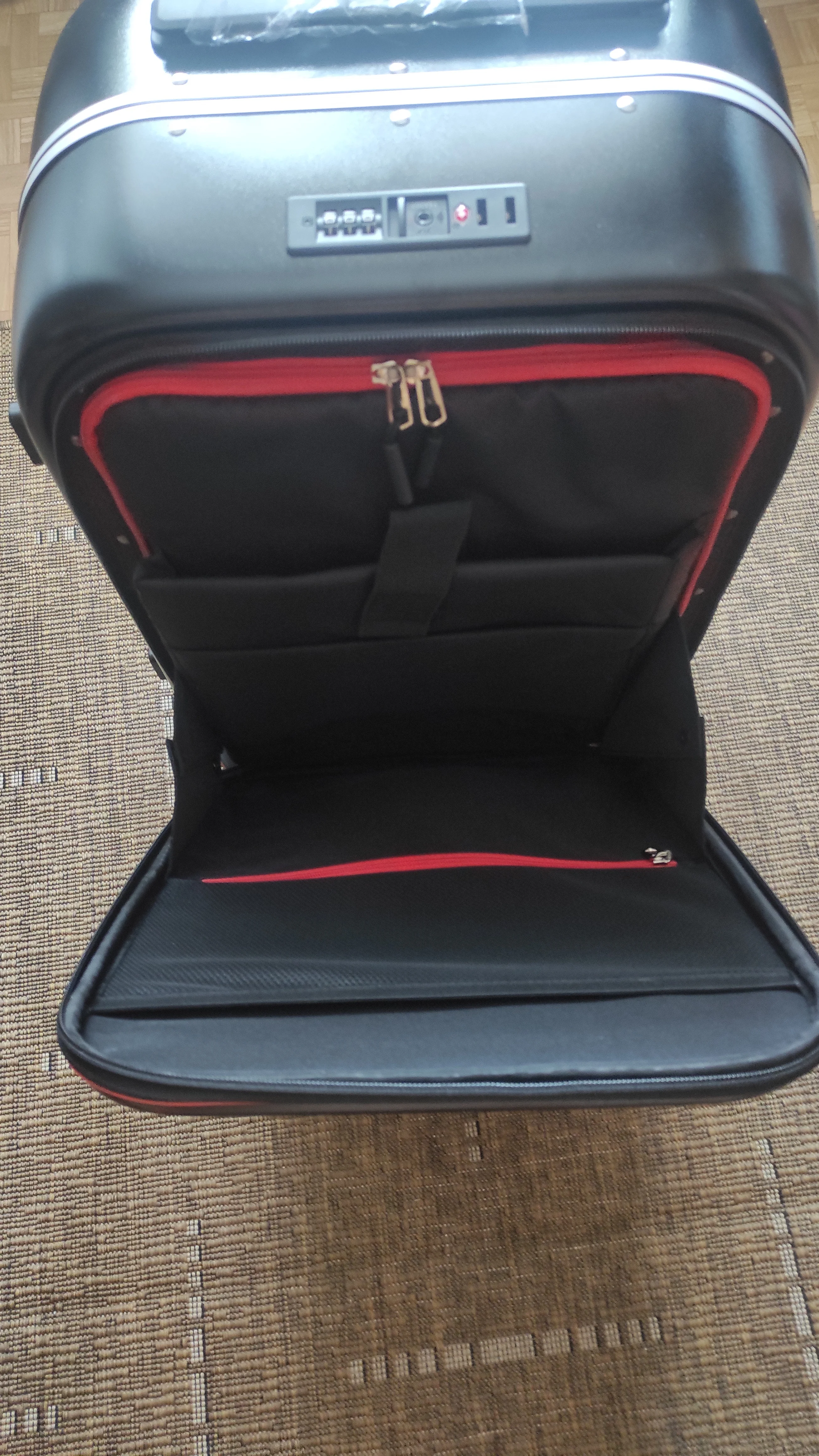 Чемодан был доставлен ко мне за неделю, привёз курьер СДЭКа, г Красноярск. Чемодан как на картинке. Отсек для ноутбуков вмещает не каждый ноутбук. Сюда влезет только 15 дюймовый, у меня 17ти и не влезает. Цвет красивый. В комплекте чехол, но не знаю, насколько его хватит, выглядит очень хлипким, как плотный пакет с молнией. Думаю, матерчатые чехлы будут более практичны, но посмотрим. Колесики хорошие, я бы сказала, крупные. У меня есть большой чемодан, у него даже поменьше колеса будут. Прежде всего меня привлёк способ открытия чемодана, откидная крышка и большой отсек - это очень удобно, влезет плотненько больше вещей, чем в в чемодан, который разделён на 2 половины. Немного не понятен принцип работы системы замков, ещё не разбиралась. Есть кнопка сброса цифрового кода. Нет ключа, в инструкции написано, что заблокировать собачки можно любым ключом - это вообще как? Кто угодно возьмёт подходящий предмет и вскроет чемодан? Вот это жирный минус. В подарок положили губку.