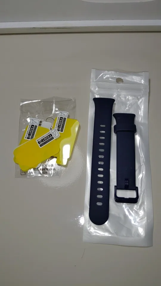 Товар прибыл в Prozo, упаковка была цела и без повреждений, в купленном мне наборе было 3 пленки и синий браслет, пленка выглядит так, как будто она довольно проста и не имеет набора для чистки для установки, а синий браслет по сравнению с оригинальным Xiaomi довольно жесткий.