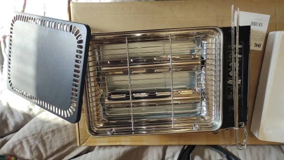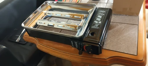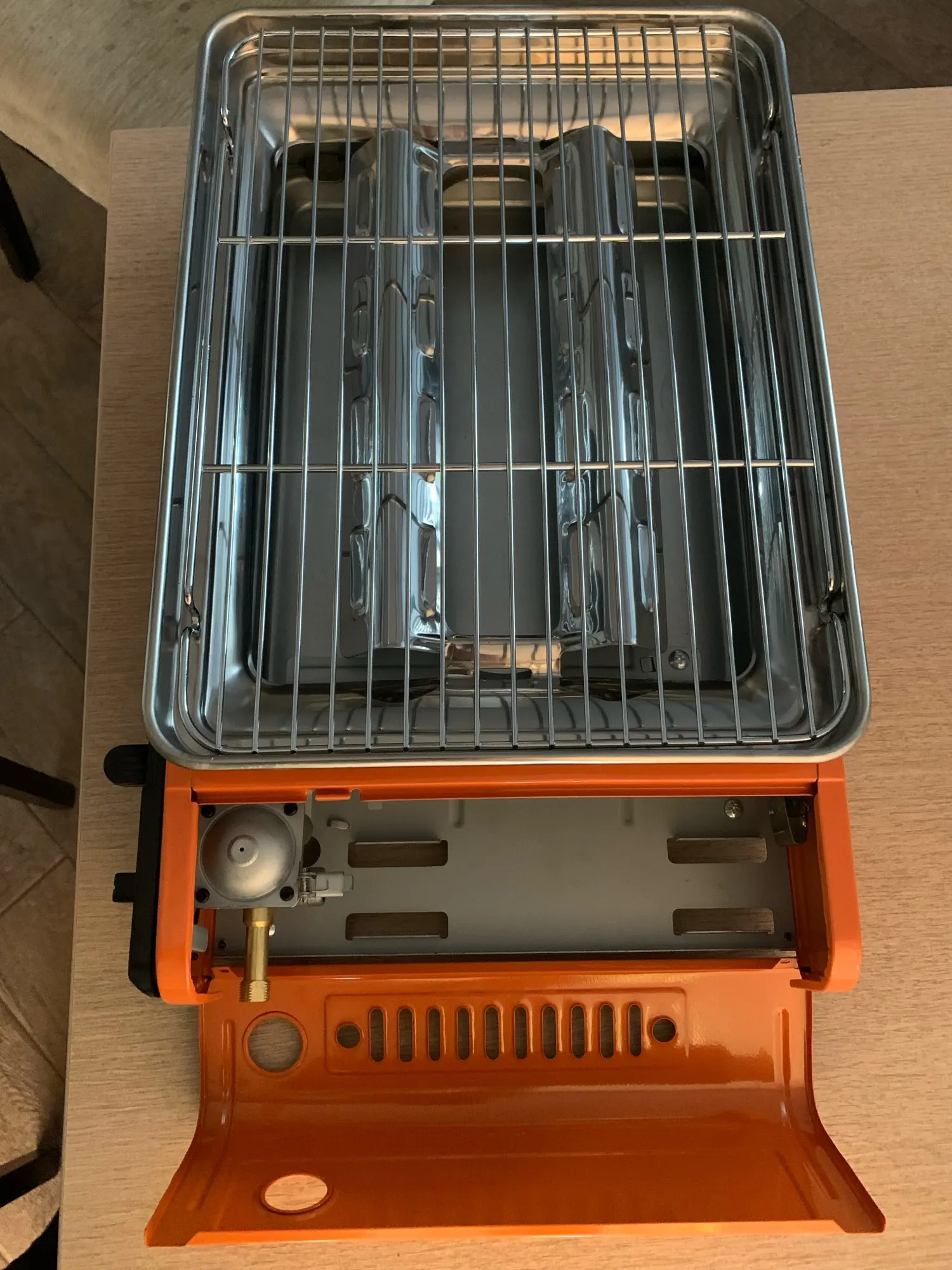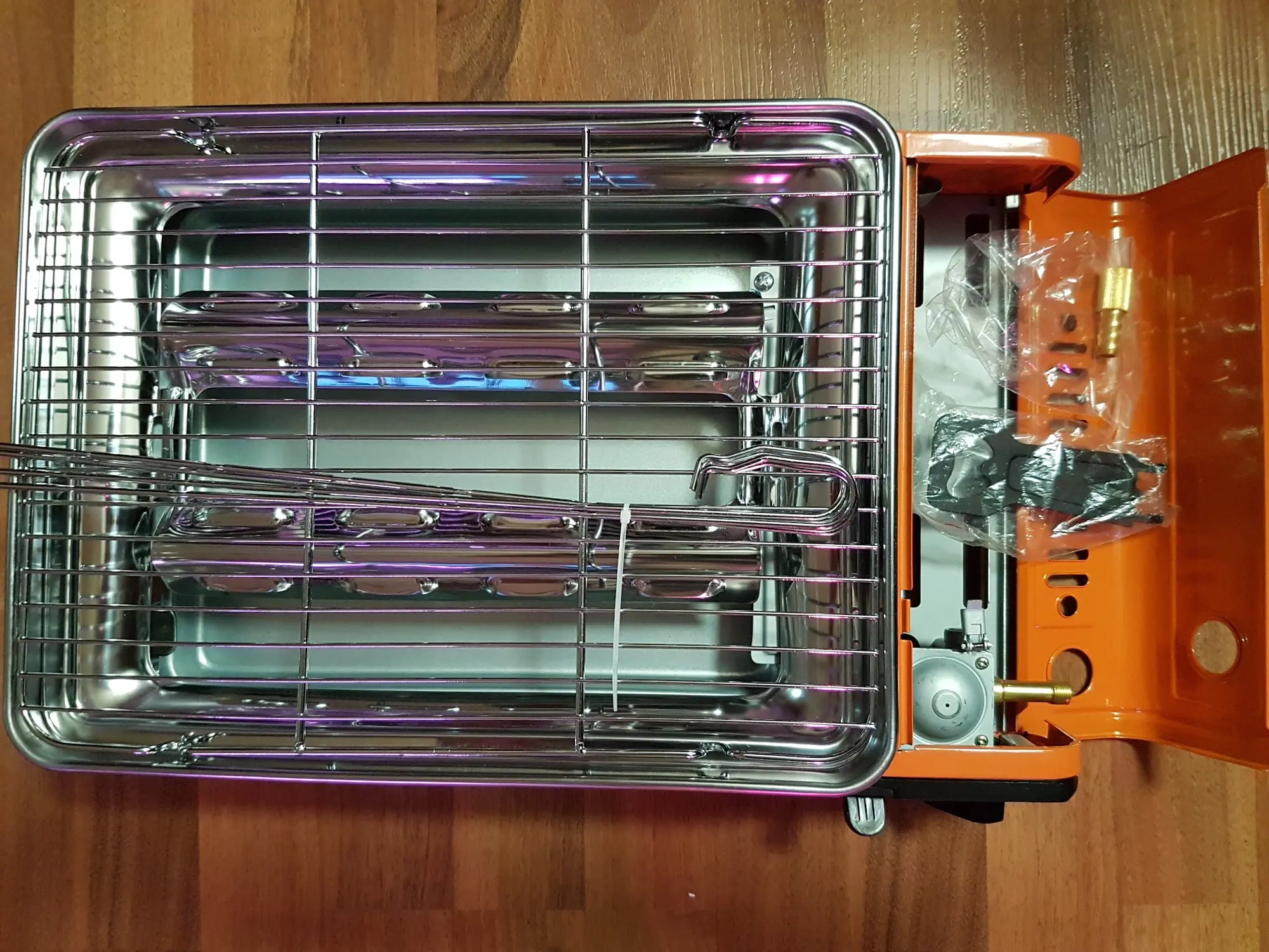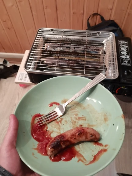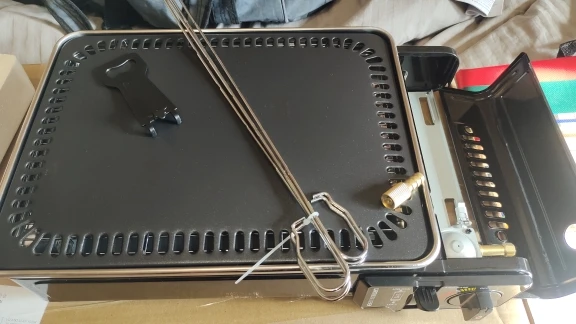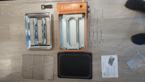хороший гриль. жар даёт нормальный,. вечером после работы пожарить колбаски у моря - самое то. в комплекте решётка, 4 шампура, держатель противня. пьезоэлемент не работает, но это не критично. доставка из России за 6 дней в ПВЗ СДЭК.