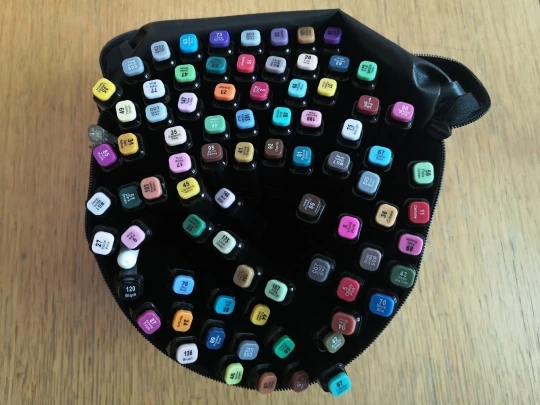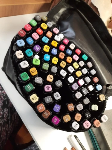 Очень давно хотела такие маркеры, и вот наконец купила☺ Покупкой очень довольна, все 80 штук на месте, ни один не высох и не протëк, за 2 недели пришел заказ. Продавец положил так много подарков, я не ожидала на самом деле)) Всë, что было на картинке, пришло, все ручки пишут. У некоторых маркеров был не до конца поставлен стержень, но это очень легко исправить, а синий был с крошками цвета, но быстро расписался. В сумочку подложила плотной бумаги, чтобы маркеры внутри не болтались)