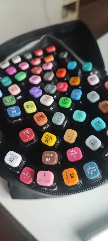 Такие маркеры заказываю не первый раз. Цвета не совпадаю с крышкой(что и ожидаемо), я уже привыкла пользоваться выкраской. Удивило то что пришли в темном корпусе, так как маркеры этой же линейки (ранее купленные) идут в белом. Всё таки белые выглядят аккуратней. Колпачки подписаны не совсем чётко, где то цифра смазанна, где то название. Рекомендую их покрыть прозрачным лаком для ногтей, тогда надпись уже никуда не денется???? Шли около недели, в пункт выдачи пятерочки. Расстроило что 2 маркера(45 и 92) суховаты, но наконечник пуля пишет хорошо(думаю им просто нужно полежать горизонтально, что бы чернила распределились) А так маркеры классные, для новичков самое то!