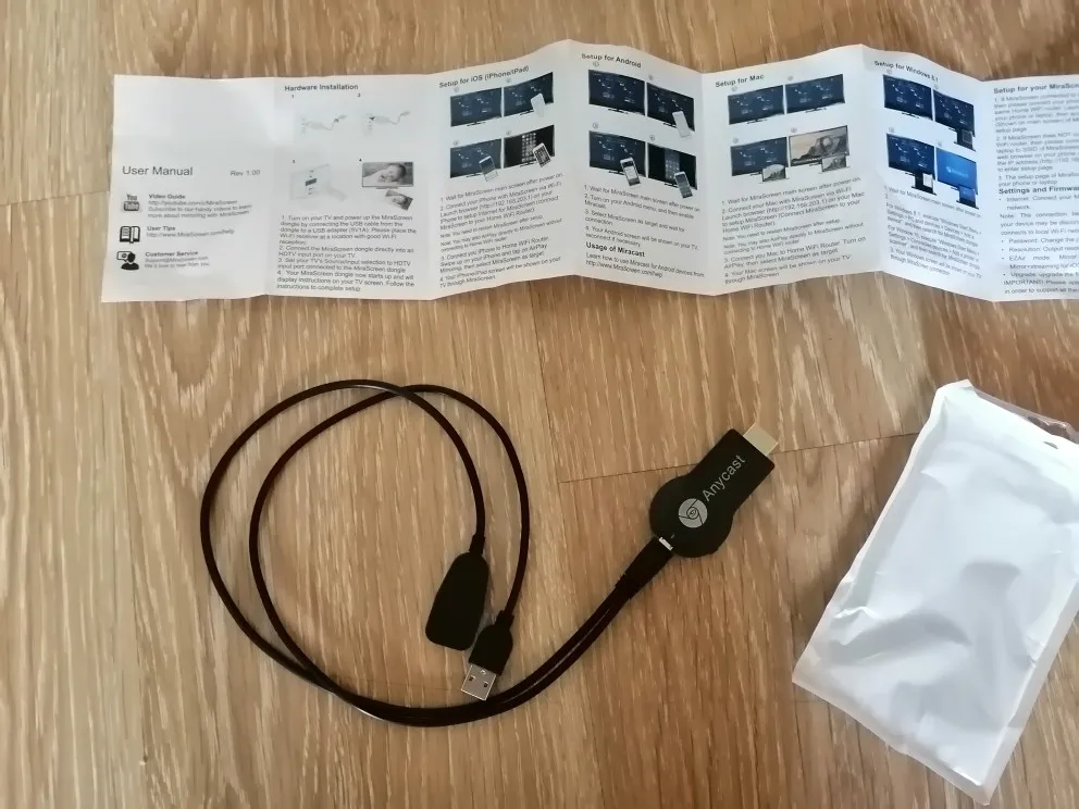 Продавец отправил товар быстро, пришел через 12 дней. Программа называется не AnyCast, a PixCast, то есть это аналог. Работает нормально. Скорость передачи определяет как 72 МБит/сек. Для подключения к ТВ не нужен роутер, подключается напрямую через Wi-Fi и функцию "Виртуальный дисплей". Странно, но при подключении требует включить геолокацию, после соединения можно гео отключить. После подключения звук на телефоне исчезает и идёт с телевизора, как и должно быть. Громкость с телефона регулируется. Картинка до 1080p30 четкая, без лагов. Минусы: Если попытаться проигрывать большие файлы напрямую с телефона (не зеркалирование), не хватает ему памяти в буфере. Я пробовал видео FHD 1080p60 fps с папки - не тянет. Так же и с большими фотографиями. Но кому это нужно. Для динамичных игр не подойдёт, большое время отклика (более 100 ms). Вывод: подойдёт только для зеркалирования экрана, в этом режиме можно смотреть до 4К. Несмотря на недостатки можно смело брать, этих денег стоит