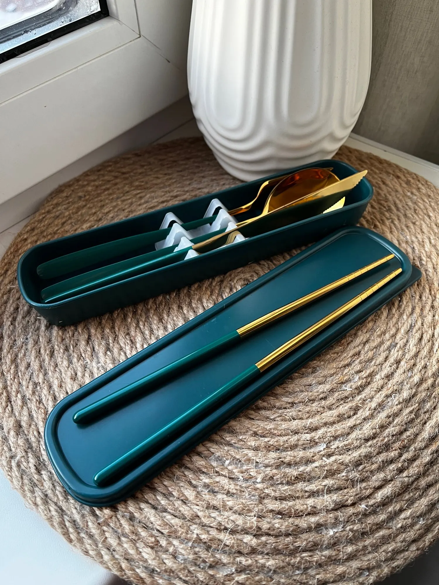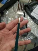 Я очень давно мечта приобрести большой набор красивых столовых приборов, но сомневалась в их качестве, поэтому постоянно откладывала покупку! Решила приобрести для пробы вот такой небольшой дорожный набор и посмотреть как приборы смотрятся в живую! И что вам сказать?! У меня полный восторг Приборы идеальные! Металл красивого золотого цвета, блеск превосходный, а ручки прокрашены аккуратно и без дефектов! В набор входит: Вилка, Ложка, Нож, Палочки для суши, чёрный мешочек и коробка для хранения! За эти деньги лучшего набора и не придумаешь! Я сожалею, что купила один, ведь такой замечательный набор можно было брать в качестве подарка на Новый Год! Обязательно оформлю ещё не один заказ у этого продавца!
