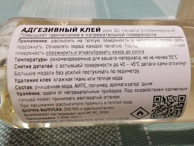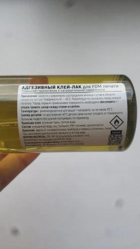 Спрей работает отлично. Всё как обещал продавец. На горячем столе держит принт очень хорошо. После остывания стола принт отлипает сам. качество поверхности приятно порадовало. Продавцу респект!