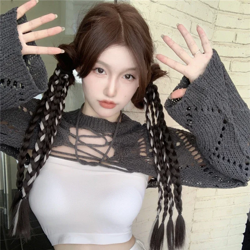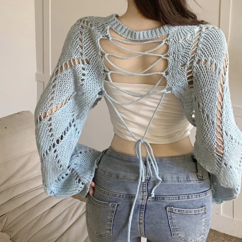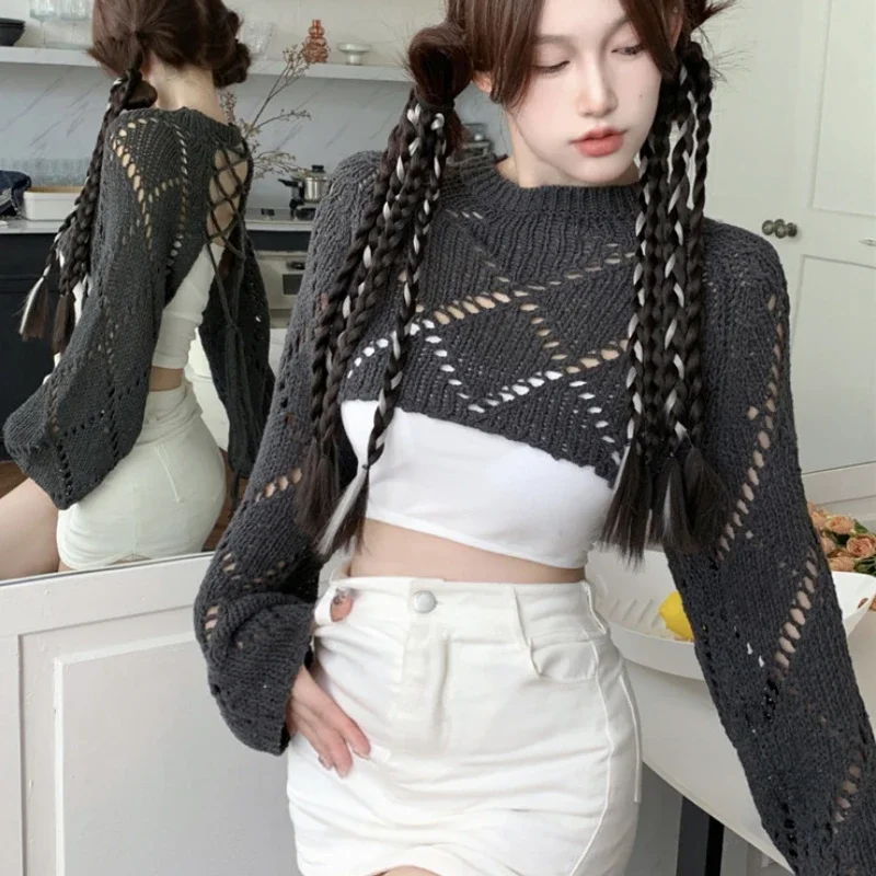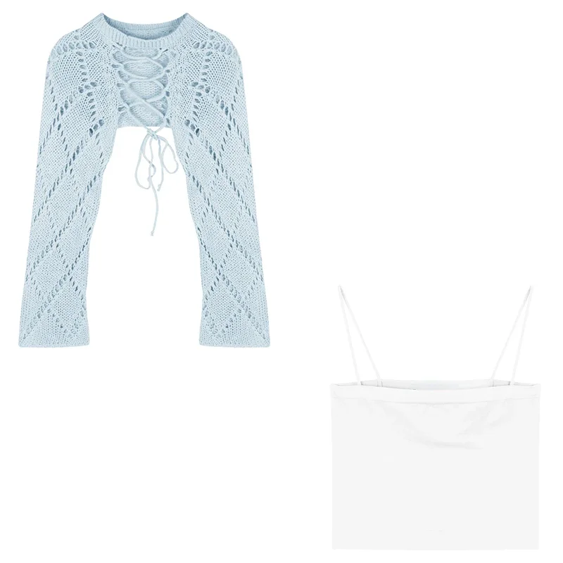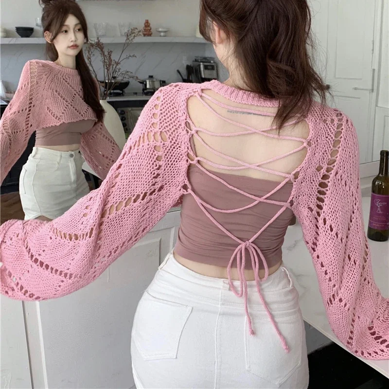 Женский костюм с открытой спиной, Однотонный свитер с длинными рукавами и шнуровкой и базовая кофта в Корейском стиле, костюм из двух предметов, Новинка лета 2024