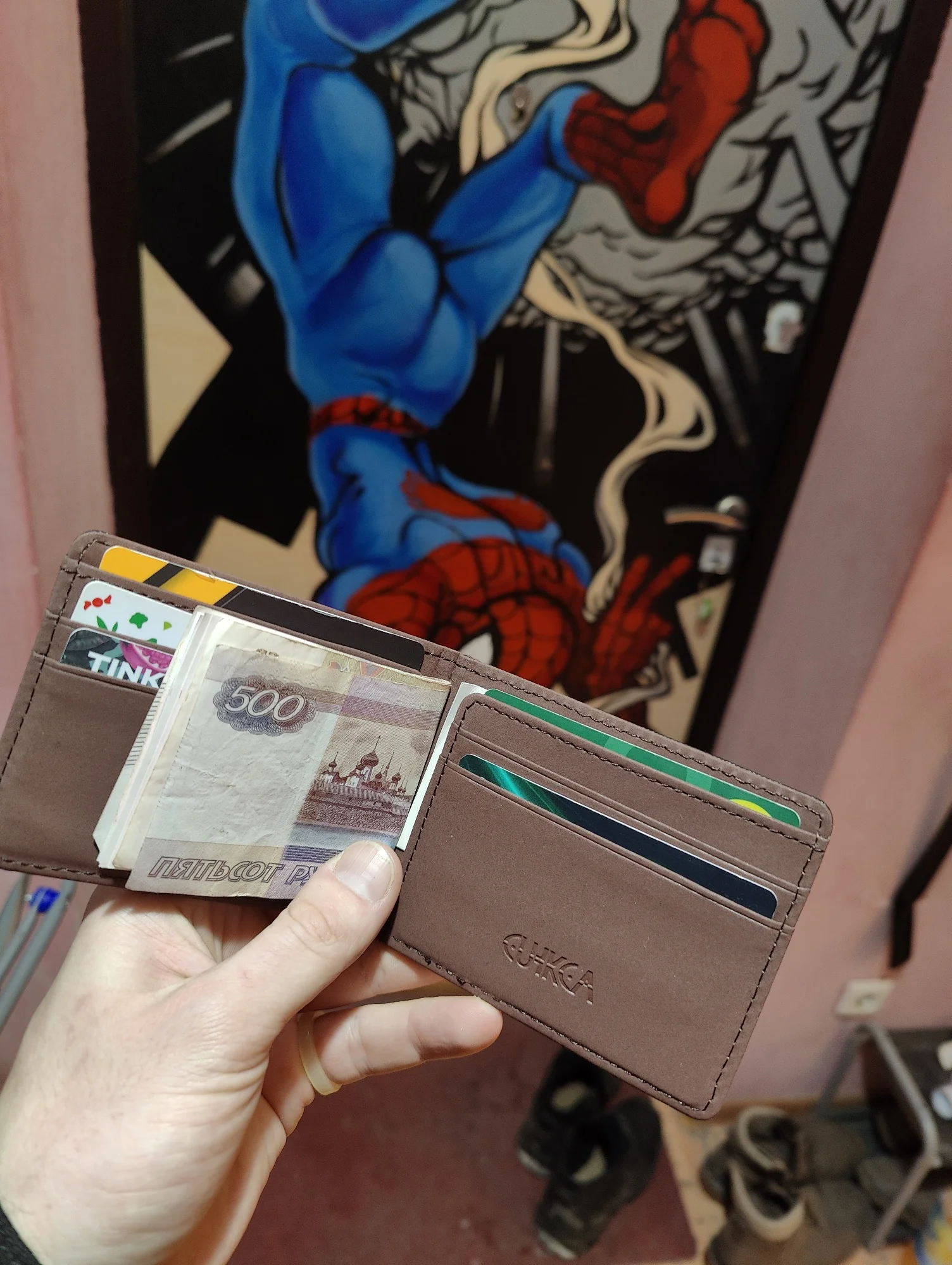 отличный кошелёк в правую часть один безнал ,во вторую -втррой.и пару карт магазинов.нал и больше не влазит.хотя логично что мои 99 скидонов не войдут.качество очень дажеEvgeny E. 10 февраля 2023