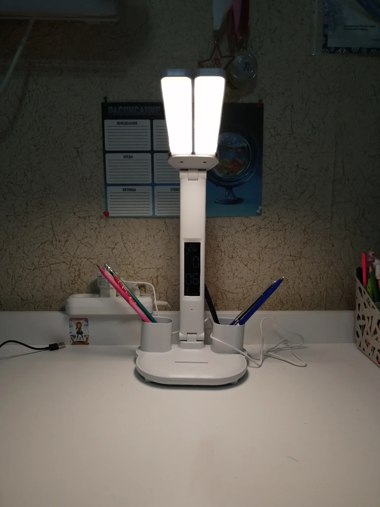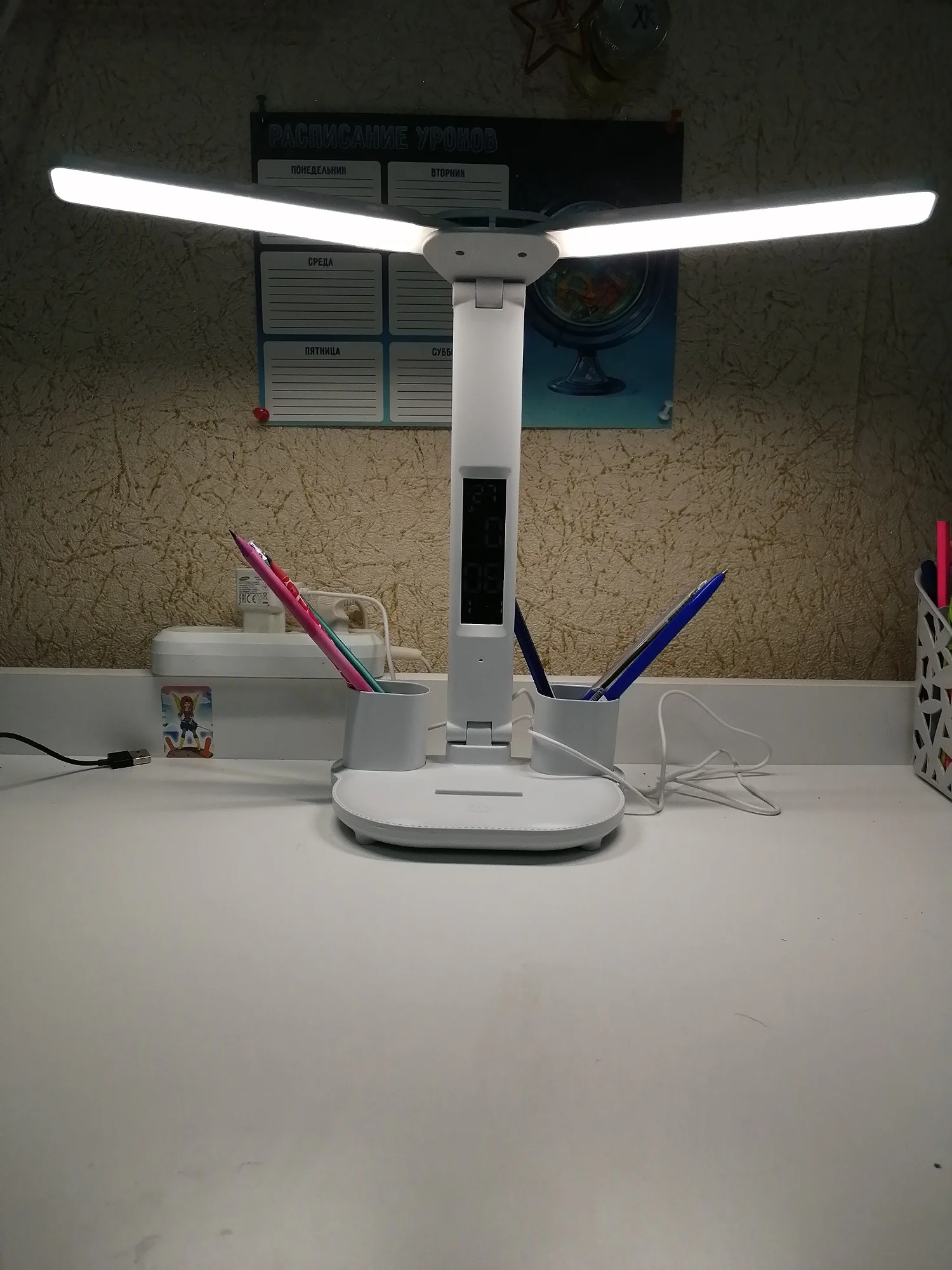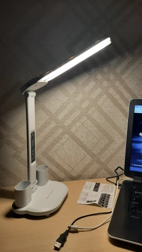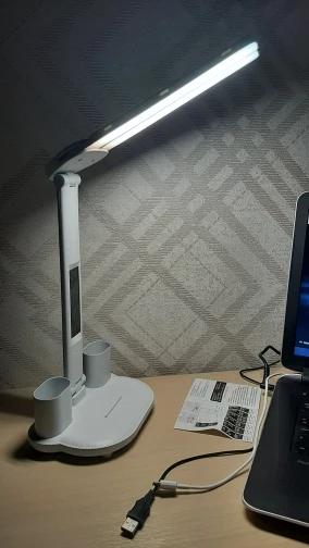 классная лампа, достаточно режимов освещения, есть часы, термометр, календарь, просто огонь, а самое главное аккумулятор, которого должно хватать на долгое время, но буду проверять, одно но, что панель где часы, термометр и календарь работают от батарейки. доставка долгая даже очень долгая, но радует, что прямо в руки, есть косяки по доставке, помяли чутка, но вроде всё целое, рекомендую я доволен.