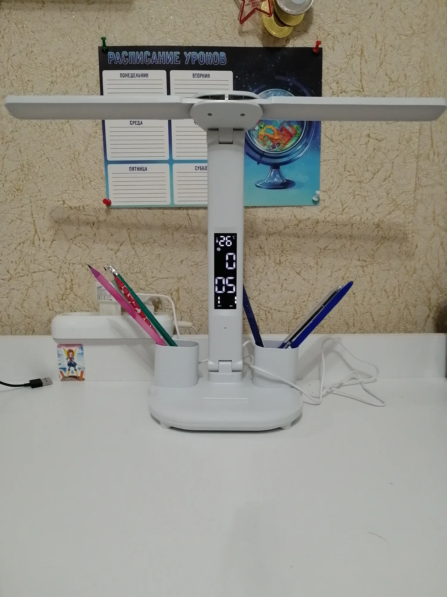 Регулируемая настольная лампа с часами и отделениями под канцелярские принадлежности