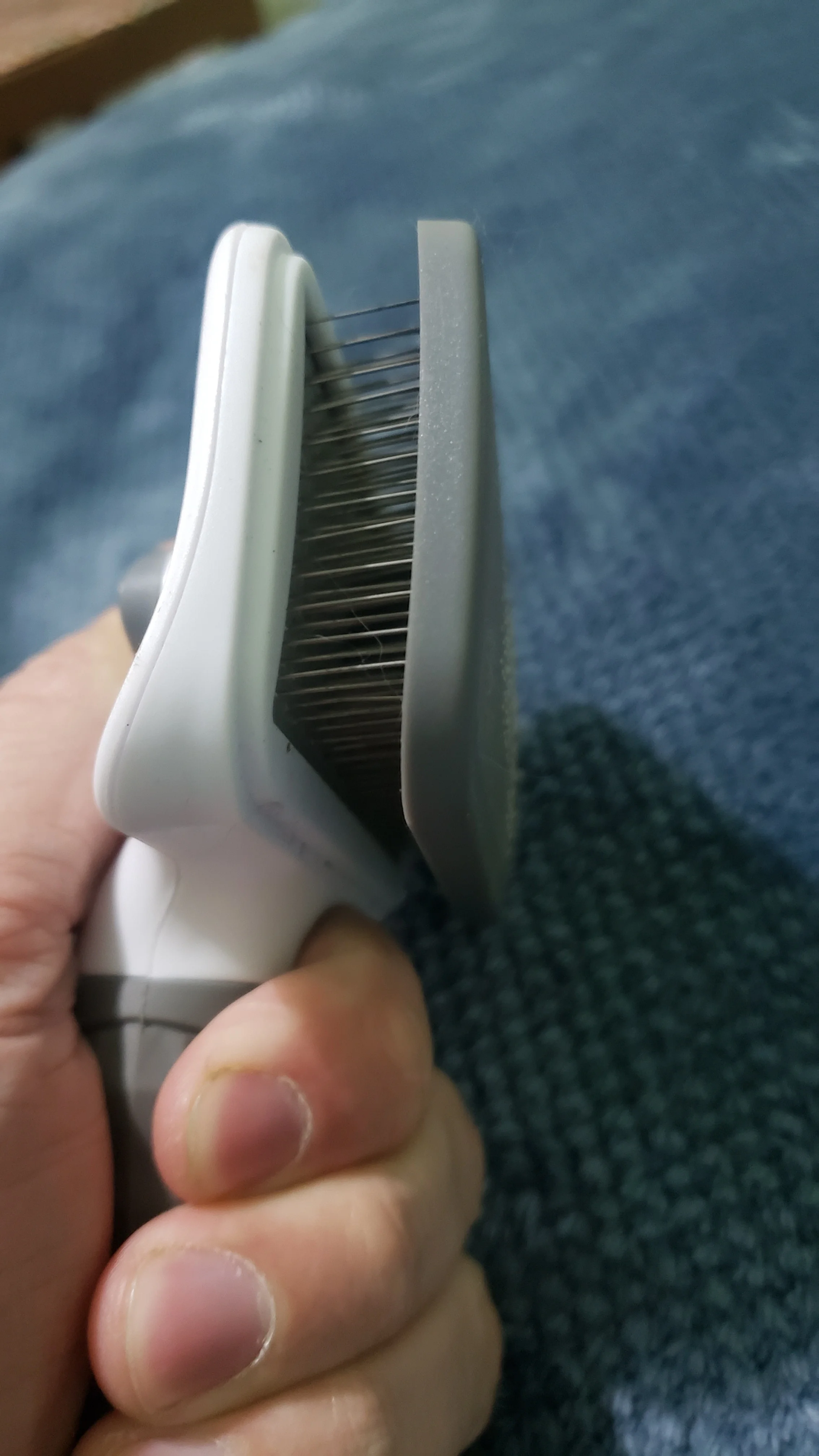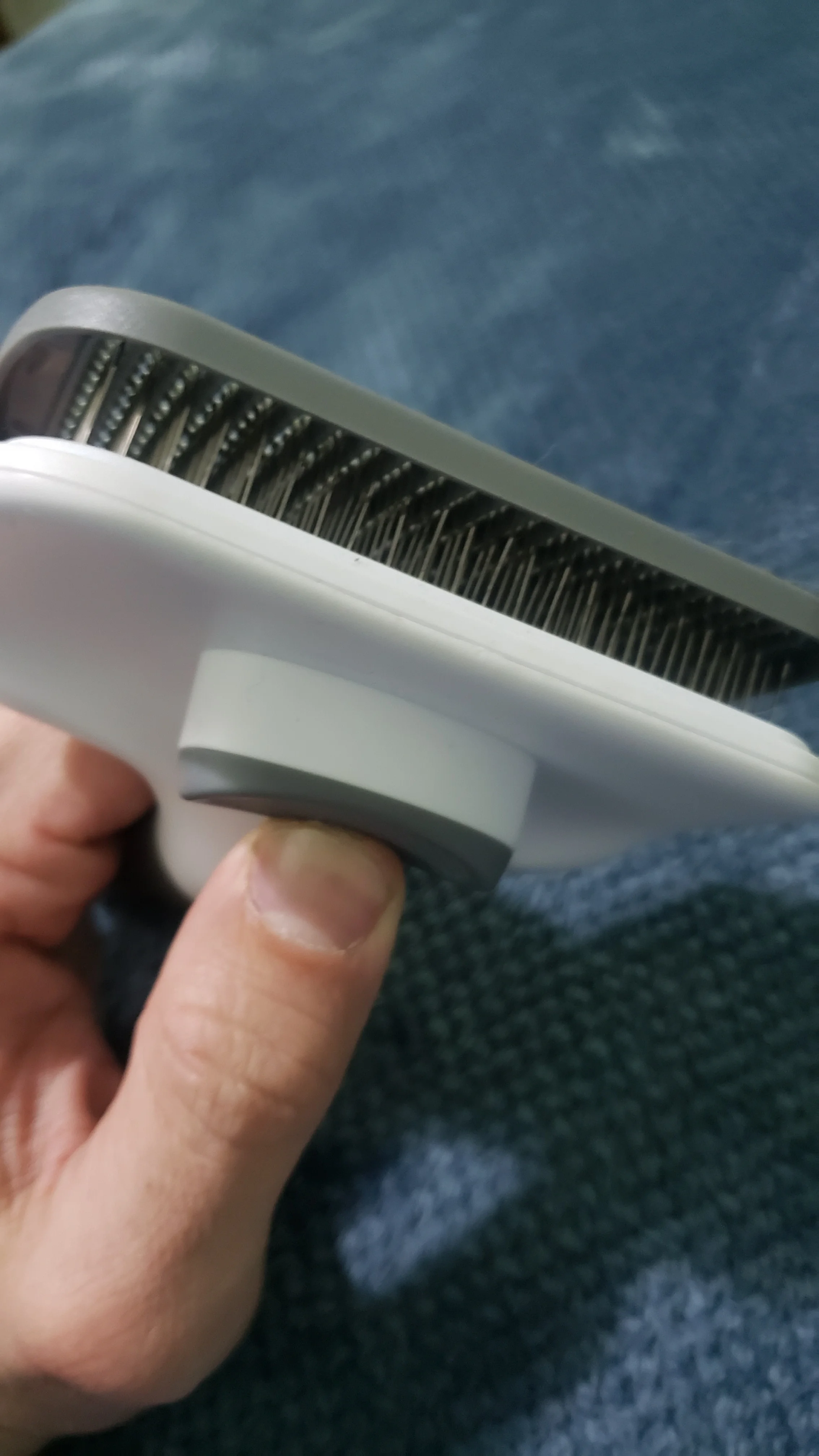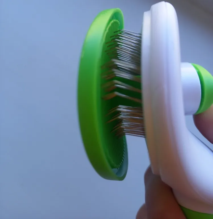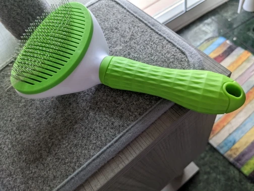 Массажка понравилась. Правда нужно несколько раз нажать, чтобы шерсть вывалилась. Мне понравилась, а коту не очень. У этой массажки очень тоненькие , как сказать, зубья… и, видимо, они царапают ему кожу. Поэтому давлю не очень. Ну и шерсти меньше. Ниже приведу картинки другой массажки, вот он ее обожает!