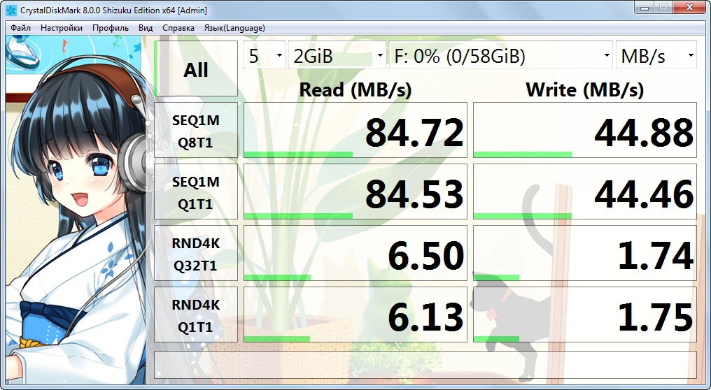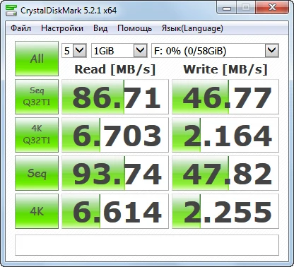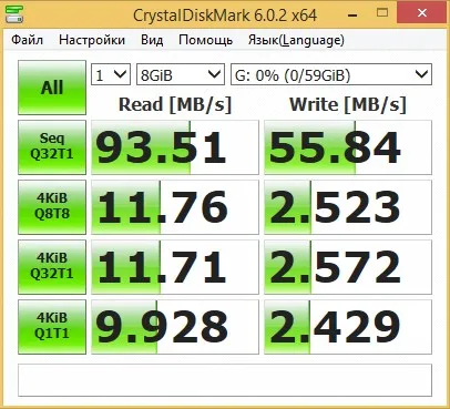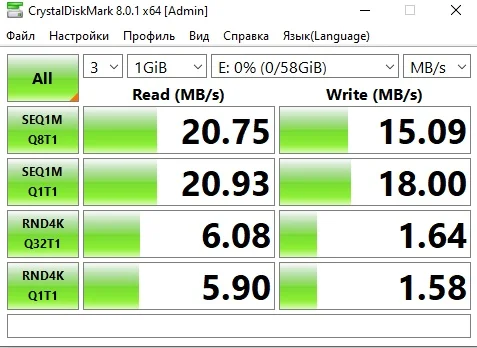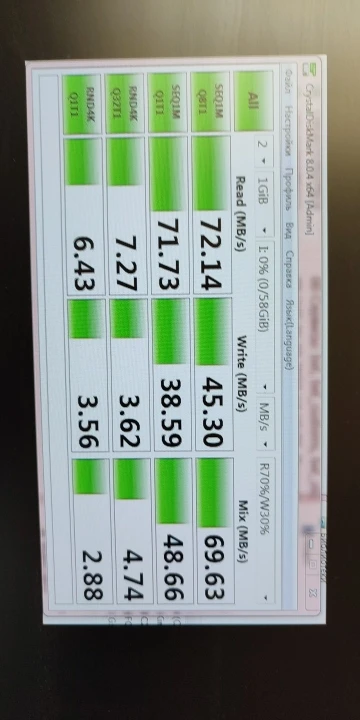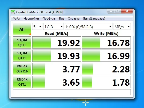 По тестам крусталдиск 19.92мб чтение и 16.78мб записи,аш2теств запись15.8мб и 18.5мб чтение, а объём 64гб вышел 59.6гб.Цена-скорость вне конкуренции!283рубля.Посмотрим как будет работать.Рекомендую.