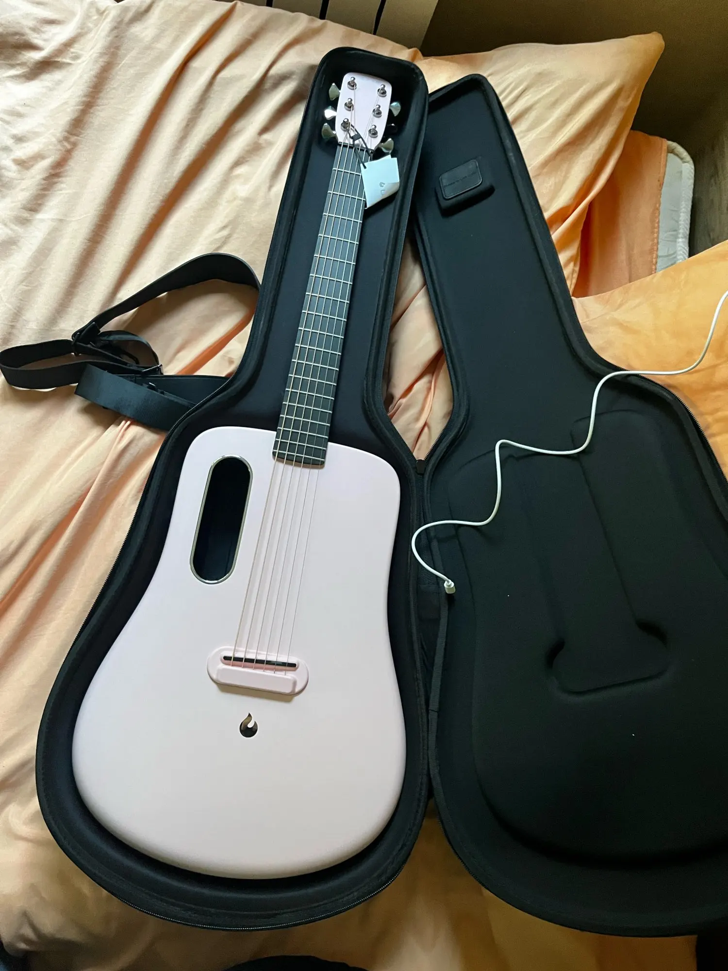 Гитара приехала за 10 дней с момента заказа и за 8 дней с момента отправки. Разобрался, как работает, звучит здорово. Немного подточил порожки, чтобы опустить струны, сменил их на Elixir 0,10, больно уж жесткие родные 0,12. Пока не разобрался с емкостью аккумулятора и длительностью работы, после получения весь день, не заряжая, играл, потом поставил на зарядку, залилось 1600 мАч. Звук и тембр интересные, но мне кажется, завалены в сторону басов. В комплекте чехол, комплект медиаторов и провод для зарядки (micro usb). Чехол добротно сделан, но не хватает кармана. Никаких аксессуаров не положить, просто некуда. Странная конструкция креплений для ремня, диаметр больше, чем отверстия у обычных ремней. Воткнуть обычный можно, но как будто он не по месту немного. Гитара неожиданно маленькая, после обычной приходится привыкать и искать новую удобную позу при игре сидя, задняя часть имеет скругление и гитара как будто соскальзывает. В целом – необычный инструмент, но очень нравится :-)