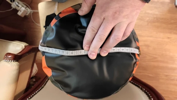 Размеры сумки на фото. Швы качественные, ровные, сварные, НЕ клей. Это позволяет рассчитывать, что сумка на солнце не начнет расползаться. Пробное купание показало, что свои функции выполняет. Но надо понимать, что для проф. использования не подойдет, т.к. защелки и карабины пластиковые, материал тонкий - думаю переноски кирпичей не выдержит, дно (черный круг) - нежный кожзам, который об камни быстро обдерется. Тем, кто на воде несколько раз за сезон - отлично. Для жизни в походе или лодке - поищите что-то более серьезное.Aleksey G. 4 февраля 2022