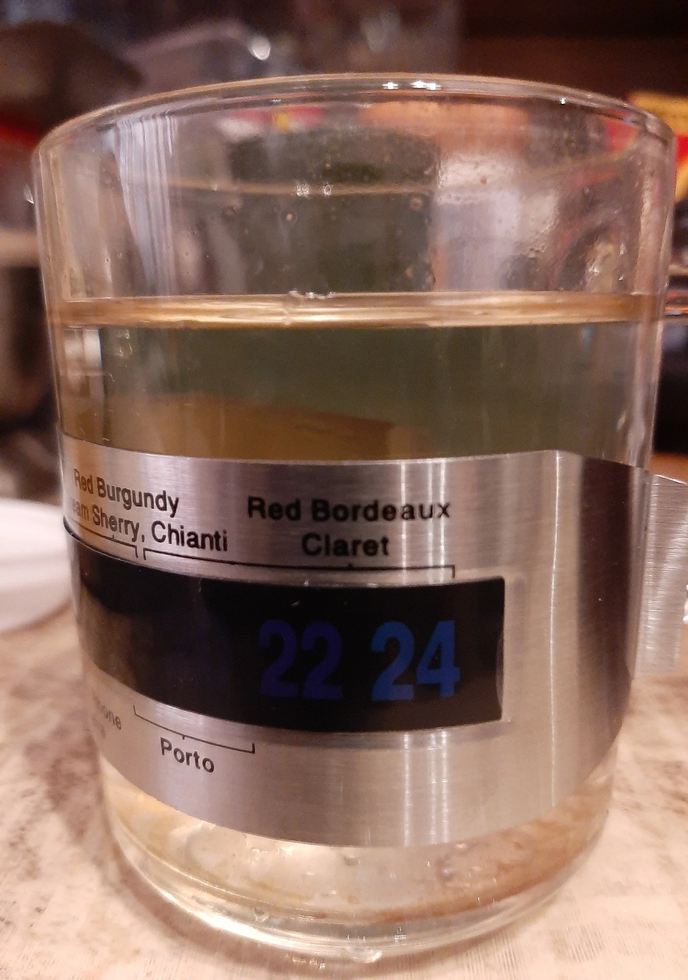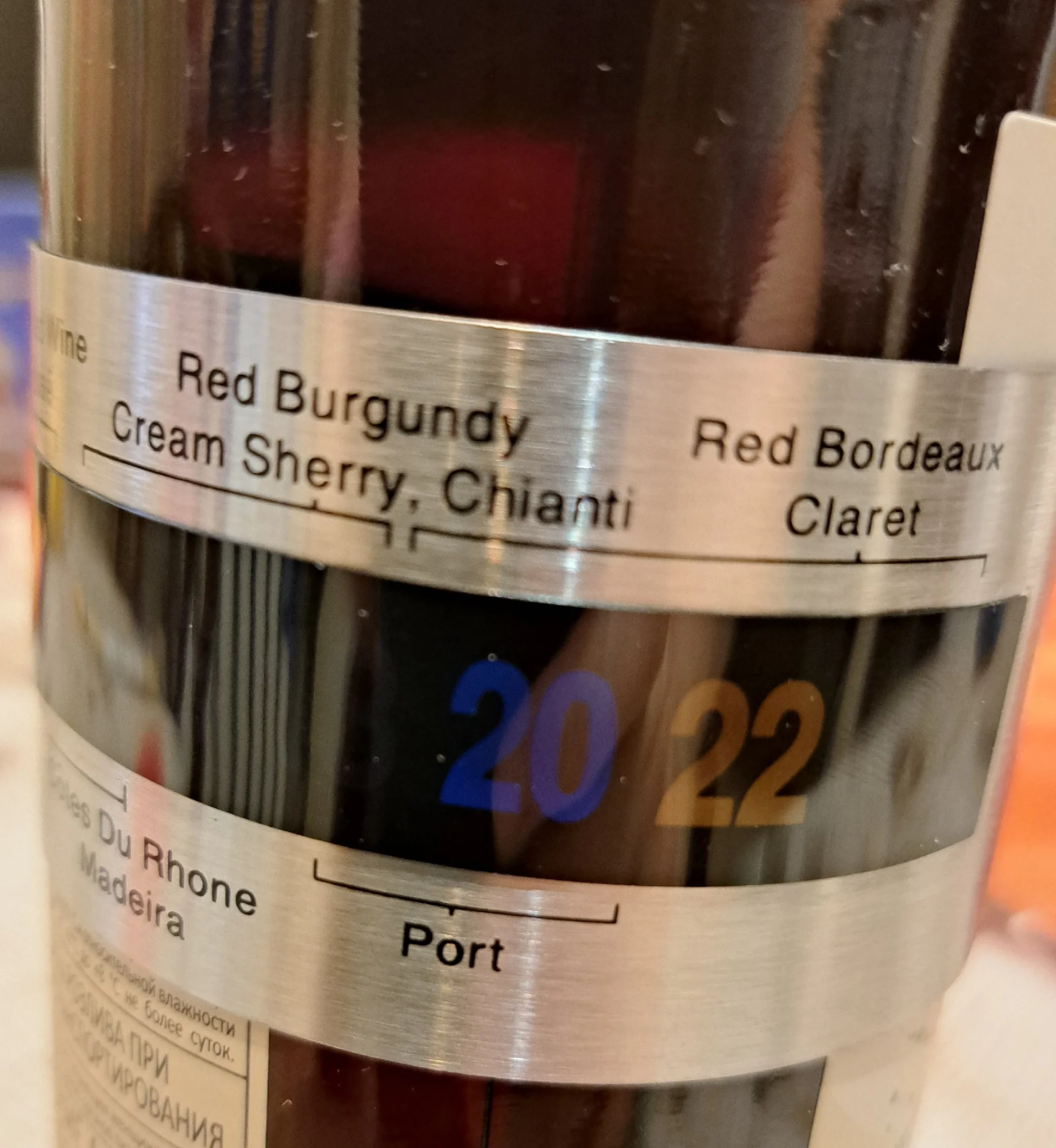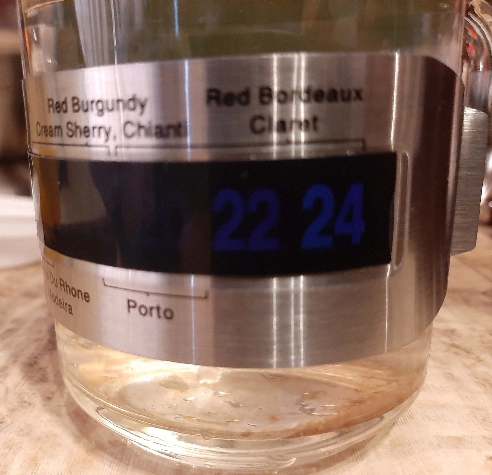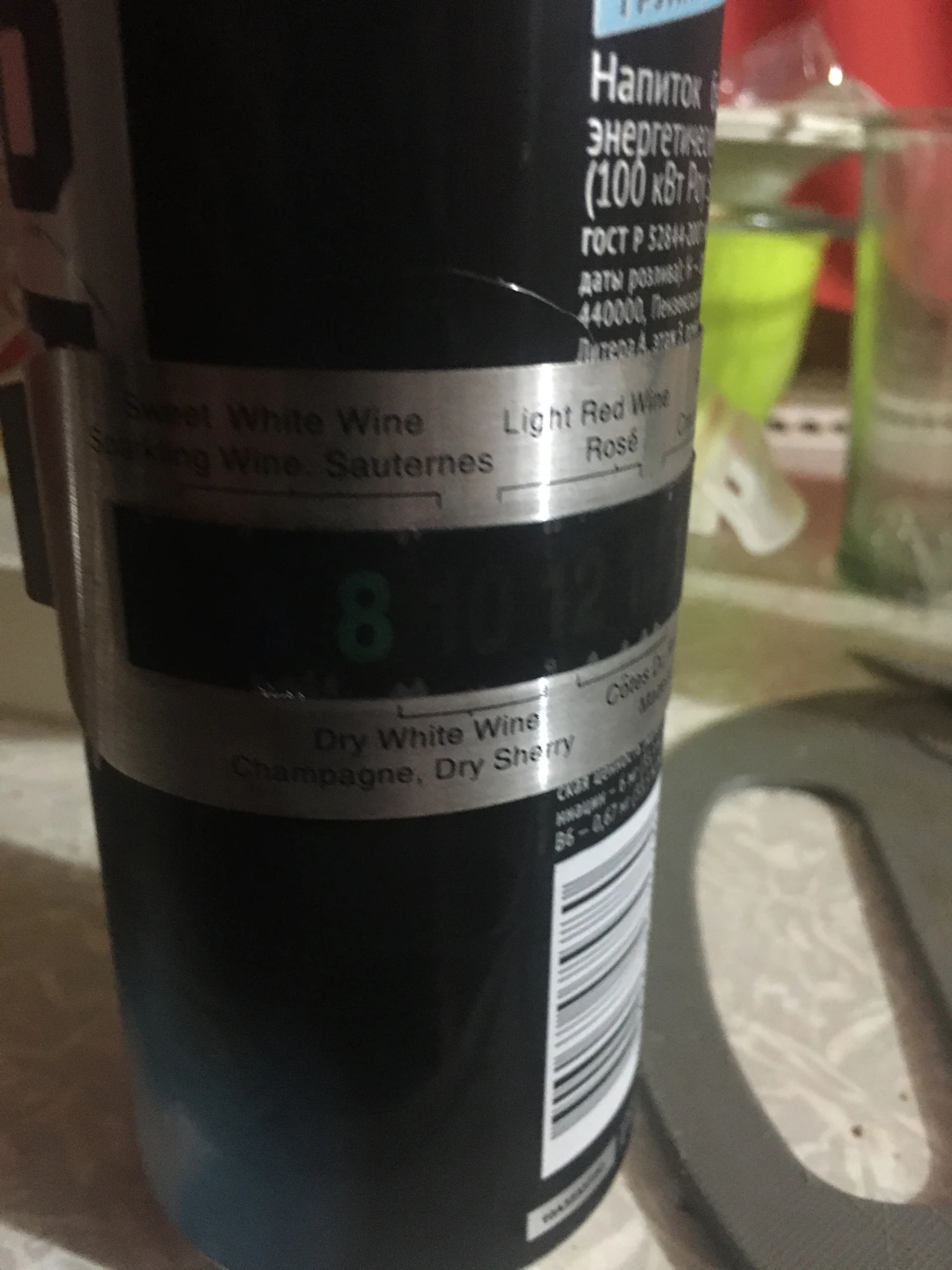 Температуру измеряет. Ряд цифирек, подсвечиваются в зависимости от температуры бутылки. На стандартную винную бутылку садится хорошо, достаточно плотно. Цифры, конечно бледноваты, но читаемо.