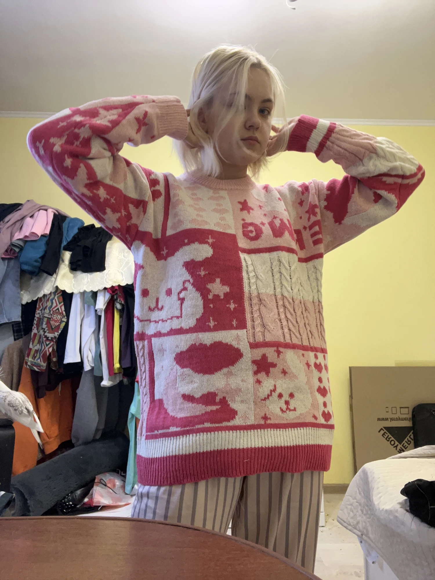 свитер, безусловно, красивый, но качество его... во-первых, свитер маленький. я заказала 2хл, а сидит как м, меня это очень расстроило. так еще и ткань неприятная, очень жесткая какая-то. еще и брак потом нашла. не знаю, почему люди пишут про хорошее кач-во, может они не трогали хороших свитеров или, может, это просто мне не повезло