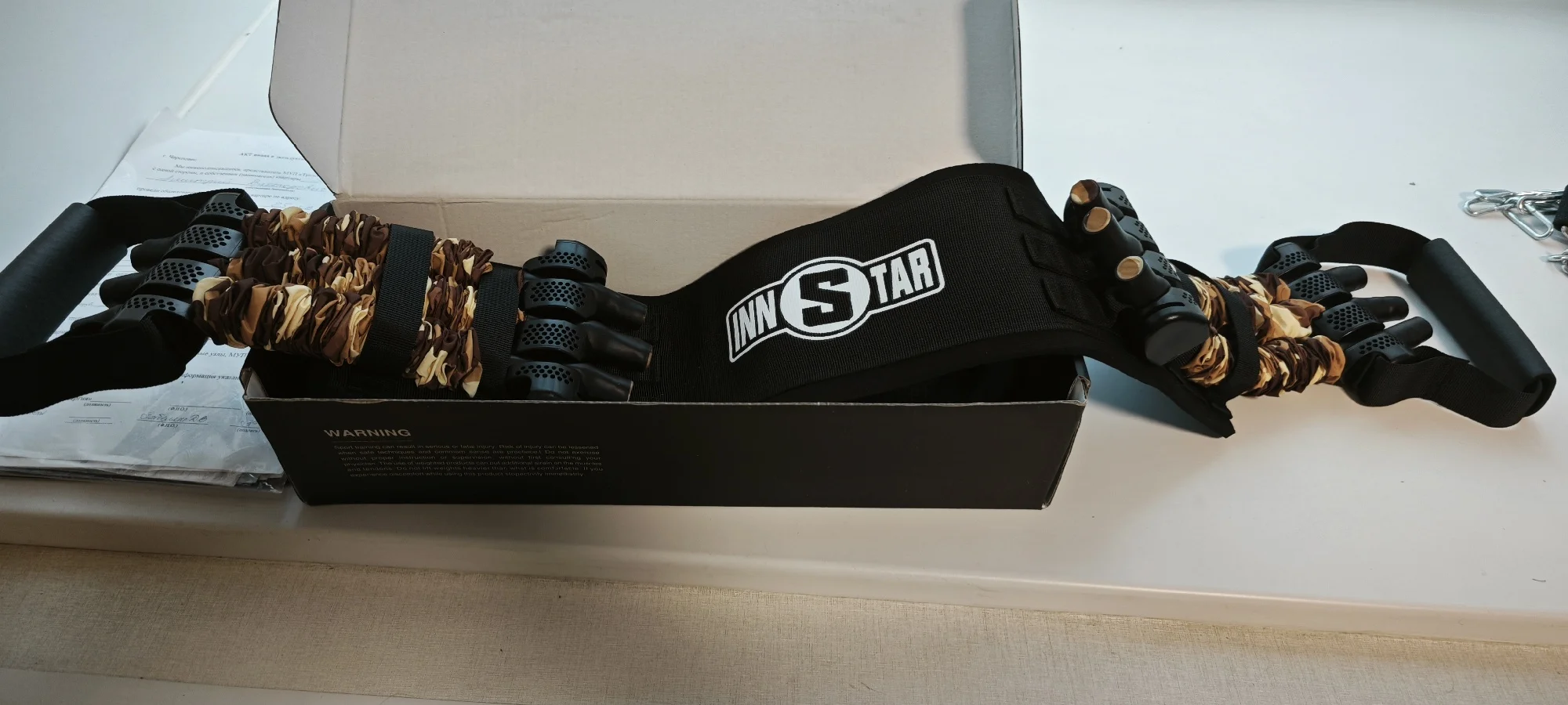 Классная штука, все работает как видеоролике, по весу хз, занимаюсь с 2 резинками, ну килограмм 50 выдает, 3 не ставил, заказывал 90кг, упаковано в 2 коробки в комплекте сумка для эспандера и он сам, в качестве грифа использую обыкновенную 32ю трубу