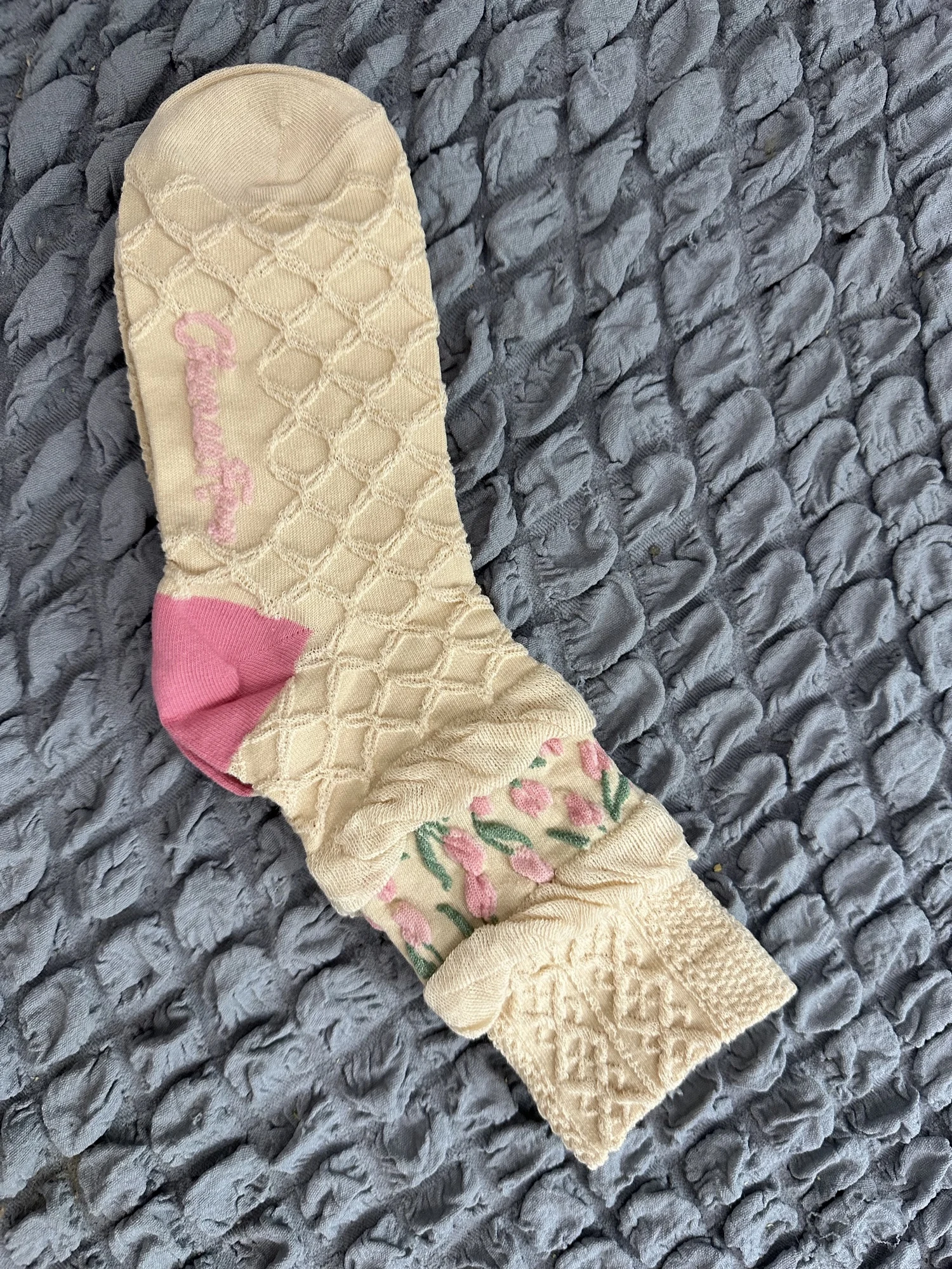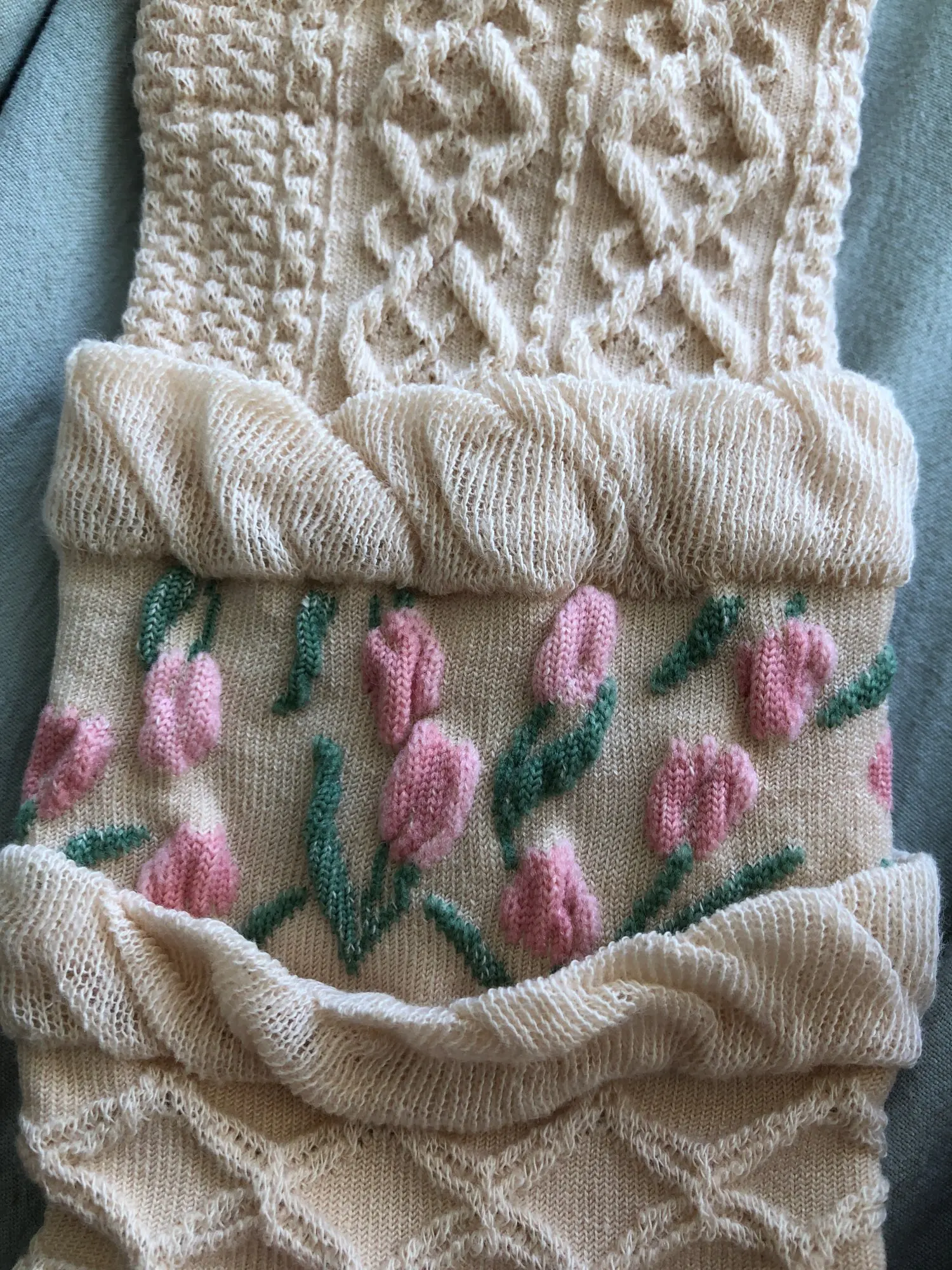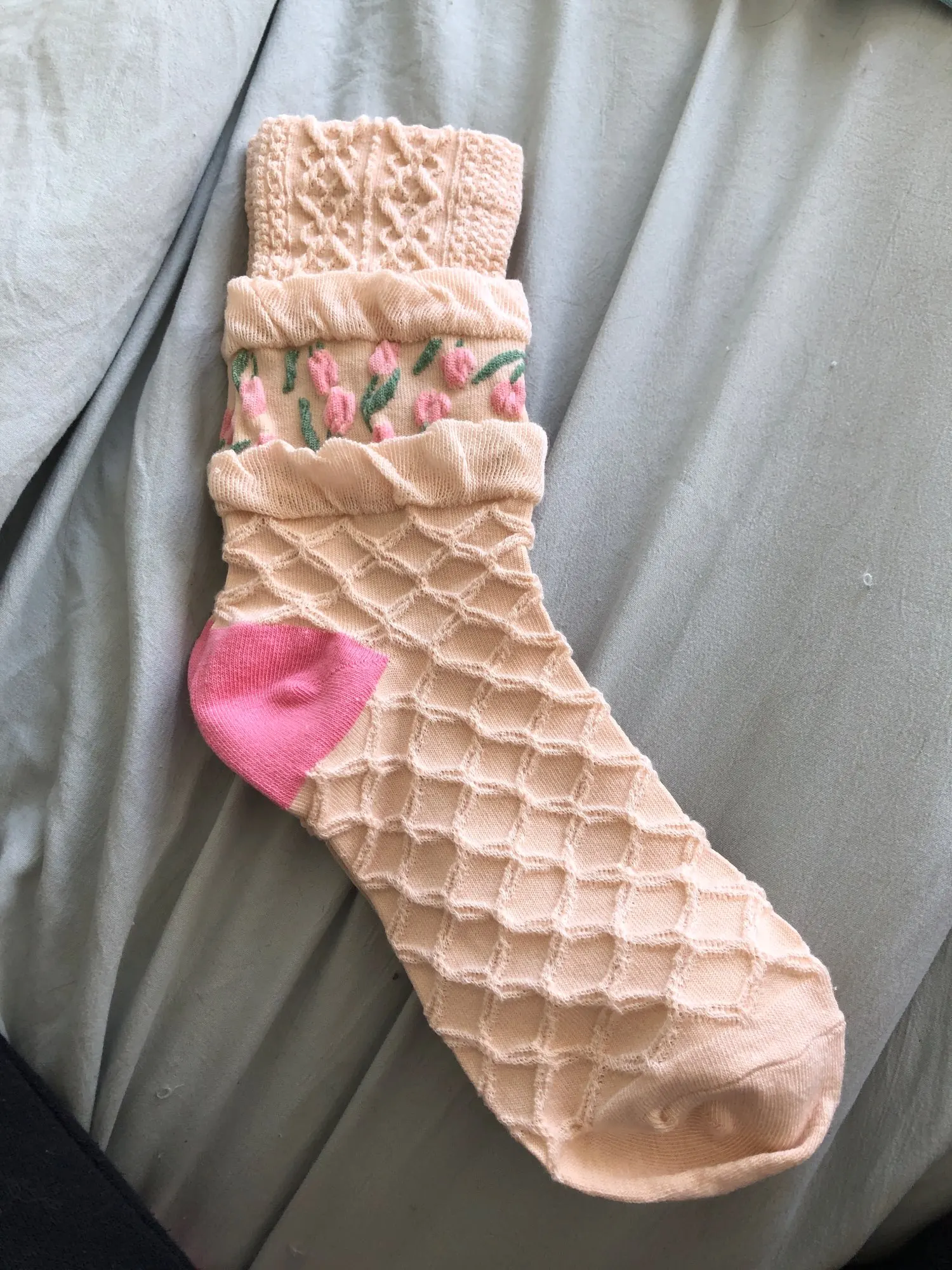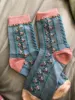 Носки очень милые и почти такие же, как на фото. Фотографии делают их похожими на толстые вязаные носки, когда они на самом деле немного тонкие, так что имейте в виду. Отлично подходит для весны. Очень красивый и нежный. Я просто влюблен в них!