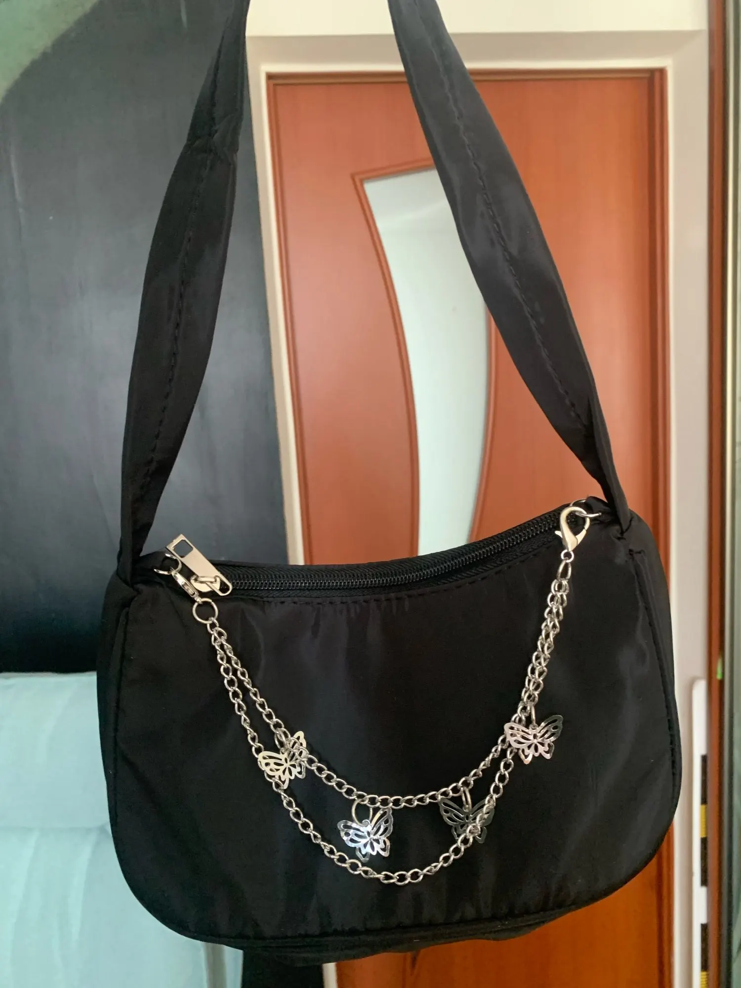 сумка пришла очень классная, с продавцом не общалась, пришла раньше чем было указано, сначала товар стоял на месте и боялась что не прийдет, но пришел раньше чем нужно) видела отзыв где писали что внутри непонятная ткань, но там все ок! бабочек легко сломать(если трогать их специально), внутри пахнет металлом, для тех кто хочет маленькую сумочку в которую вмещается только телефон, ключи, кошелек и ещё что-то.. это самое то, рекомендую!!????