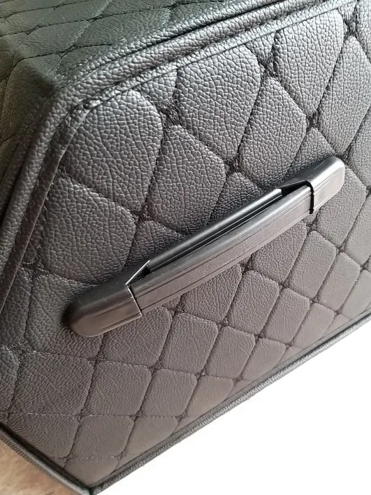 Качество пошива отличное.Липучки держат.Боковые ручки,удобные.Под кож замом,картон.На днище не хватает пластиковых подкладок, дно будет царапаться и рваться.Защёлка монтирована не качественно.В целом доволен.Рекомендую.