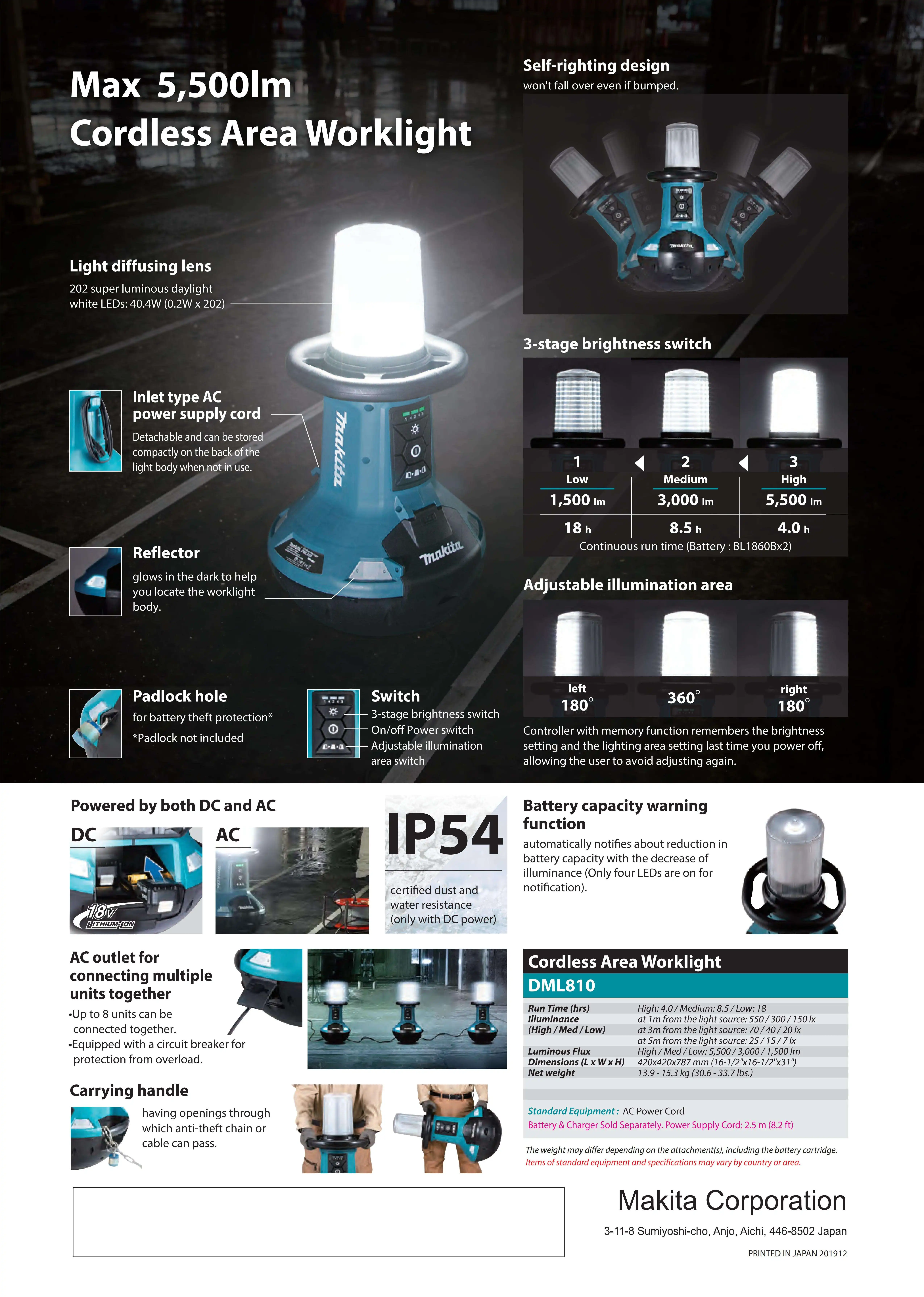 Makita DML810 18 в LXT беспроводной AC 220 лм светодиодный Wobblelight промышленное рабочее освещение в профессиональные литиевые электроинструменты