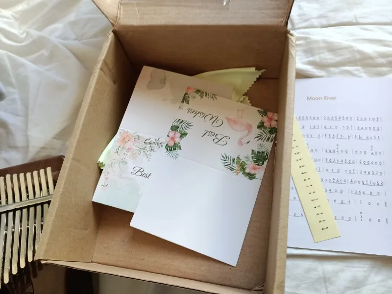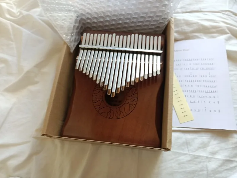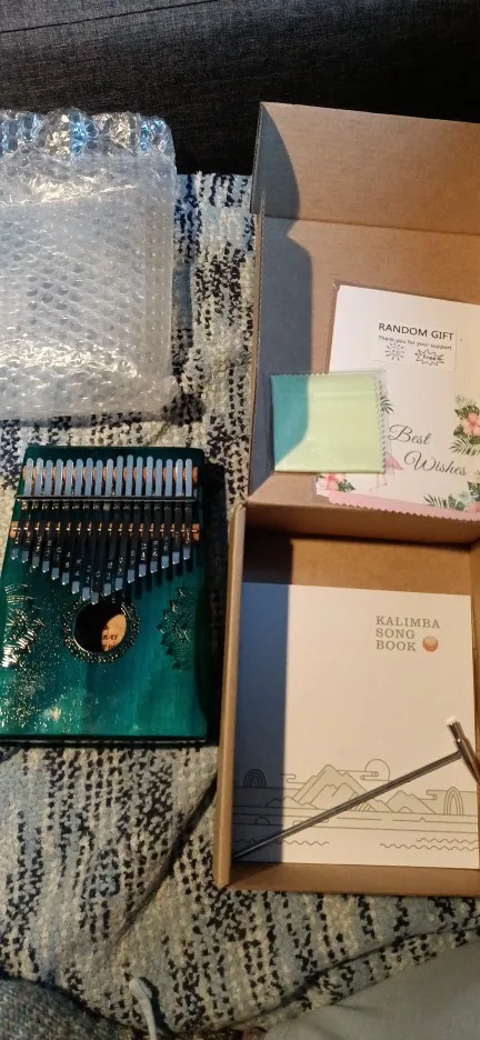 заказала калимбу 08.11, а забрала из пункта выдачи уже 14.11. стоимость 1275 рублей. посылка пришла хорошо упакована, без повреждений. в комплекте помимо самого инструмента есть молоточек для настройки, салфетка для ухода, а так же инструкция на английском языке с нотами некоторых композиций. всё достаточно понятно написано, указаны даже конкретные приложения - тюнеры. так что справится даже новичок. после настройки звучали все ноты, достаточно звонко и красиво. инструмент изумительный, легко подбираются знакомые мелодии. получила небольшой подарок - открытки и дополнительную салфетку, мелочь, а приятно. рекомендую товар и продавца!Anna P. 15 ноября 2022